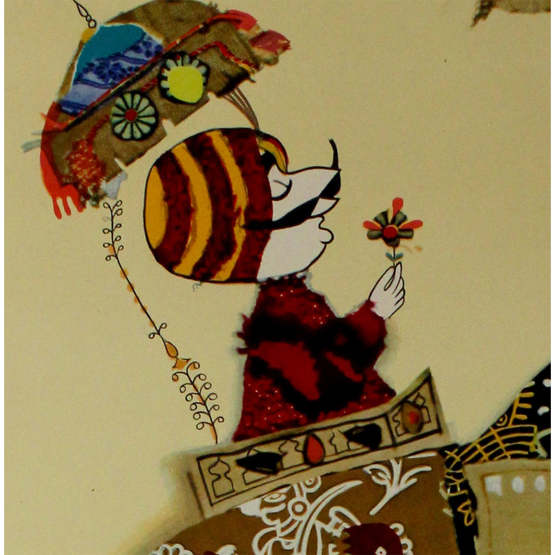 Au centre de la composition trône un éléphant majestueux, orné de textiles raffinés et de motifs tribaux, entouré d'une procession de musiciens, de danseurs et de cavaliers. Chaque figure est dessinée dans un style ludique, évoquant le collage, qui rend hommage aux miniatures traditionnelles du Rajasthan et à l'art populaire, tout en séduisant le regard moderne du touriste international. Le fond, d'un jaune désertique doux, évoque la chaleur du climat indien et la palette chromatique de ses paysages.