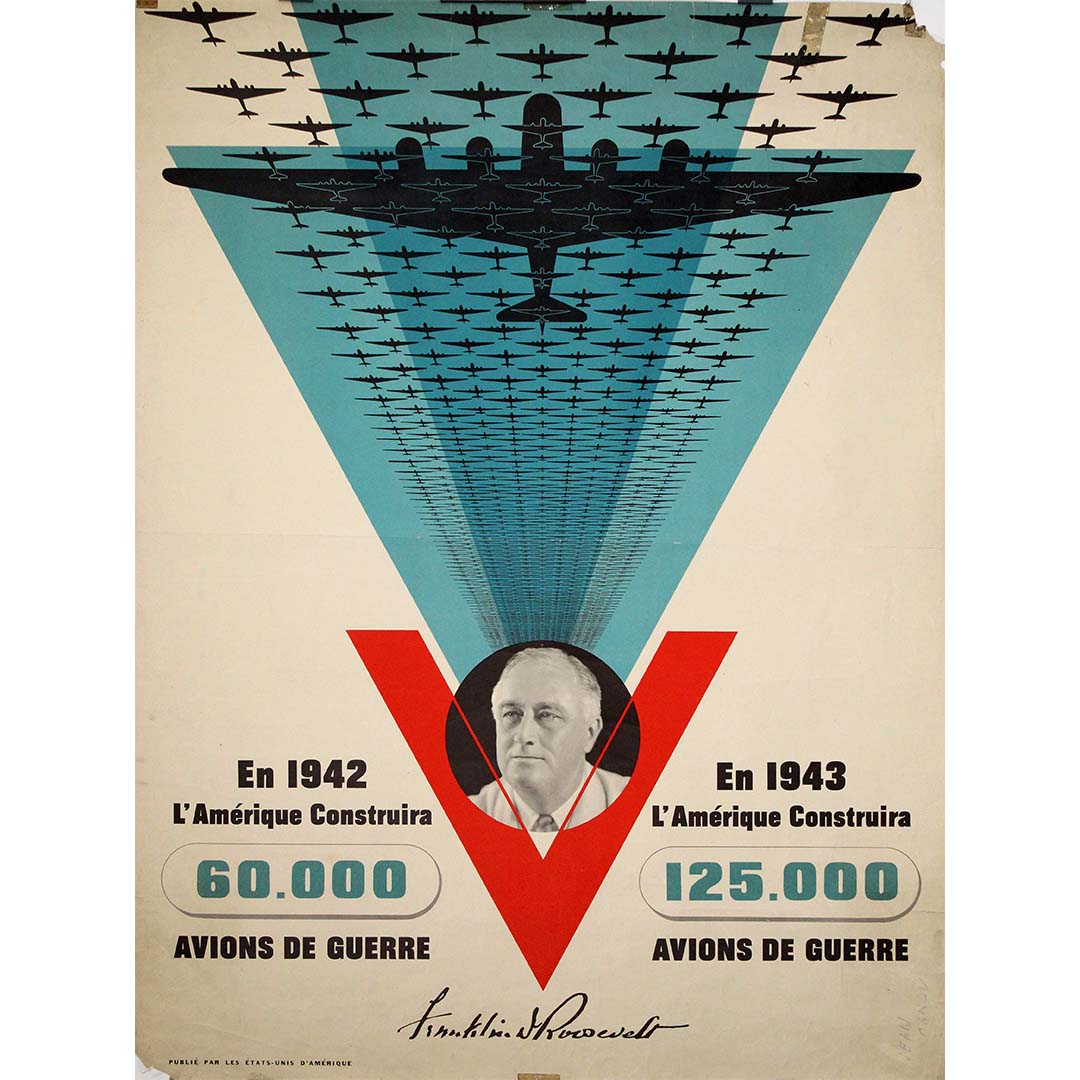 Jean Carlu, graphiste influent, a exploité le minimalisme et l'abstraction dans cette affiche pour un impact maximal. L'utilisation du « V » et du portrait de Roosevelt fait appel aux dimensions patriotiques et psychologiques essentielles à l'unification du moral public. La palette de couleurs bleu et rouge souligne le caractère nationaliste, tandis que les lignes précises et répétitives des avions créent une impression de profondeur et de force infinie.