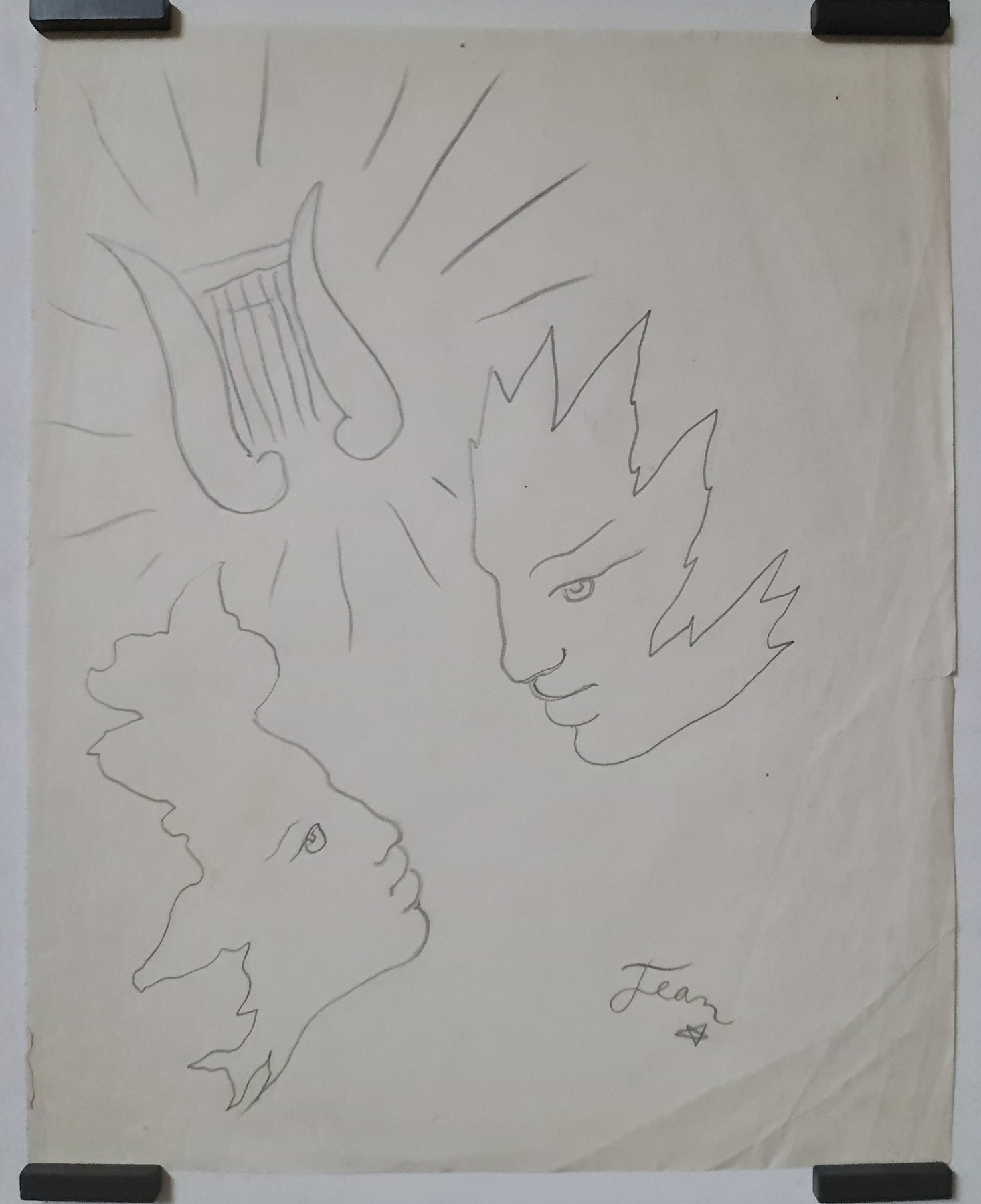 Le dessin de Jean Cocteau, « Le Couple et la Lyre », est un chef-d'œuvre poétique qui unit l'amour et la musique. Cette œuvre, aux lignes minimalistes, saisit avec beauté deux figures enlacées, dessinant la forme d'une lyre – symbole profond de l'imbrication de l'amour et de l'art.