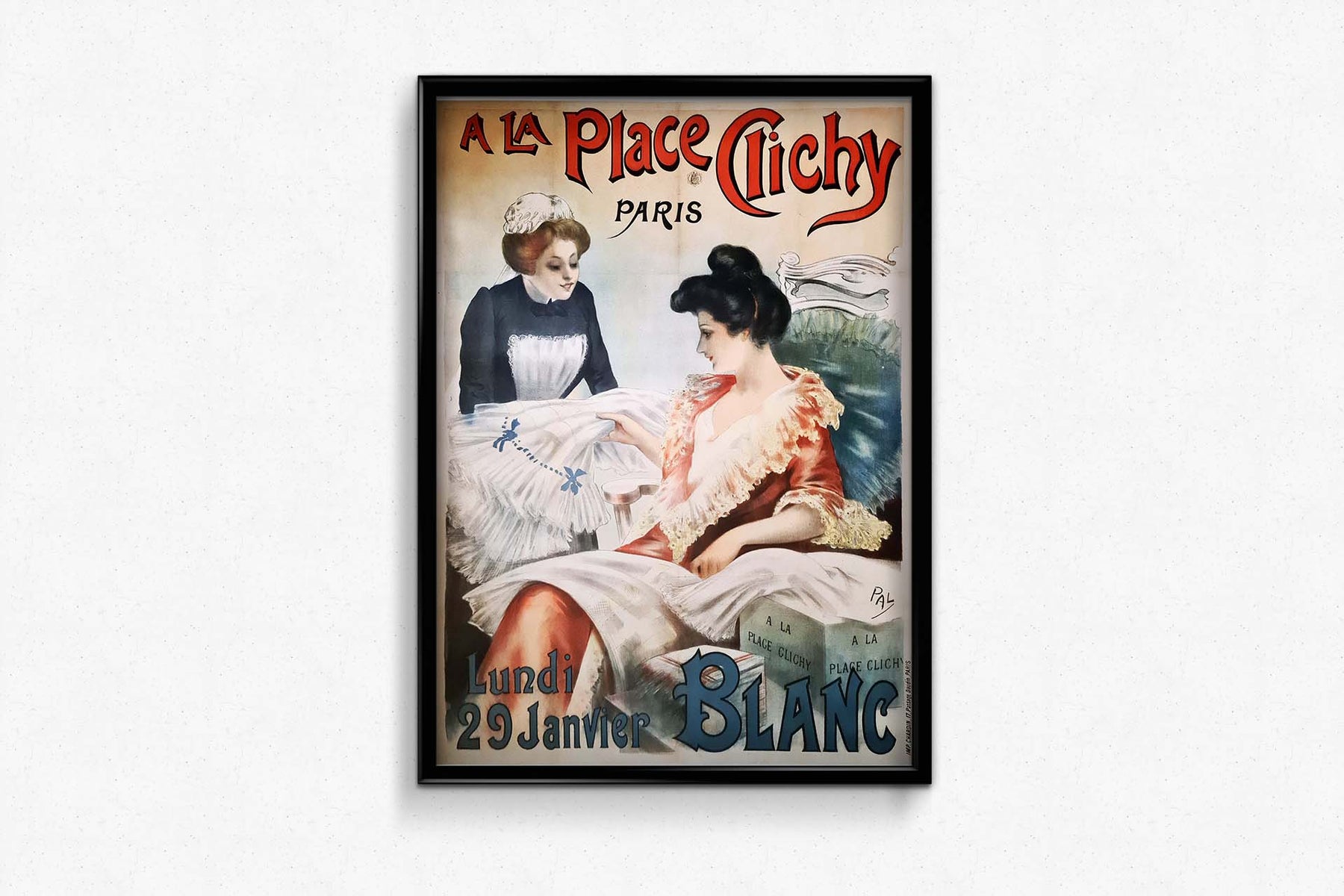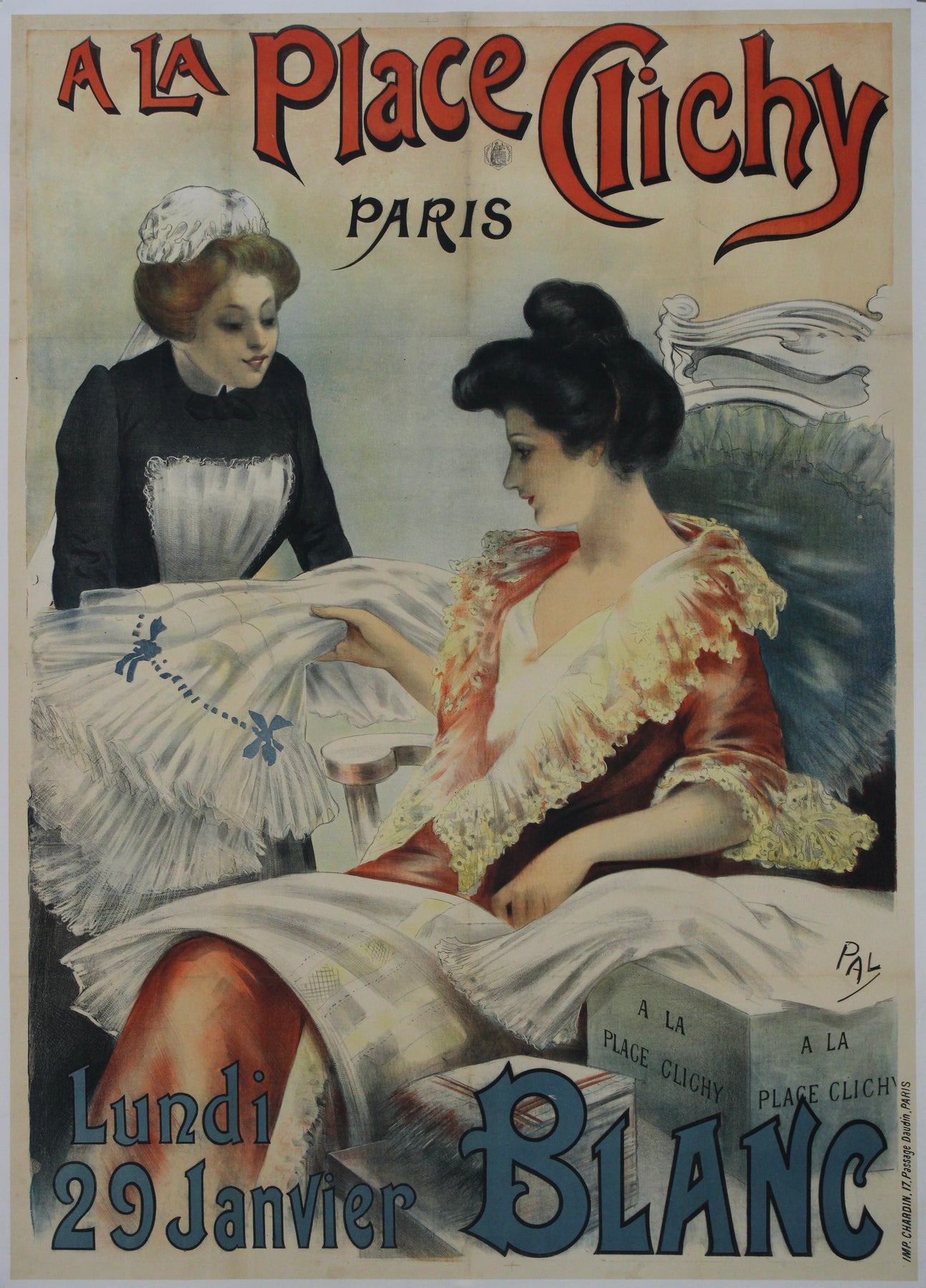 Magnifique affiche originale du début du XXe siècle, éditée par PAL. Cette charmante scène représente une femme élégante et parfaitement à l'aise en train de choisir une robe.