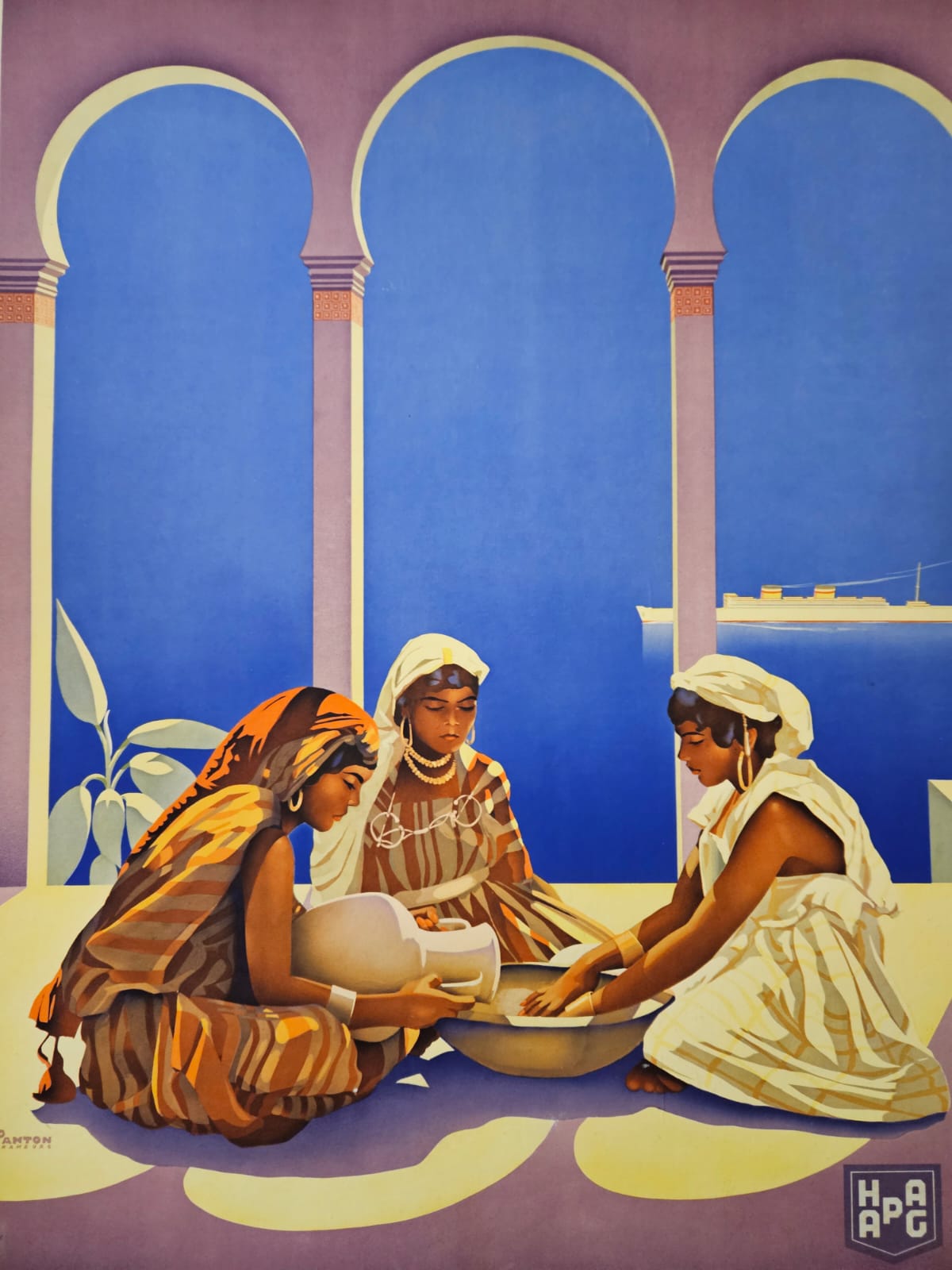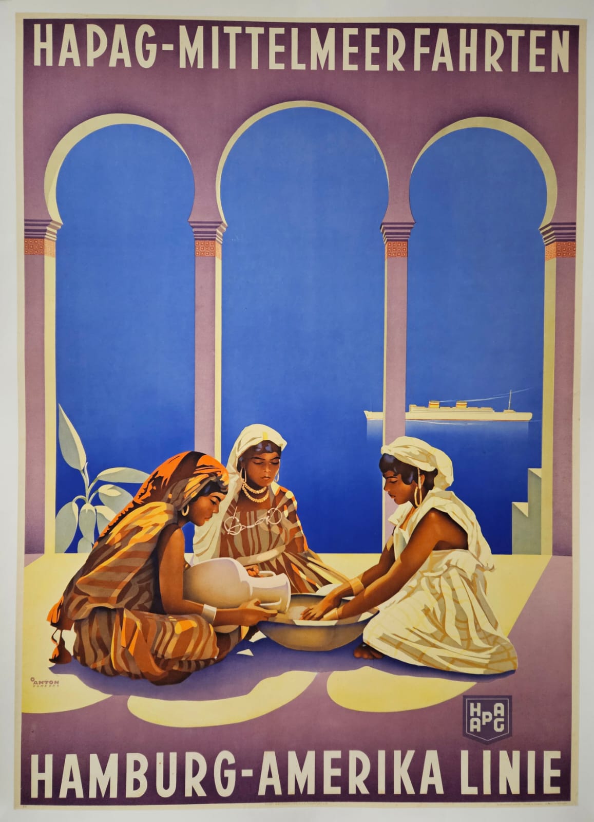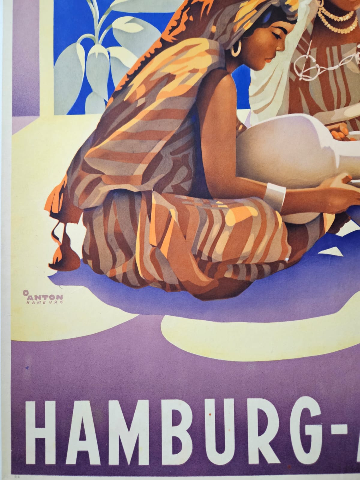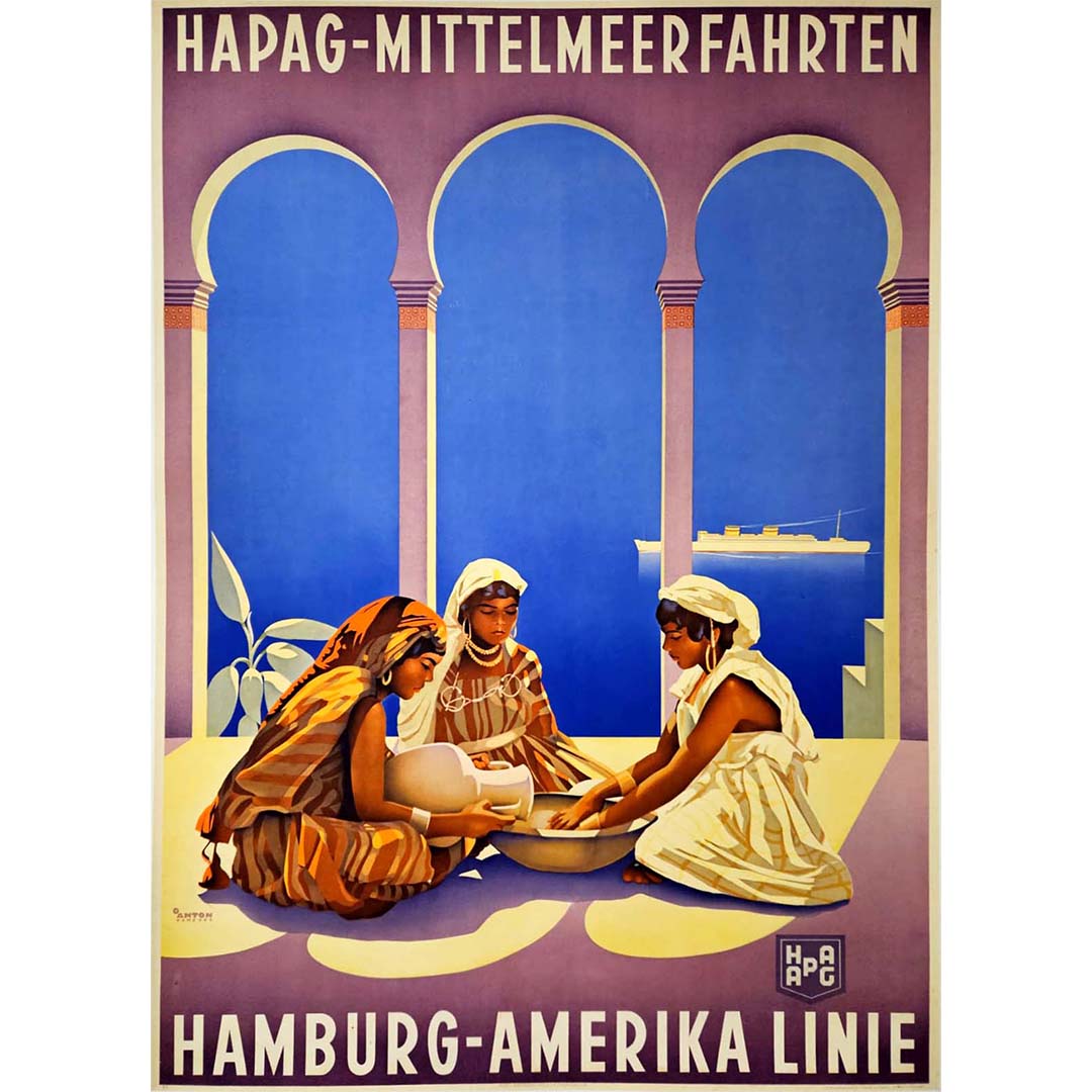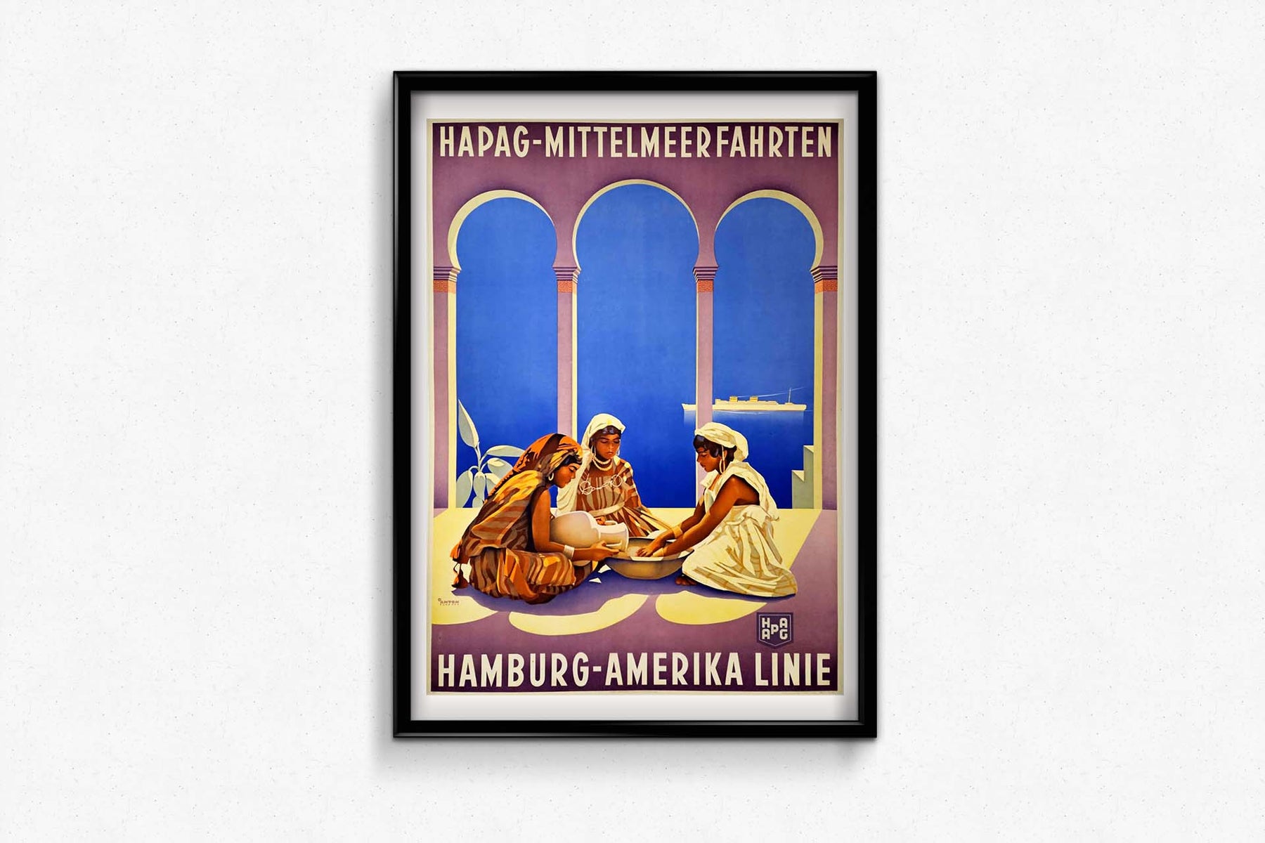 La Hamburg-Amerika Line était une compagnie maritime transatlantique fondée à Hambourg, en Allemagne, en 1847 et active jusqu'en 1970. Cette affiche de 1935 fait la promotion d'une croisière en Méditerranée proposée par la Hamburg-Amerika Line.