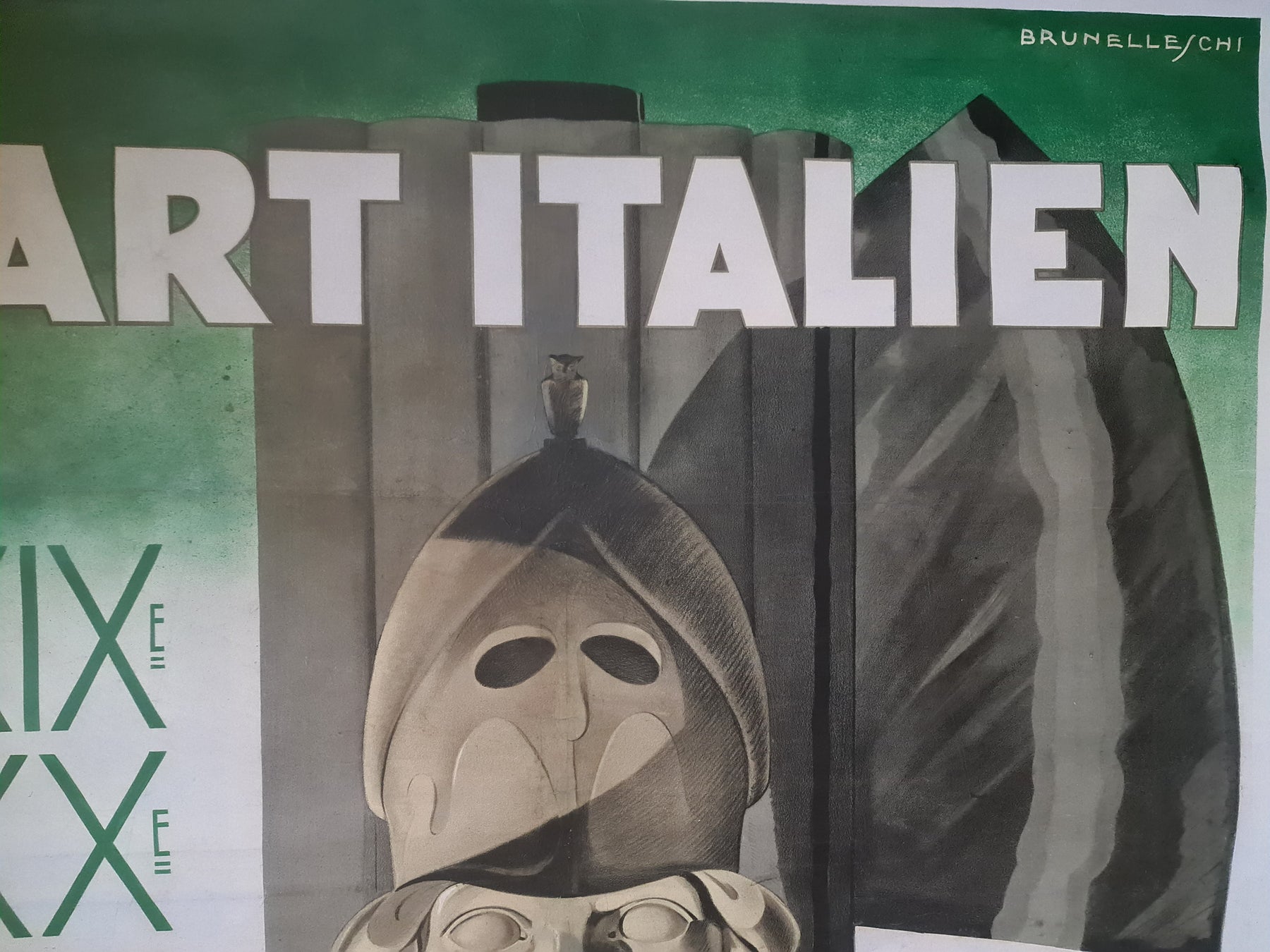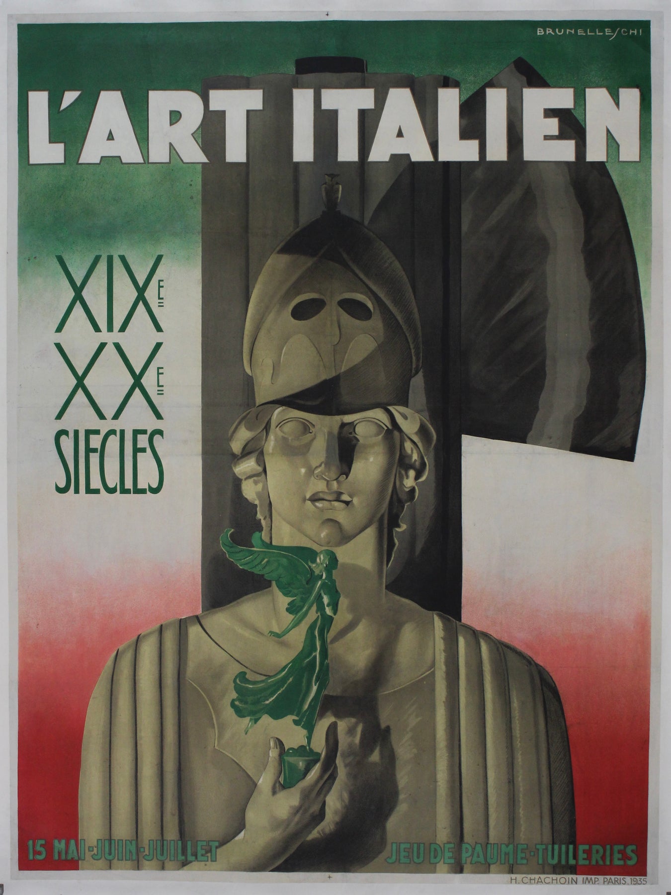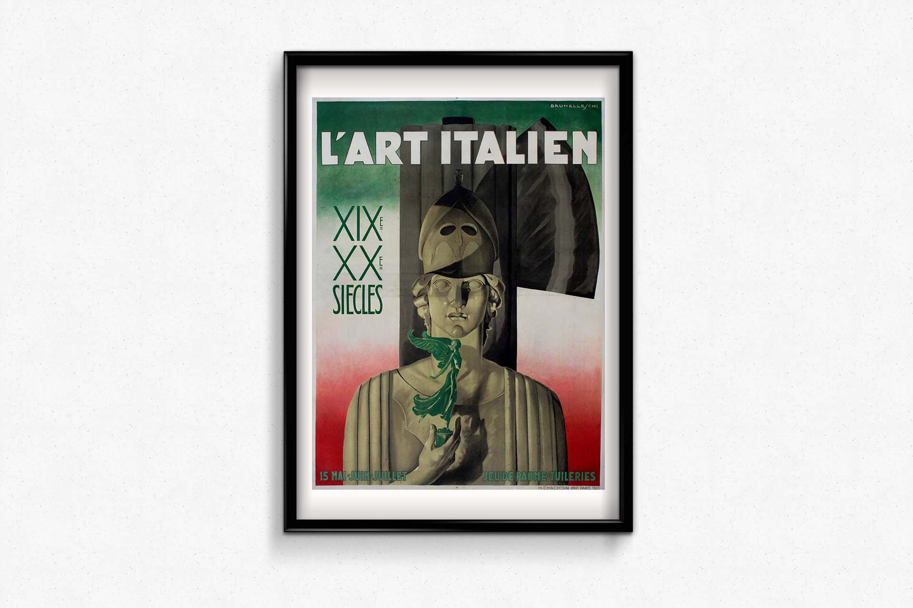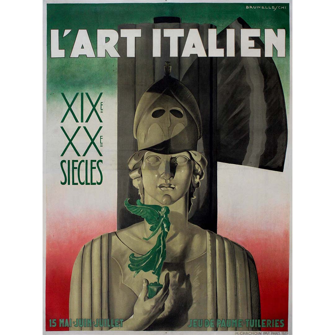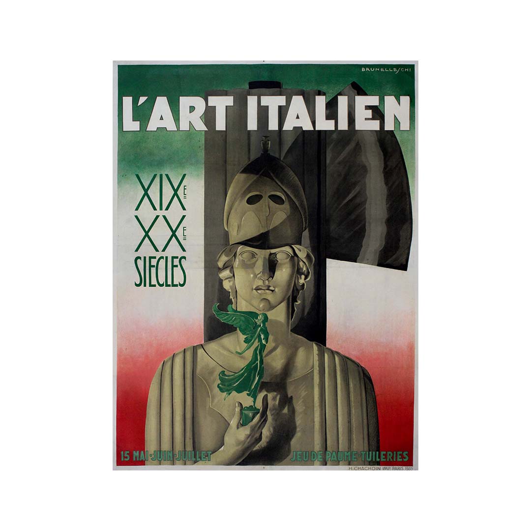 En 1935, l'artiste italien Brunelleschi Umberto créa cette affiche originale pour « L'art italien XIXe XXe siècles », une célébration de l'art italien des XIXe et XXe siècles. Telle une machine à remonter le temps, cette affiche transporte le spectateur à travers les âges, où les trésors artistiques de l'Italie sont mis en valeur avec respect et élégance.