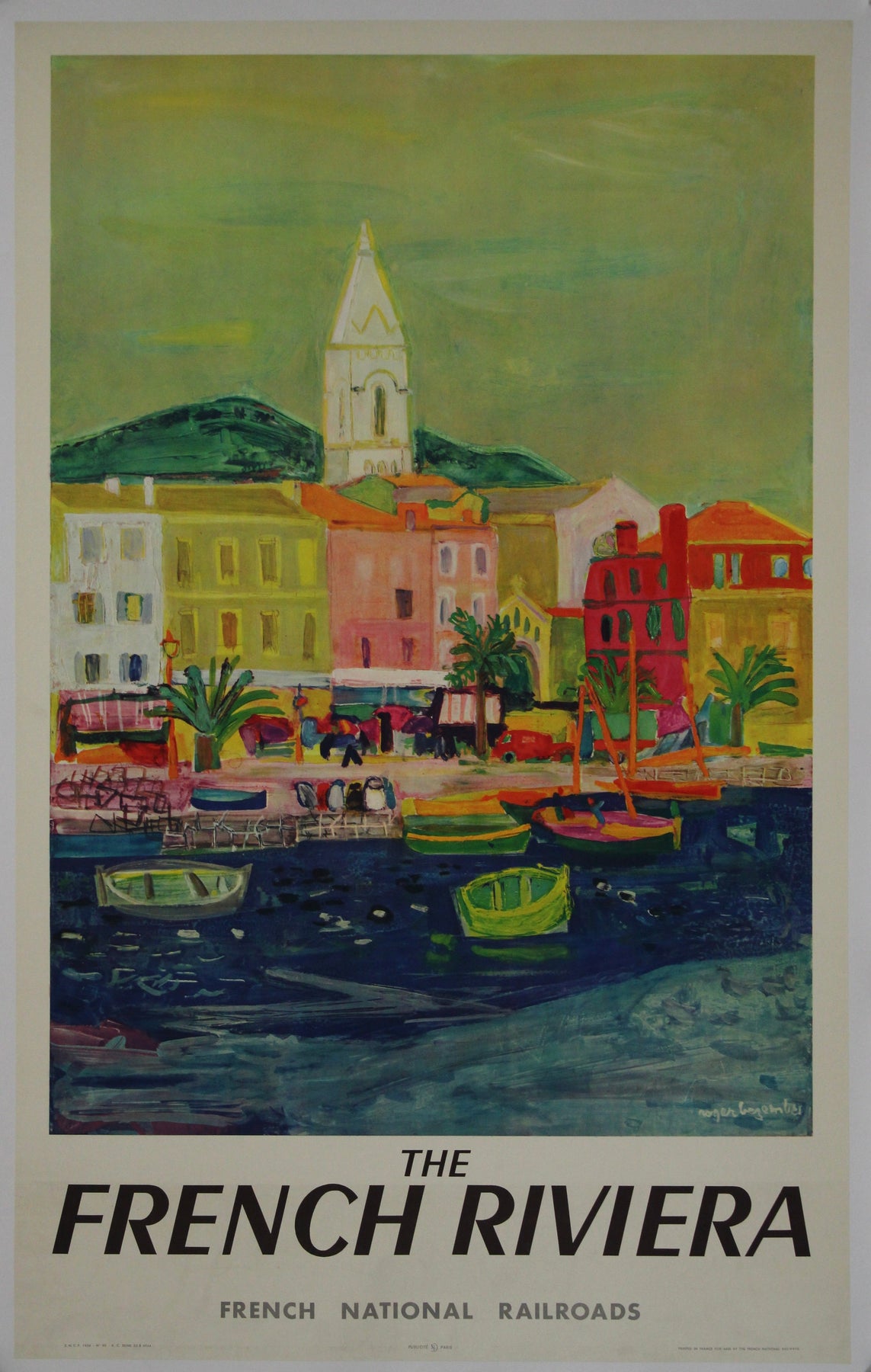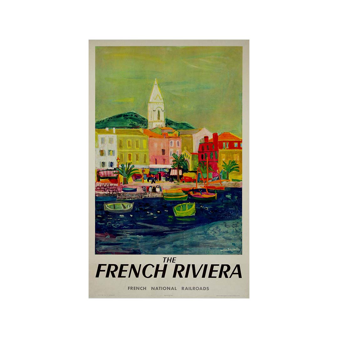 Plongez dans l'univers ensoleillé de la Côte d'Azur à travers l'objectif de l'envoûtante affiche de Roger Bezombes de 1956, un chef-d'œuvre rayonnant créé pour la SNCF. Ce joyau vintage nous invite à un voyage visuel qui capture la magie de la Côte d'Azur et la promesse de voyages sans encombre avec la SNCF.