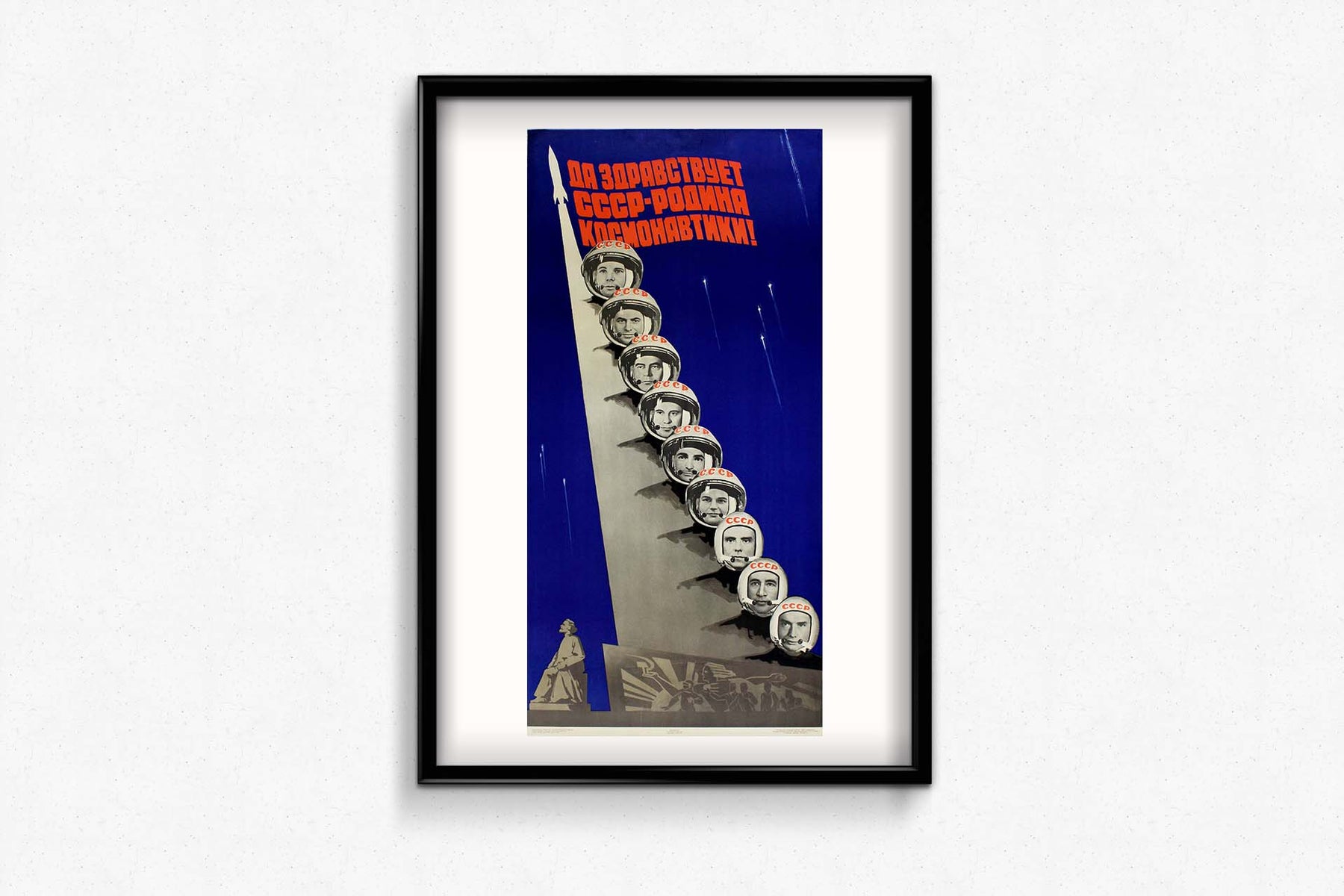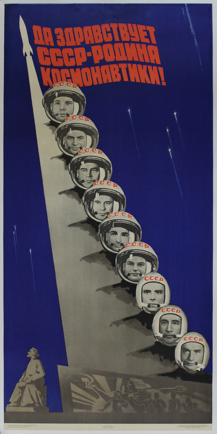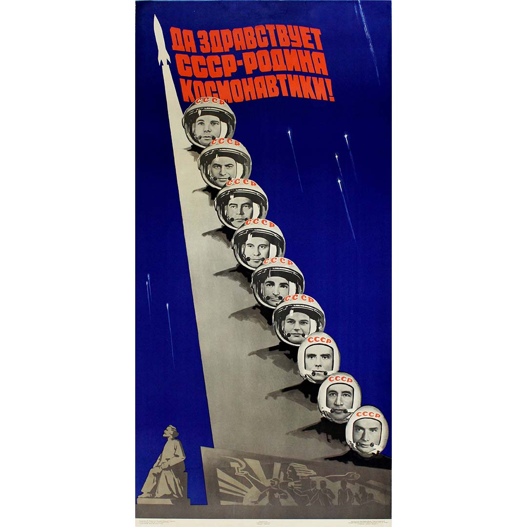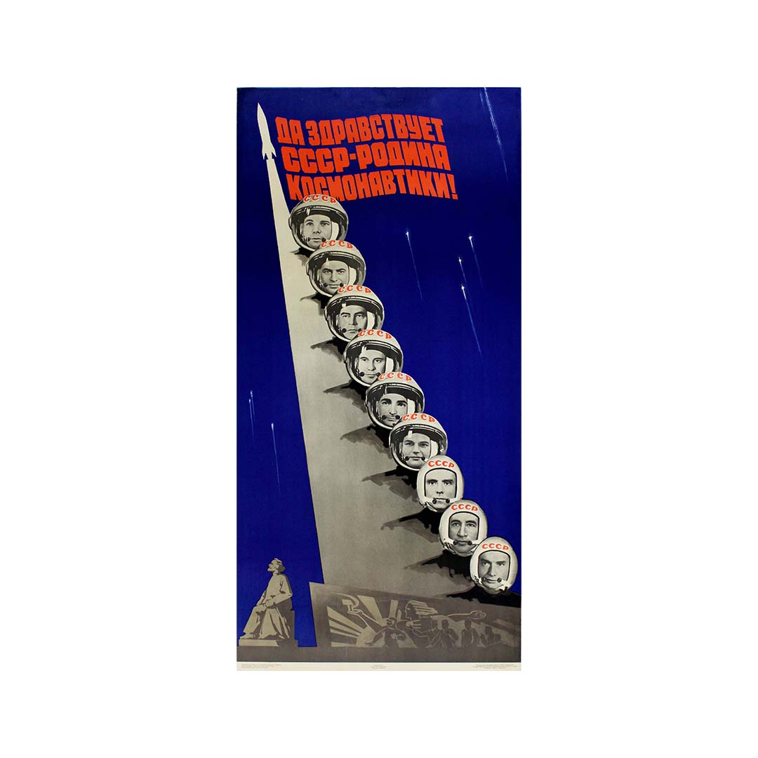 Cette affiche rend hommage aux exploits humains et à la conquête de l'espace. Elle illustre le rôle pionnier de l'Union soviétique dans l'exploration spatiale, du lancement du premier satellite artificiel, Spoutnik, à l'envoi du premier homme dans l'espace, Youri Gagarine. La figure du cosmonaute incarne le courage et la détermination de ceux qui ont bravé les limites de la Terre.