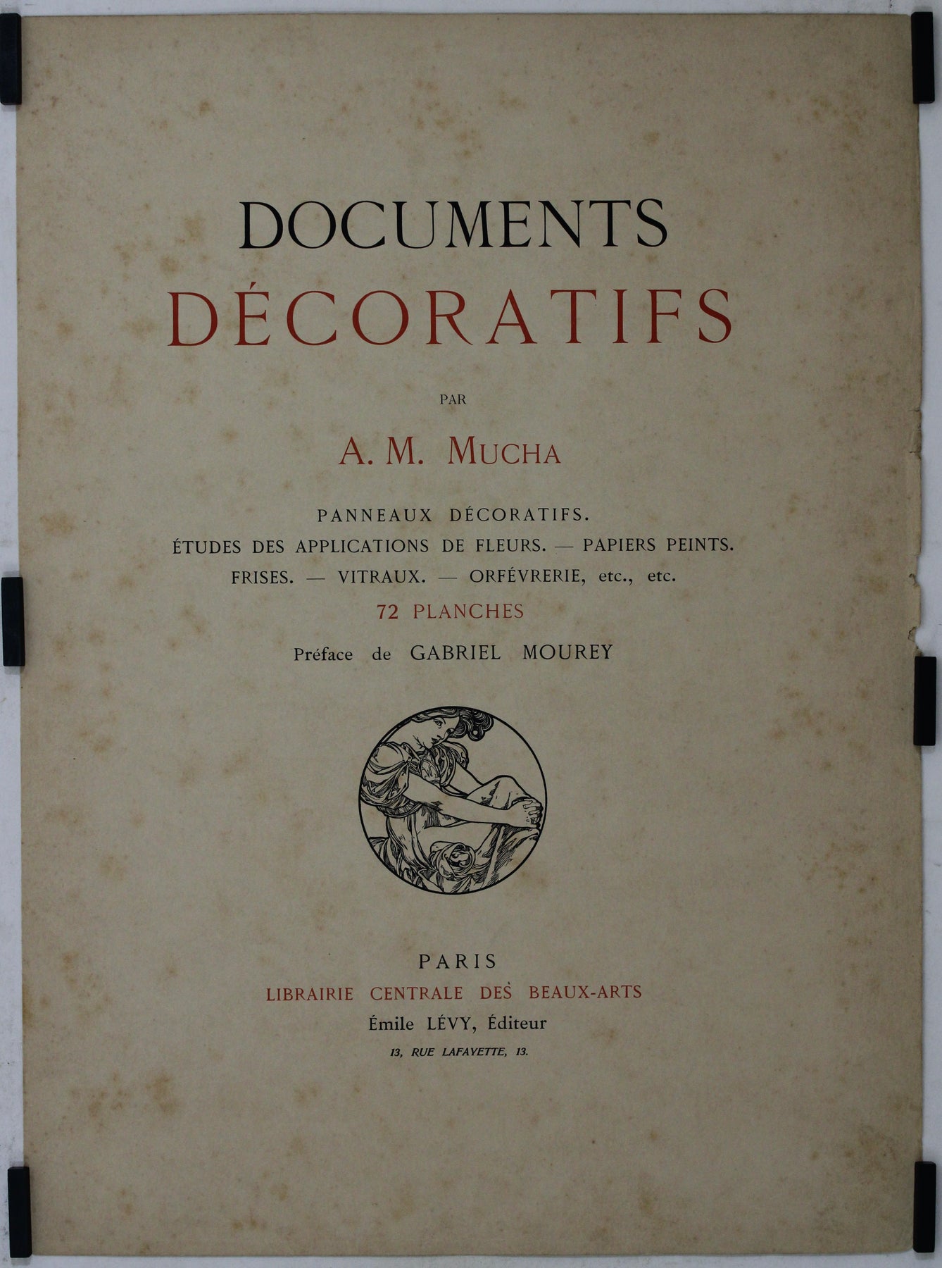 Le nom d'Alphonse Mucha brille comme celui d'un artiste visionnaire qui a marqué de son empreinte indélébile l'esthétique du début du XXe siècle. En 1902 paraît « Documents décoratifs », ouvrage fondamental édité par Émile Lévy et imprimé à Paris, cœur artistique du monde. Ce recueil d'estampes exquises témoigne du style singulier de Mucha et de son influence considérable sur les arts décoratifs.