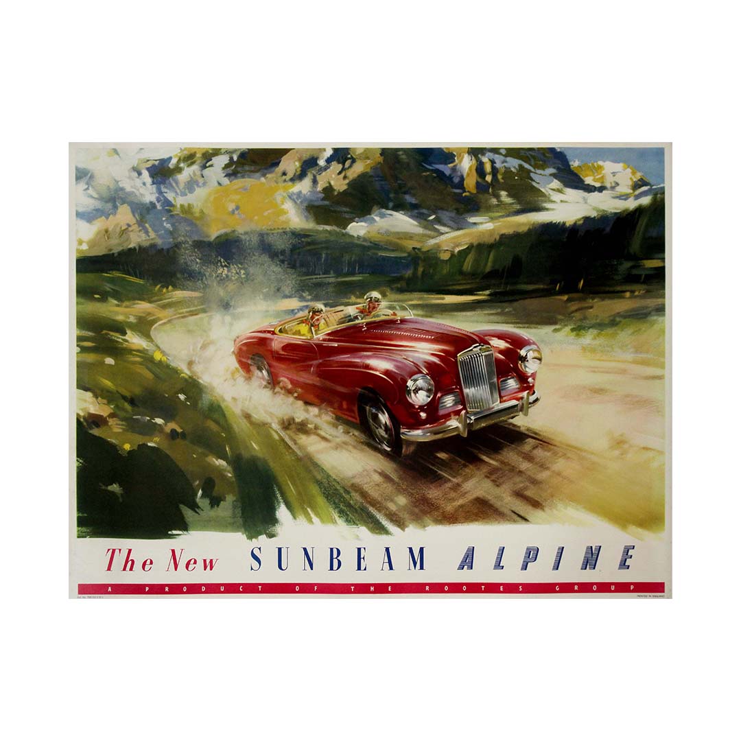 Le groupe Rootes, constructeur automobile britannique de renom, a lancé la Sunbeam Alpine, un modèle distinctif venant enrichir sa gamme. L'affiche capture l'essence du design élégant de l'Alpine, incarnant l'esprit d'innovation des voitures de sport de l'après-guerre.
