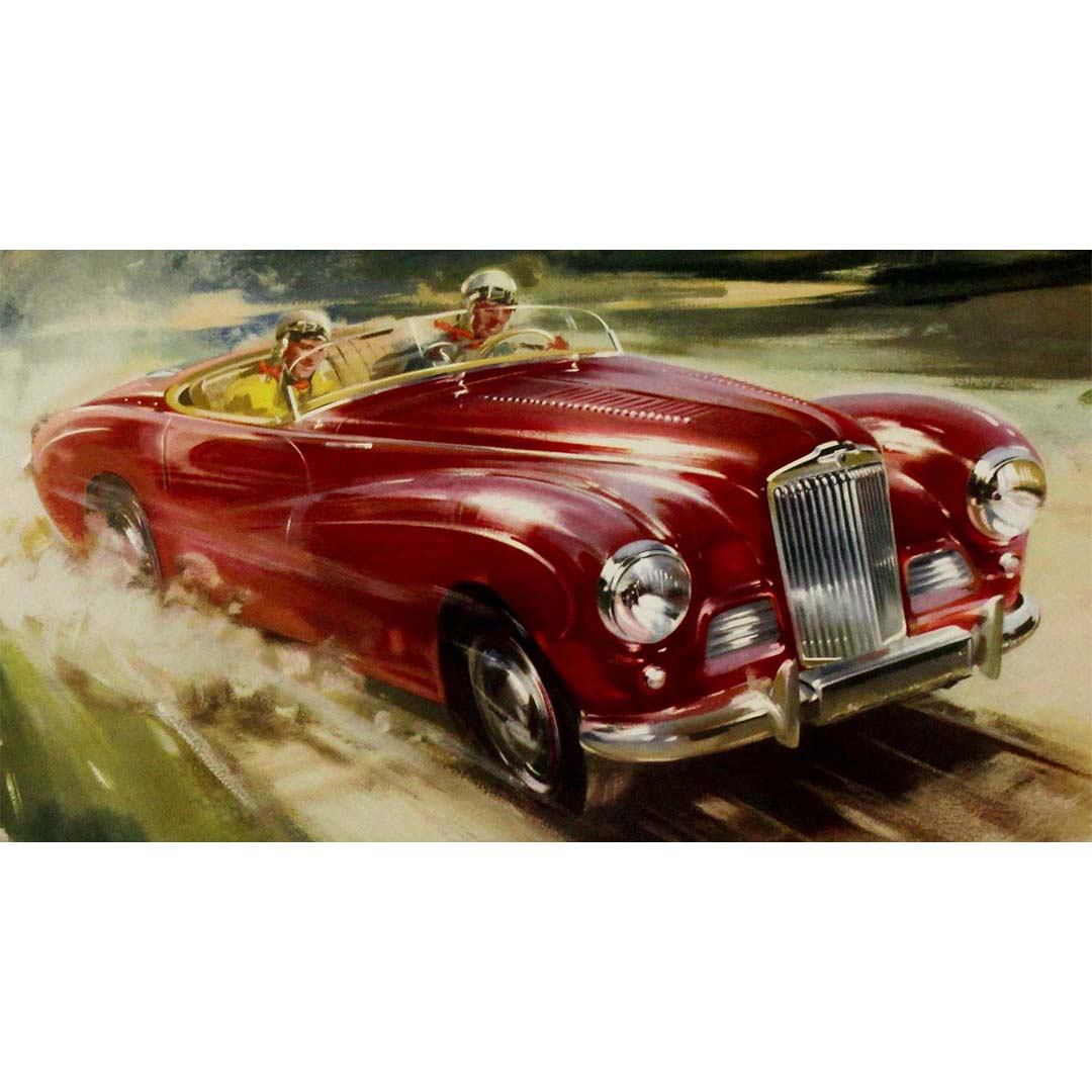 Conçue pour ceux qui recherchaient à la fois style et vitesse, la Sunbeam Alpine s'est rapidement imposée comme une référence en matière de performances sur route et sur circuit. L'affiche, avec sa représentation dynamique de la voiture en mouvement, transmet le plaisir et l'excitation liés à la conduite de ce véhicule d'exception.