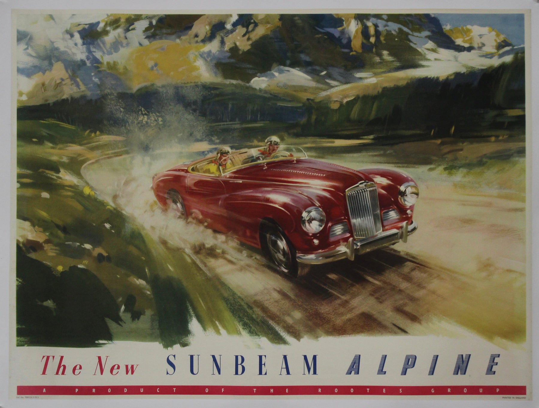 En 1953, le monde automobile découvrait la « Nouvelle Sunbeam Alpine », une création remarquable née de l'ingéniosité du groupe Rootes. Cette affiche originale témoigne de l'élégance et des performances qui ont caractérisé cette voiture de sport emblématique.