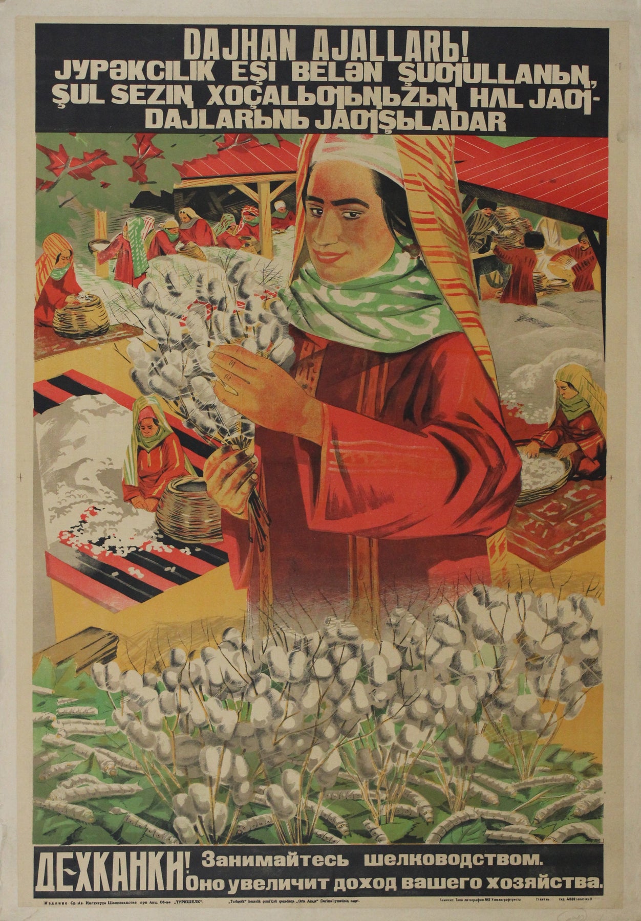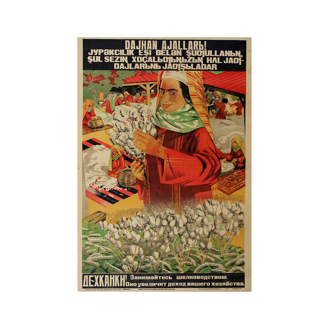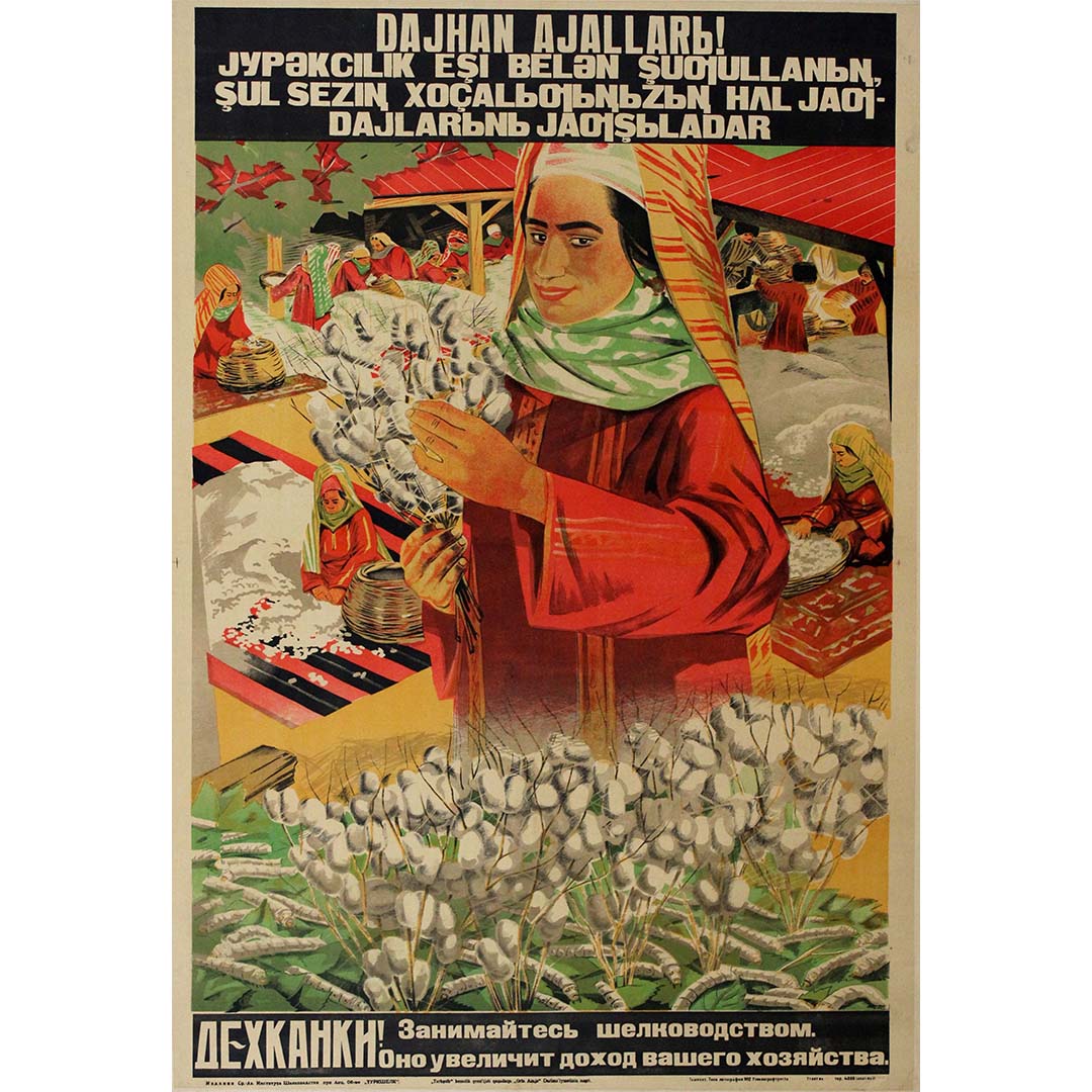 L'affiche originale d'Ouzbékistan encourage les agriculteurs à se lancer dans la sériciculture, soulignant le potentiel d'augmentation des revenus de leurs exploitations. Par son message simple mais percutant, elle vise à promouvoir la sériciculture comme une opportunité lucrative pour le développement agricole en Ouzbékistan.