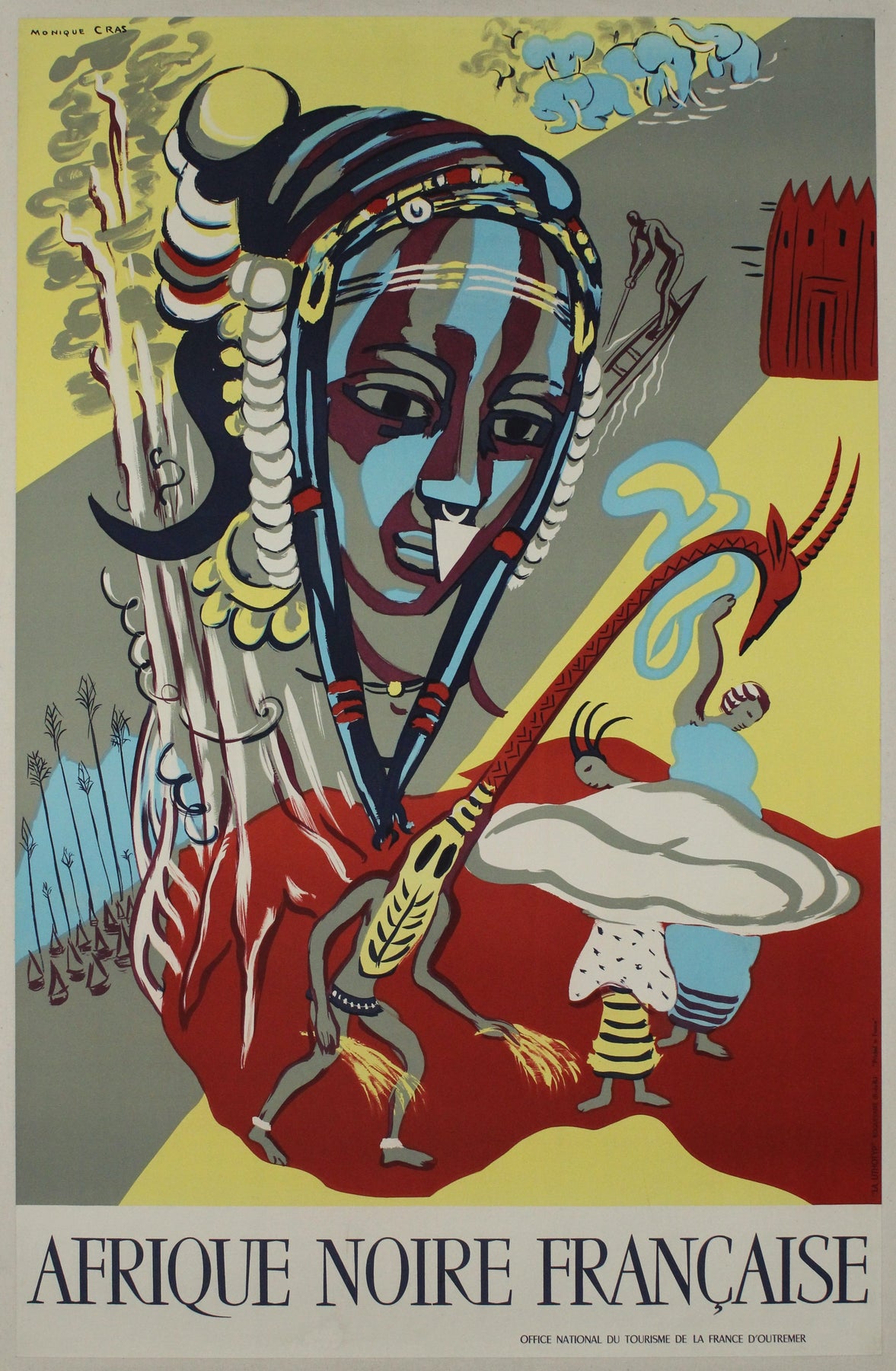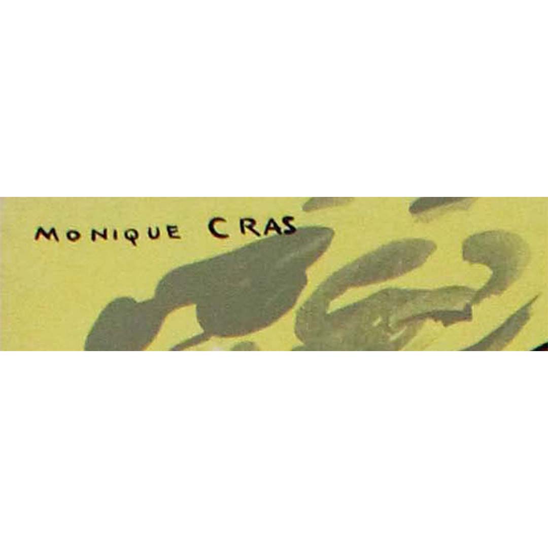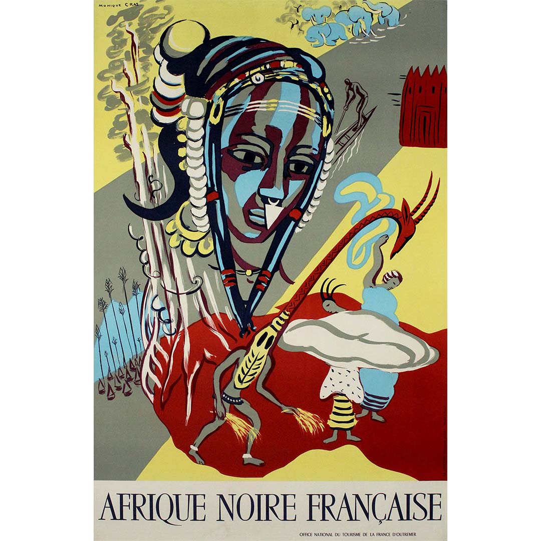 L'affiche touristique originale « Afrique Noire Française » de Monique Cras a été créée pour l'Office National du Tourisme de la France d'Outremer afin de promouvoir le tourisme en Afrique-Occidentale française. Cette œuvre saisissante avait pour but d'inciter les voyageurs à explorer la richesse culturelle et la beauté des paysages de la région. Monique Cras, artiste accomplie reconnue pour son style vibrant et expressif, capture avec talent l'essence de l'art et des traditions ouest-africaines. Son travail se caractérise par l'utilisation de couleurs audacieuses et de motifs complexes, clairement visibles sur cette affiche. L'imagerie évoque un sentiment d'aventure et de découverte, reflétant le dynamisme et la diversité du patrimoine culturel de l'Afrique-Occidentale française. L'affiche témoigne du talent de Cras pour la fusion d'éléments africains traditionnels et de techniques artistiques modernes, ce qui en fait une œuvre majeure de la publicité touristique du milieu du XXe siècle, qui continue de susciter l'admiration et la curiosité.