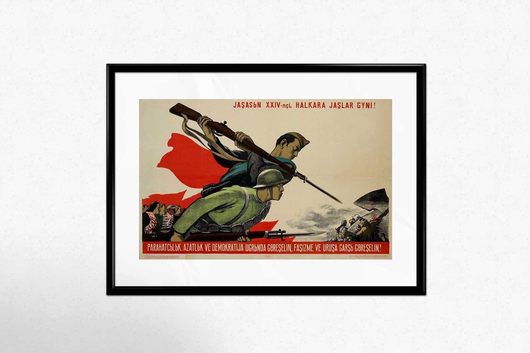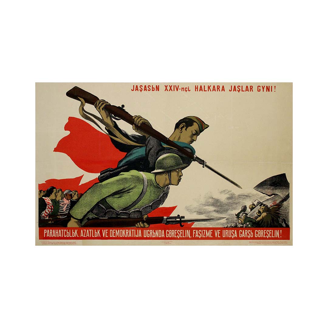 Le texte en haut de l'affiche, « Jaşasın XXIV-nci Halkara Jaşlar Gyni! », signifie « Vive la 24e Journée internationale de la jeunesse ! ». Cette exclamation célèbre l'esprit et la solidarité de la jeunesse du monde entier. Le texte en bas, « Parahatçylyk. Azatlyk ve Demokratija ugrunda göreşelin, faşizme ve uruşa garş göreşelin! », signifie « Luttons pour la paix, la liberté et la démocratie, et contre le fascisme et la guerre ! ». Cet appel à l'action puissant souligne la lutte continue contre l'oppression et l'importance de rester vigilant face à la résurgence des idéologies fascistes.