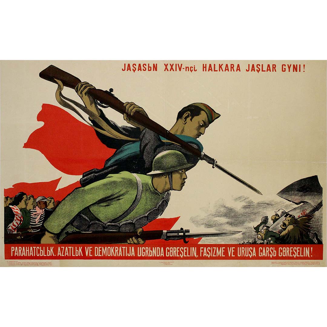 L'affiche de propagande soviétique originale commémorant le 24e anniversaire de la Journée internationale de la jeunesse est une illustration saisissante du sentiment d'après-guerre et de la lutte continue contre le fascisme. Elle présente une image forte et marquante de deux soldats, l'un en uniforme militaire soviétique et l'autre probablement issu d'une autre nation du bloc soviétique, chargeant, baïonnettes au canon. Cette image symbolise l'unité et la détermination dans la lutte pour la paix, la liberté et la démocratie.