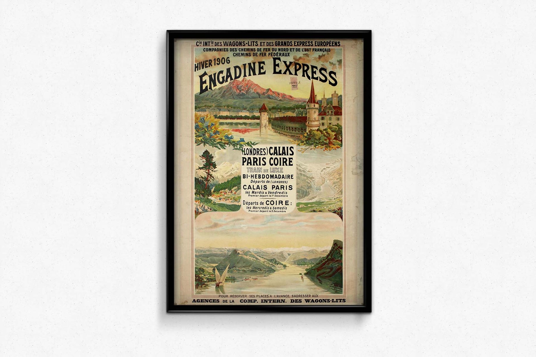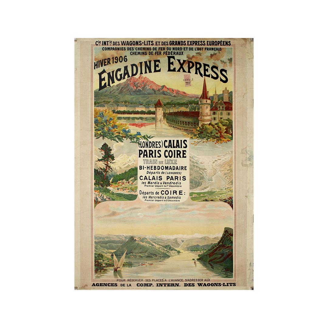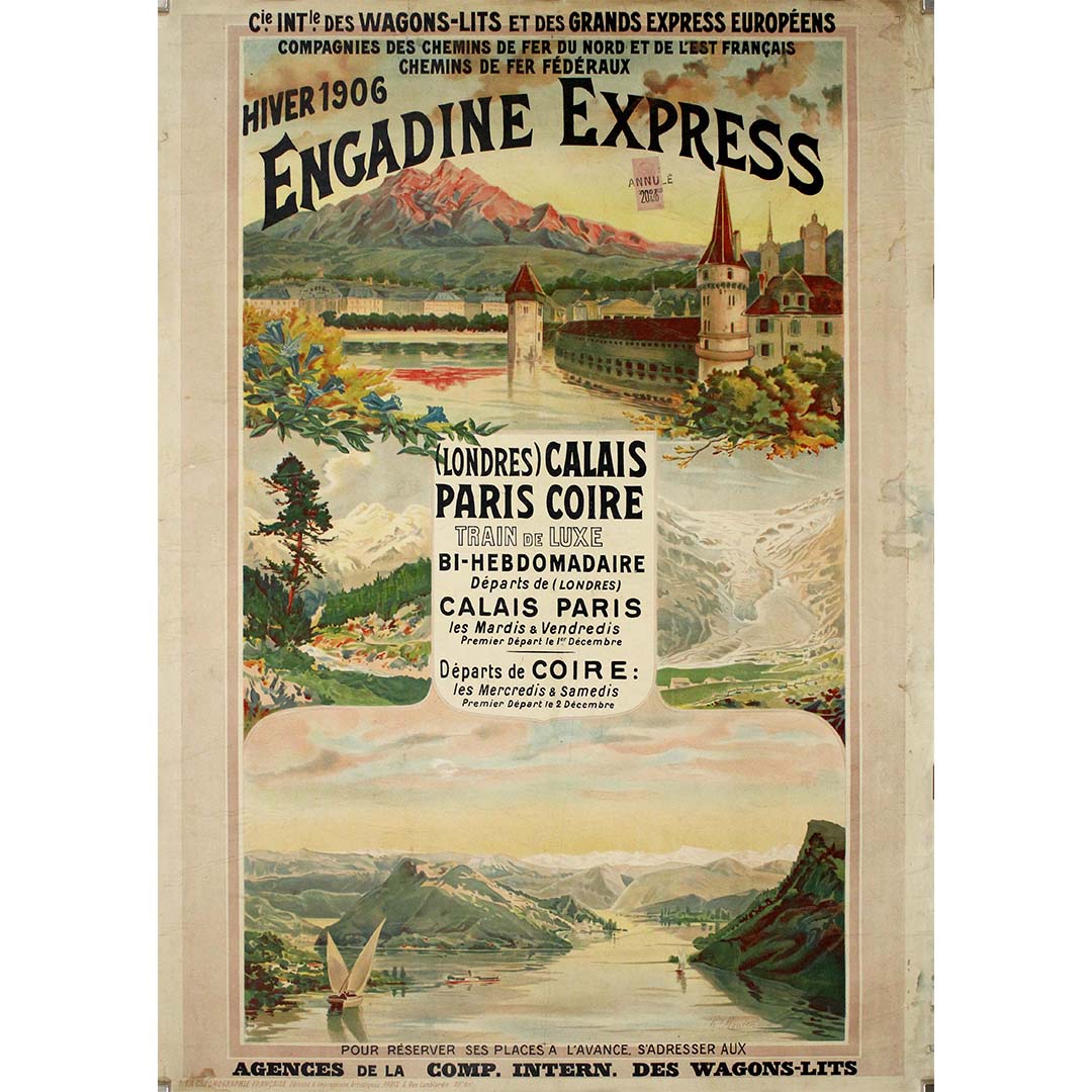 L'affiche originale de 1906, réalisée par Mouren Henry pour la « Cie Intle des Wagons-Lits et des grands express européens - Engadine Express », est un magnifique exemple de l'art publicitaire touristique du début du XXe siècle. Conçue pour promouvoir le luxueux Engadine Express, ce service ferroviaire haut de gamme exploité par l'International Sleeping-Car and European Express Trains Company permettait de voyager de Londres, Calais et Paris à Coire, en Suisse. L'Engadine Express était réputé pour son confort, son élégance et son efficacité, offrant aux voyageurs aisés un voyage sans encombre et somptueux à travers des paysages pittoresques.