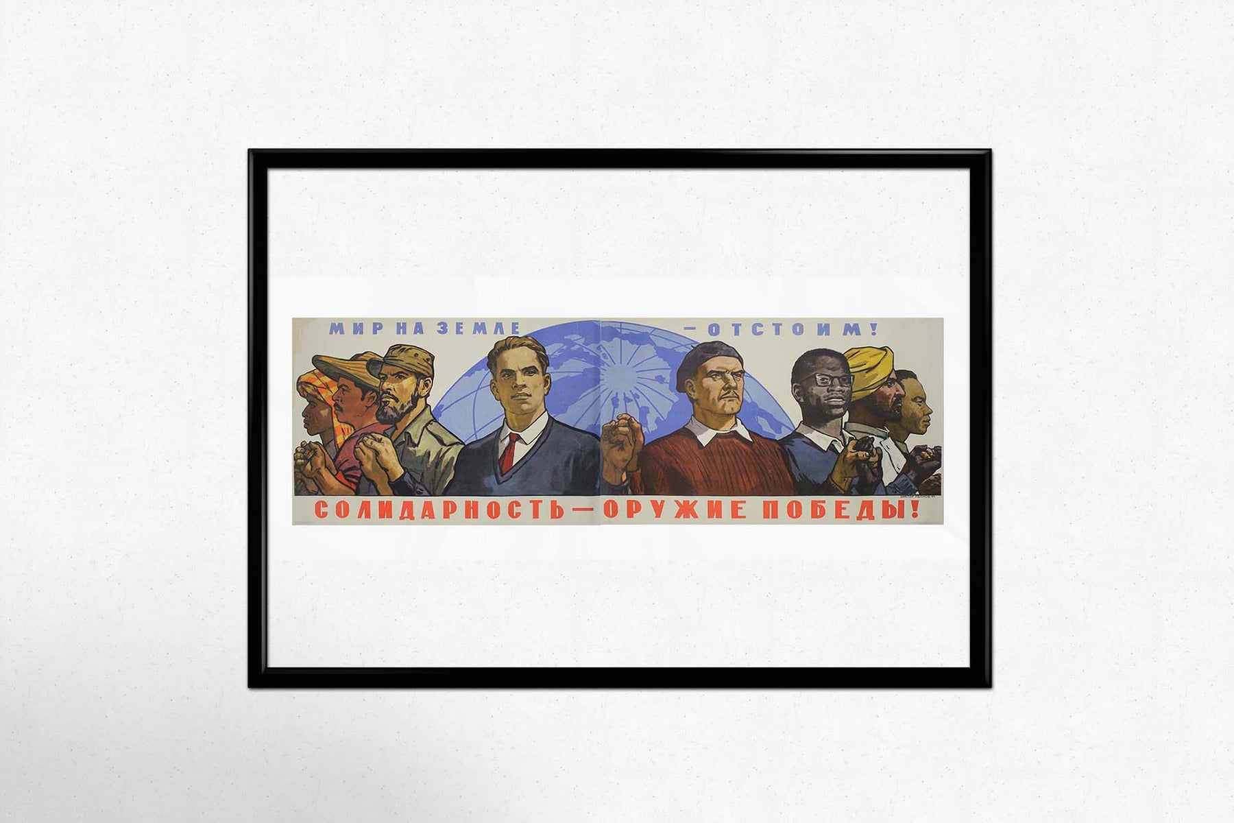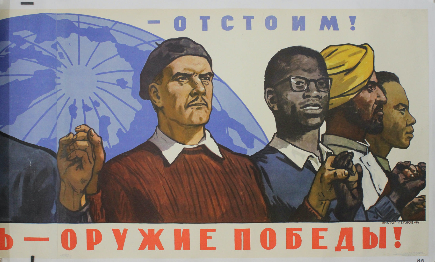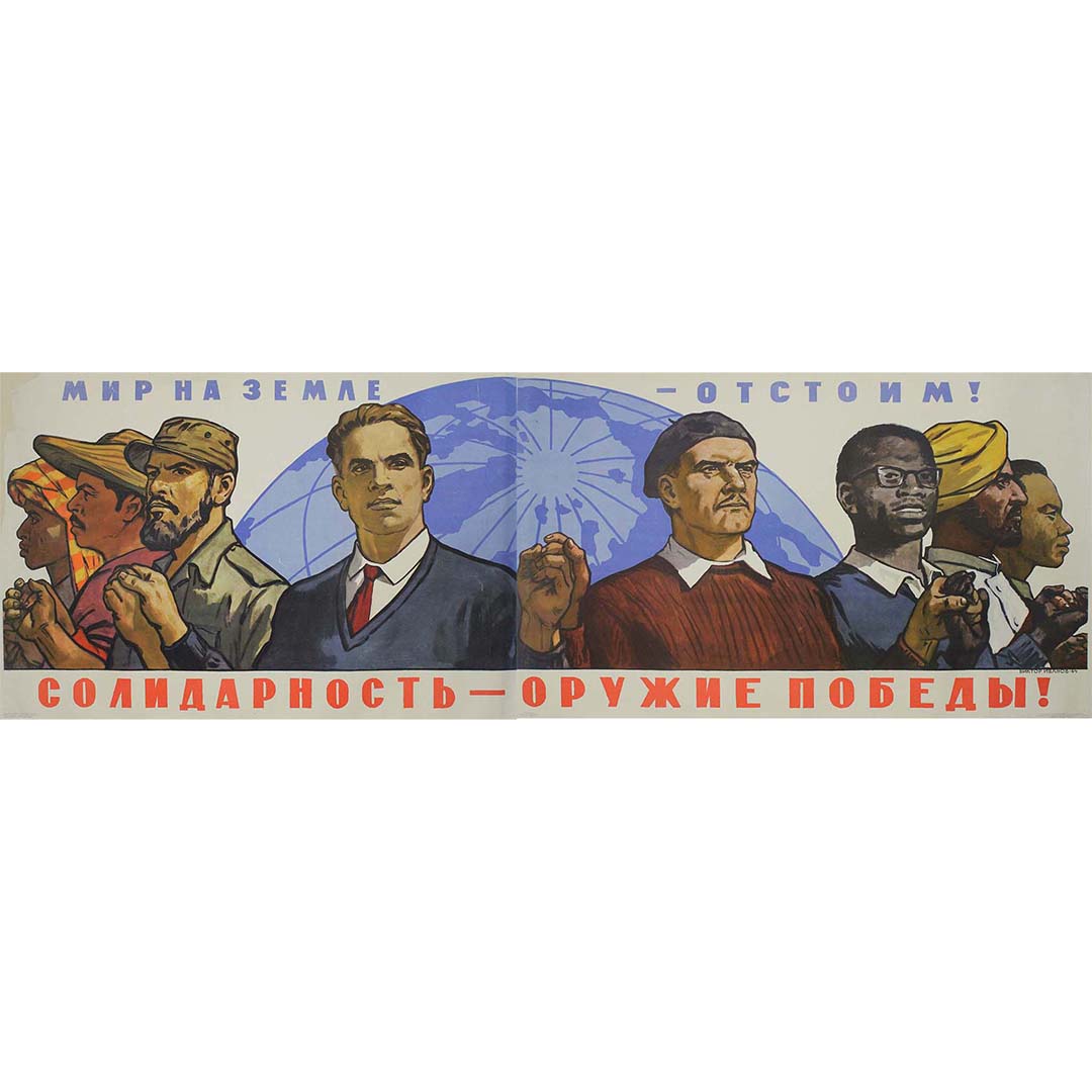 L'affiche soviétique originale de 1964, réalisée par l'artiste Viktor Semenovich Ivanov, est une œuvre de propagande saisissante de l'époque de la Guerre froide, incarnant l'esprit de solidarité internationale et la lutte pour la paix mondiale. Elle représente un groupe d'hommes d'origines ethniques diverses, debout, le visage déterminé et les poings serrés, symbolisant l'unité et la force collective.