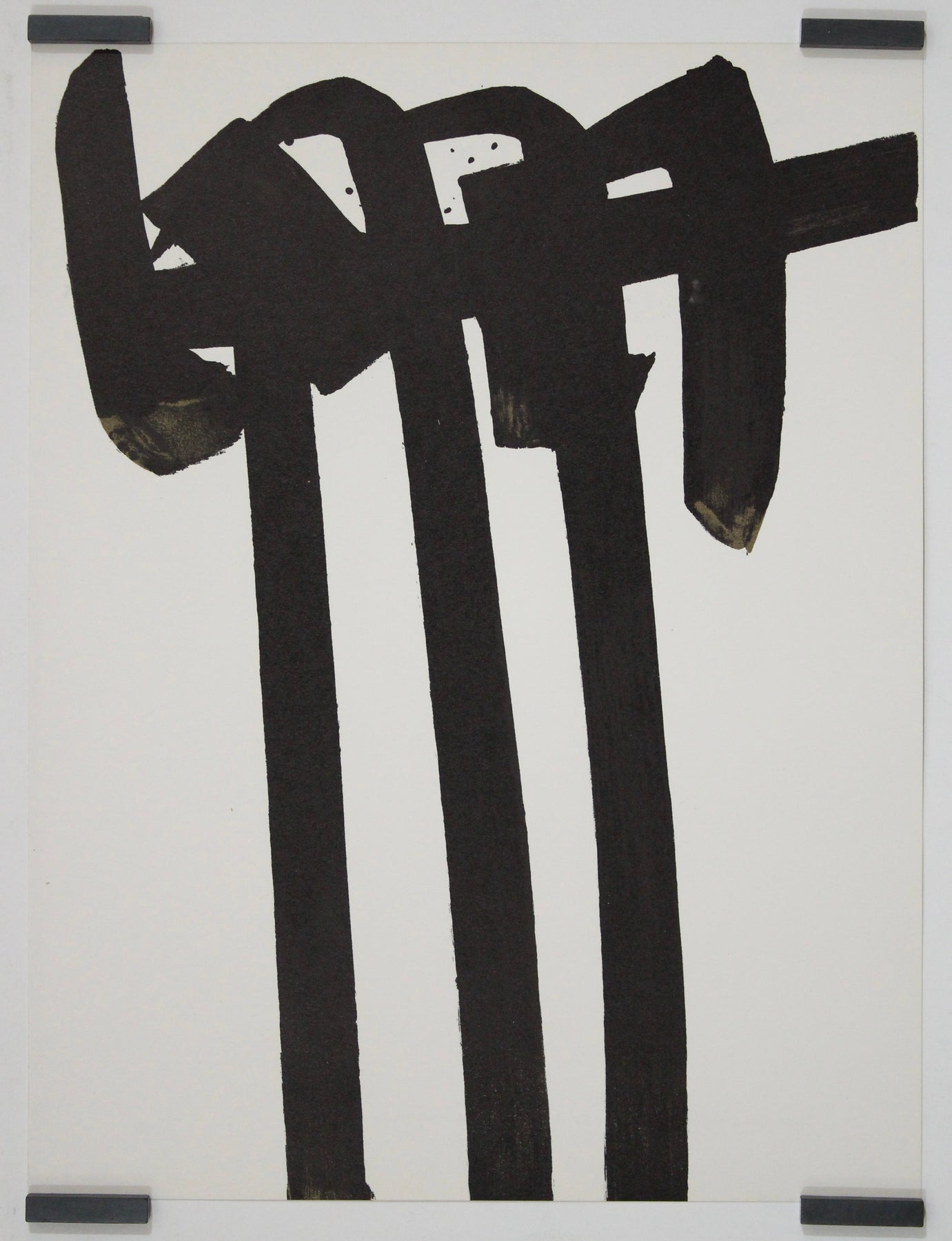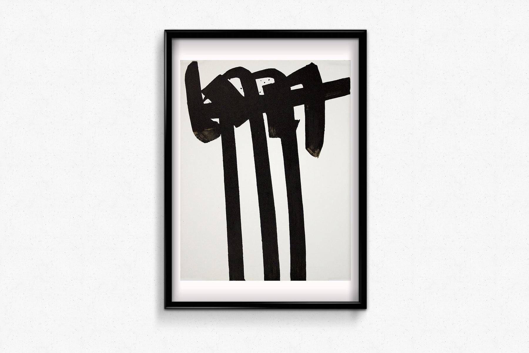 Dominée par trois traits verticaux monumentaux, traversés de barres gestuelles et rythmiques, l'image offre une démonstration saisissante du langage abstrait de Soulages. Chaque coup de pinceau – texturé, saturé, vibrant – semble tout droit sorti de l'atelier de l'artiste. Minimaliste, elle n'en est pas moins empreinte de tension, de mouvement et de gravité.