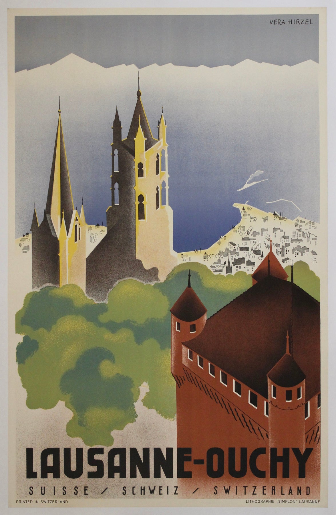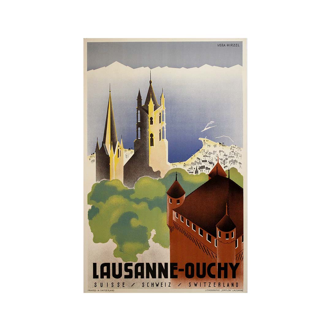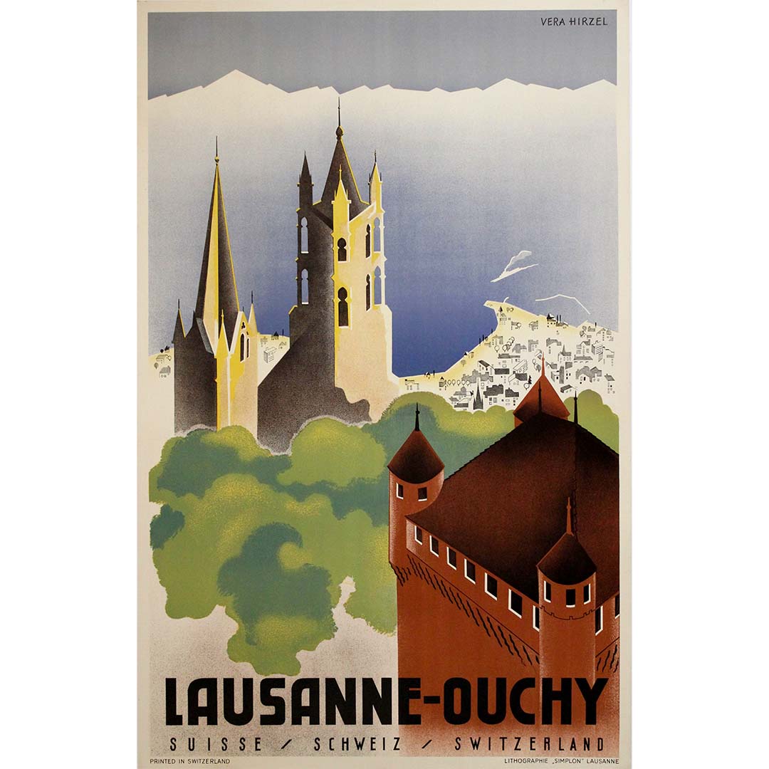 Cette élégante affiche de voyage Art déco, réalisée par l'artiste suisse Vera Hirzel vers 1935, invite à découvrir le charme et le patrimoine de Lausanne et de son pittoresque quartier lacustre d'Ouchy. Commandée durant l'essor touristique de l'entre-deux-guerres, cette lithographie est une expression raffinée de la publicité touristique suisse du XXe siècle.