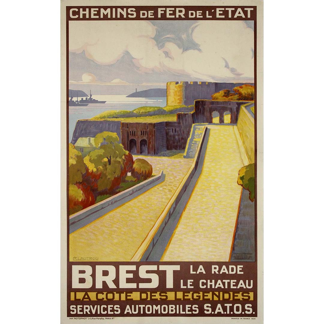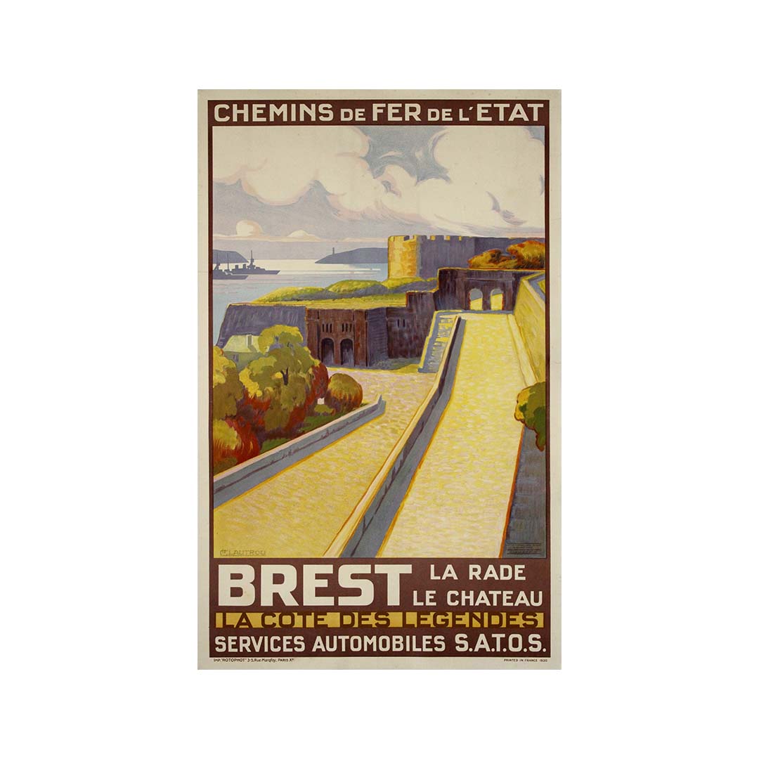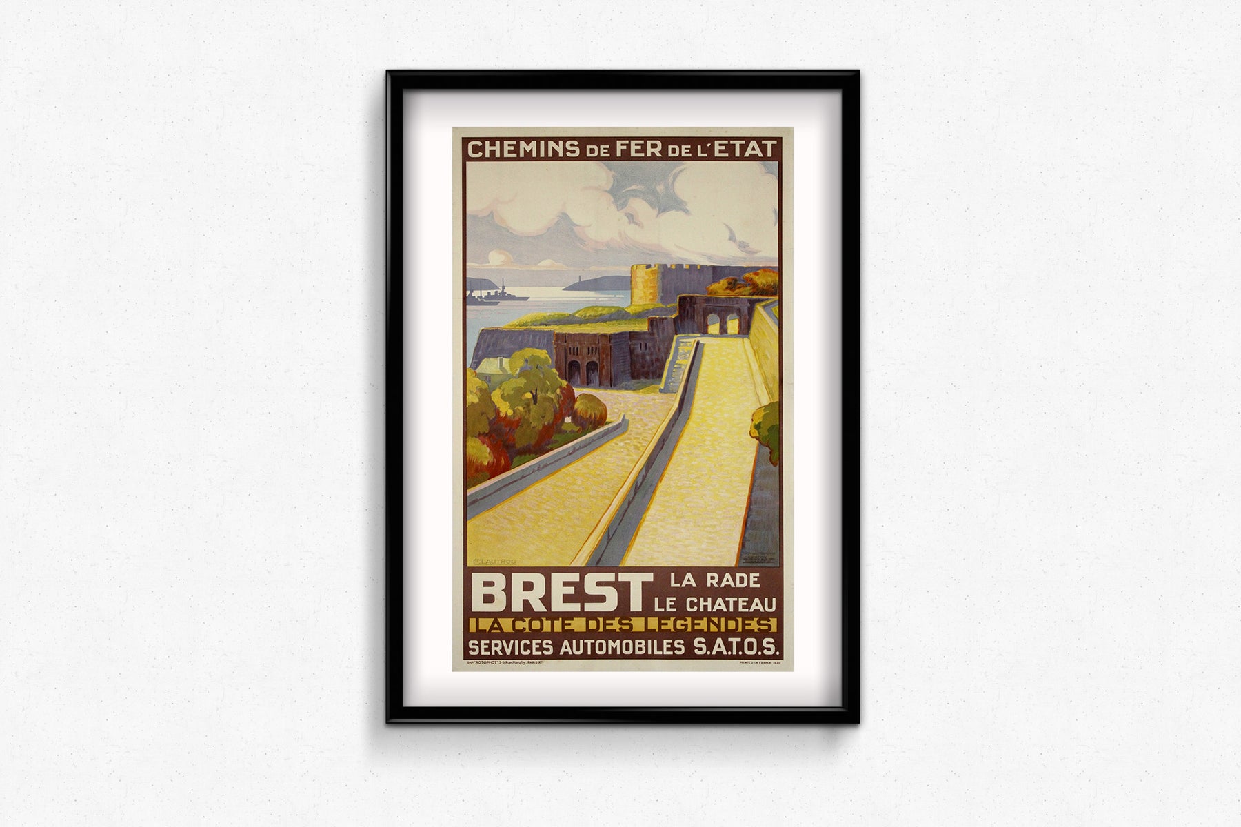 L'affiche fut imprimée en 1930 par Rotophot à Paris pour les Services Automobiles SATOS , la compagnie de bus régionaux connectée au réseau ferroviaire. Elle incitait les Parisiens et les voyageurs à explorer l'extrême ouest de la Bretagne, mettant en avant Brest comme place forte navale et porte d'entrée vers la mythique Côte des Légendes, réputée pour ses rivages balayés par les vents, ses légendes de saints et ses mégalithes antiques.