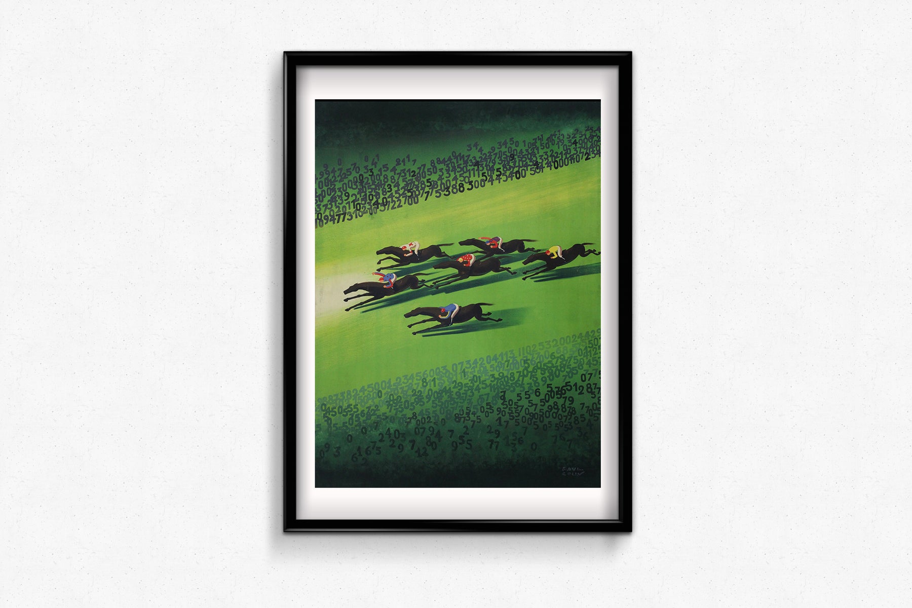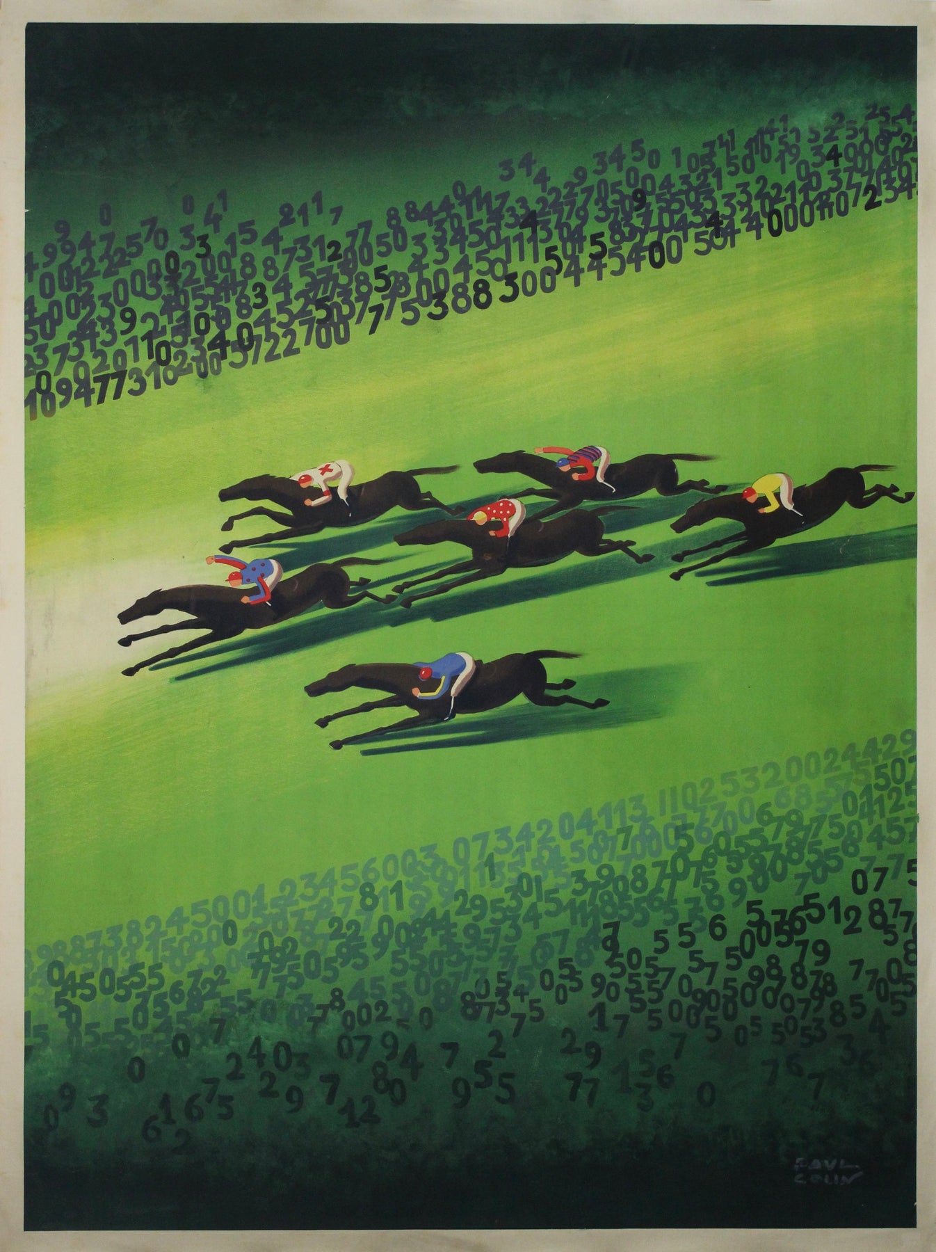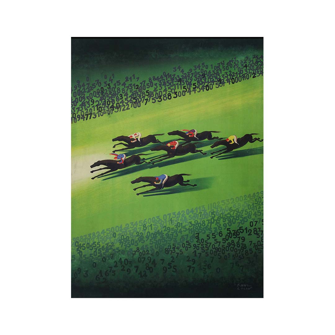 L'image est d'une originalité saisissante : des chevaux et des jockeys stylisés et élégants s'élancent sur un champ d'un vert émeraude éclatant. Leurs silhouettes épurées et minimalistes incarnent la vitesse et l'élégance, tandis que les couleurs vives des casaques des jockeys ajoutent des touches rythmiques. Encadrant cette scène de course, des chiffres en cascade – symbolisant la loterie, le hasard et la fortune – se déploient avec dynamisme dans la composition, renforçant l'impression de mouvement rapide et d'intensité dramatique.