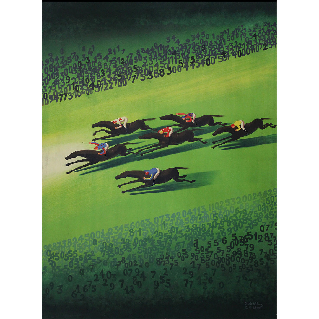 Cette affiche, dite « avant-première » (imprimée avant l'ajout du texte officiel), témoigne du talent exceptionnel de Colin pour la narration visuelle par la seule force de l'image. Son style novateur ne se contente pas de promouvoir la prestigieuse course parisienne, il associe également le frisson du pari au glamour et à l'effervescence des courses hippiques.