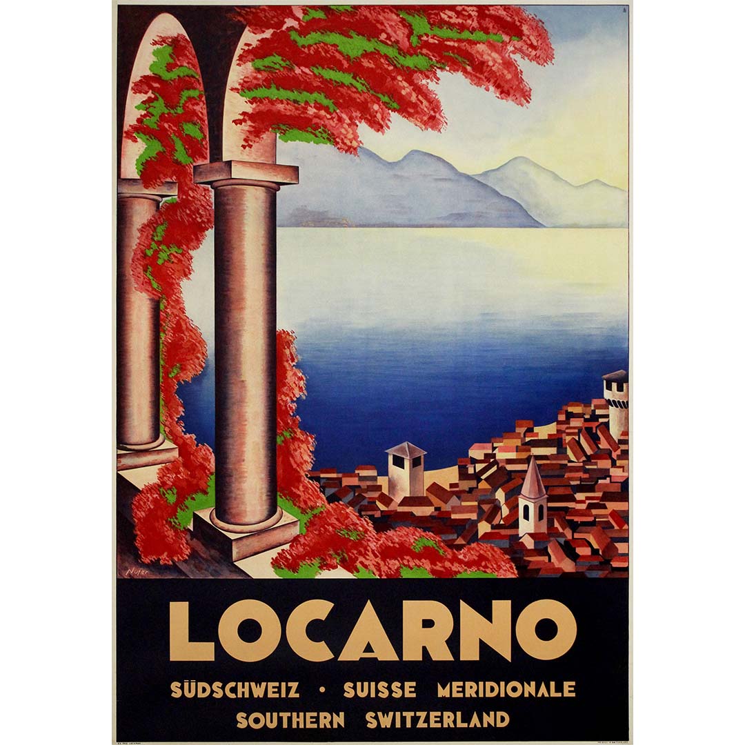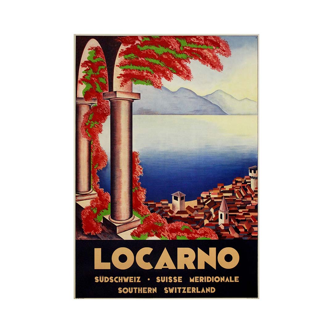 Aujourd'hui, cette affiche rare est bien plus qu'une simple publicité : c'est une œuvre d'art qui rayonne de la nostalgie de l'élégance européenne d'avant-guerre et de la beauté intemporelle des paysages de Locarno, idéale pour tout connaisseur d'art de voyage suisse, de design vintage et de romantisme architectural.