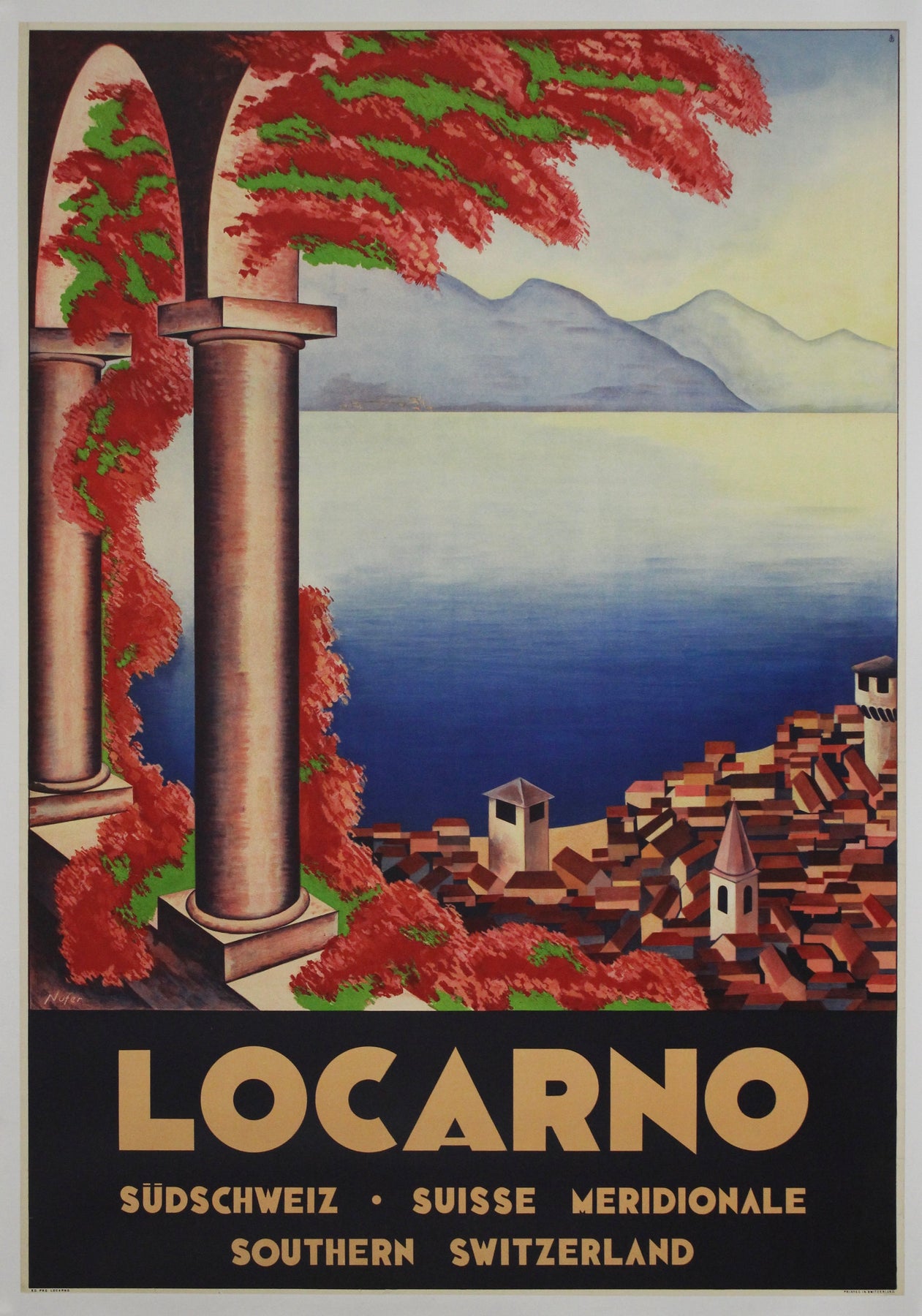 Cette affiche de voyage originale de 1932, signée Nufer, capture le charme intemporel de Locarno, joyau ensoleillé du sud de la Suisse. Conçue avec une précision Art déco remarquable, la composition encadre la vue panoramique sur le lac Majeur à travers d'élégantes arches de pierre entrelacées d'un feuillage aux teintes pourpres et vertes éclatantes, évoquant la chaleur méditerranéenne et la tranquillité alpine.
