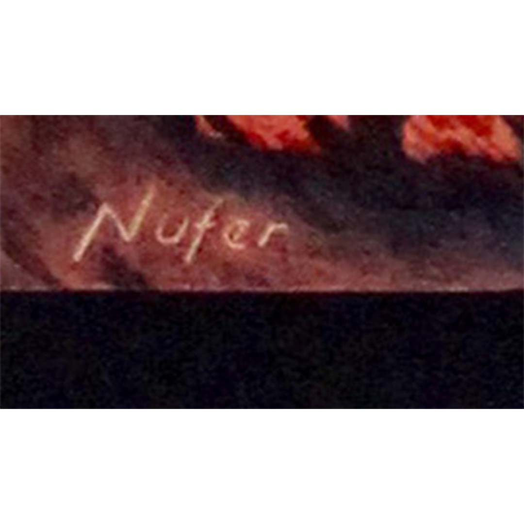 Signée dans la planche par Nufer, cette lithographie originale est restée en superbe état, témoignant de l'excellence de l'imprimerie suisse et de l'âge d'or de la publicité touristique. Son esthétique Art déco et sa palette de couleurs évocatrice en font une pièce maîtresse pour les collectionneurs d'affiches de voyage vintage et de design du milieu du XXe siècle.