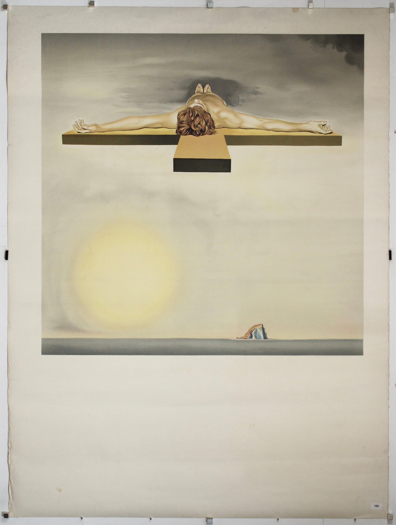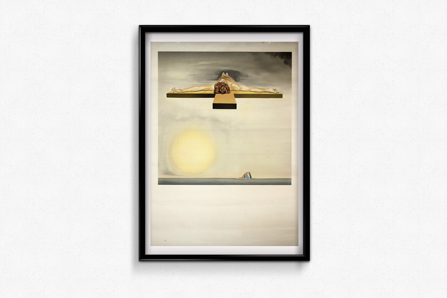 Cette lithographie originale de 1982, Crucifixion (Christ de Gala) , est l'une des réinterprétations les plus saisissantes et spirituelles du thème de la crucifixion par Salvador Dalí. Inspirée de sa peinture à l'huile de 1954 , Le Christ de saint Jean de la Croix , cette composition présente une vision résolument moderne et métaphysique du Christ : suspendu dans l'espace, vu d'en haut et totalement détaché du récit religieux conventionnel.