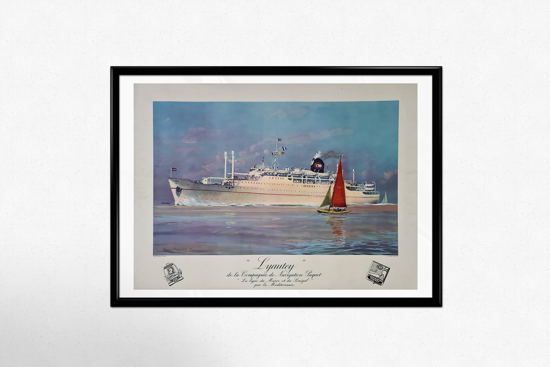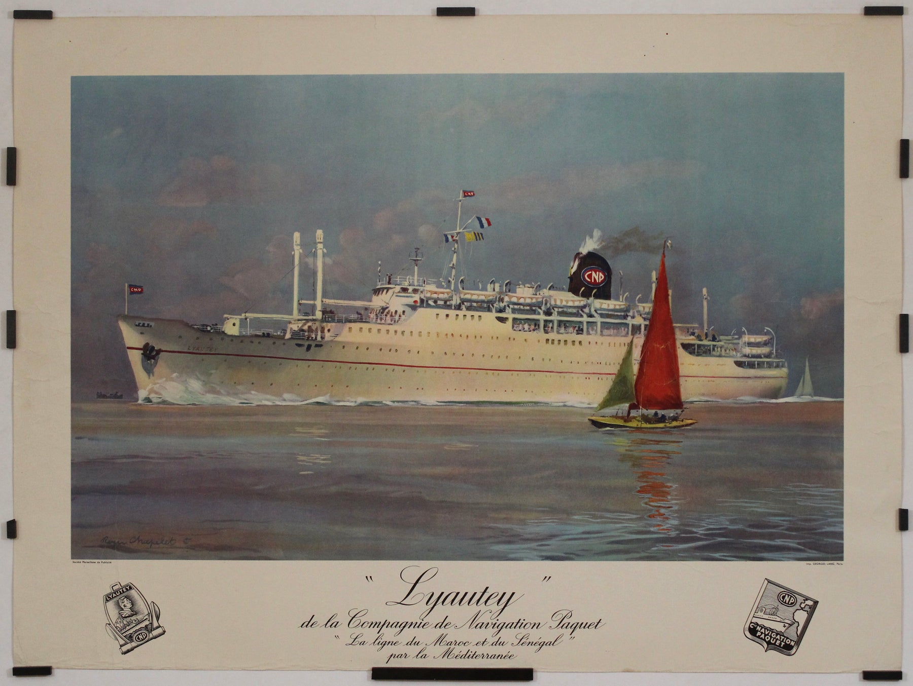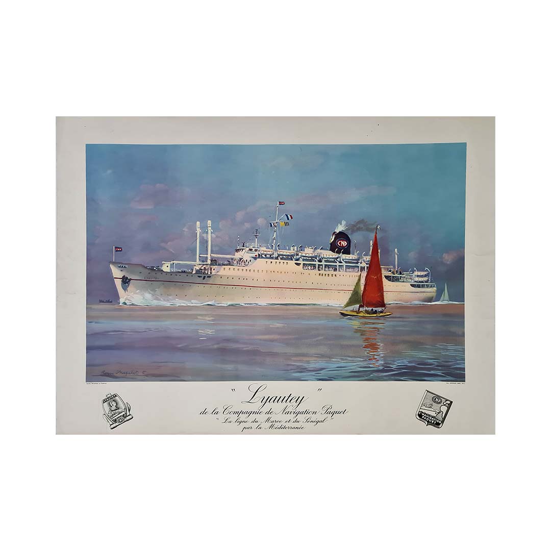 Cette affiche maritime d'époque, créée par le légendaire Roger Chapelet, rend hommage au Lyautey, paquebot de la Compagnie de Navigation Paquet. En service dans les années 1950, le Lyautey faisait partie d'une flotte prestigieuse reliant le Maroc, le Sénégal et la Méditerranée, offrant aux voyageurs un mélange de luxe, d'élégance et d'aventure.
