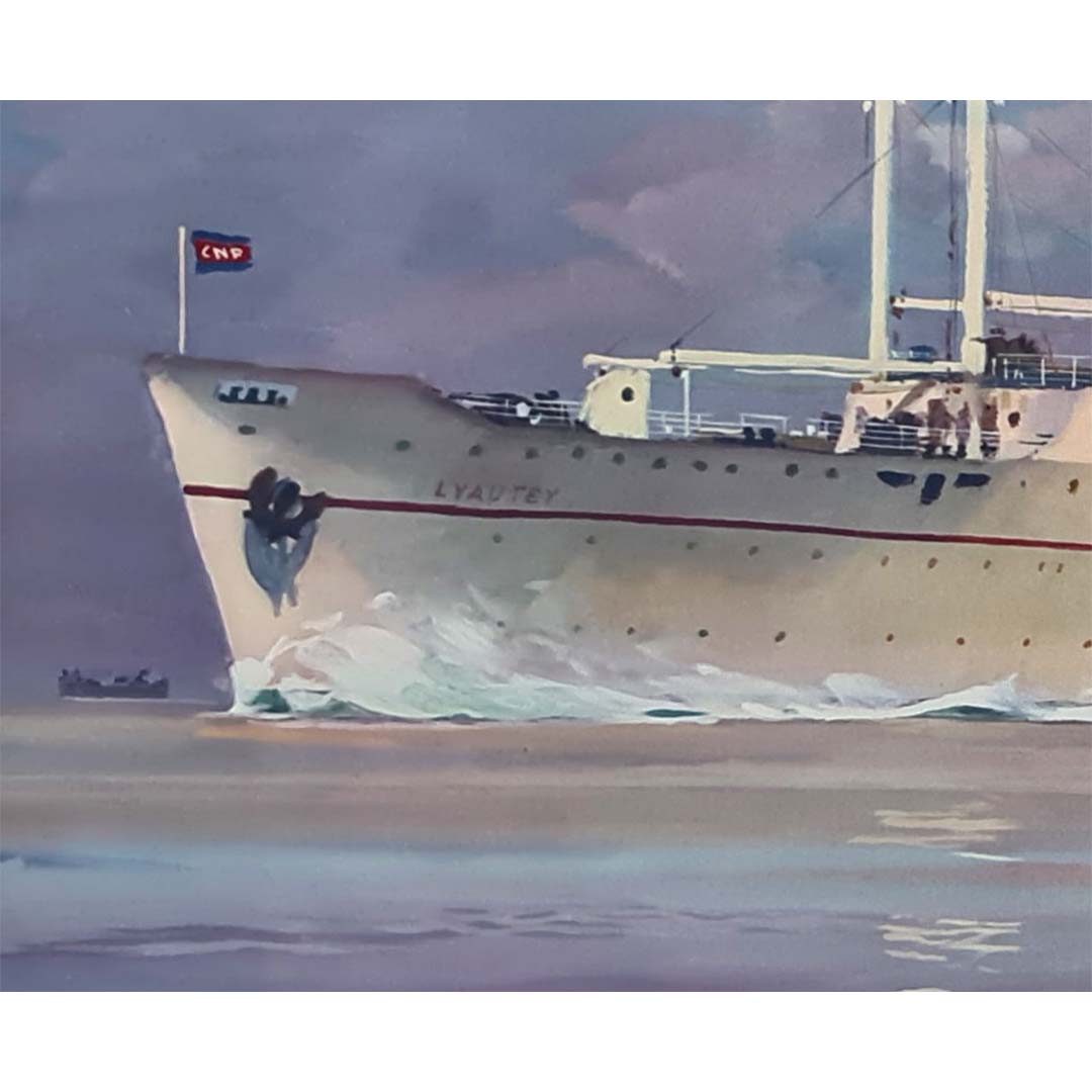 La maîtrise de la couleur et de la lumière par Chapelet insuffle la vie à cette composition, dépeignant le Lyautey voguant sur des eaux calmes sous un ciel aux teintes pastel. La coque blanche et élégante du navire, sa cheminée caractéristique de CNP et ses ponts animés soulignent le raffinement des voyages transatlantiques du milieu du XXe siècle. En contraste, un petit voilier aux voiles rouge et verte éclatantes dérive au premier plan, évoquant le patrimoine maritime traditionnel.