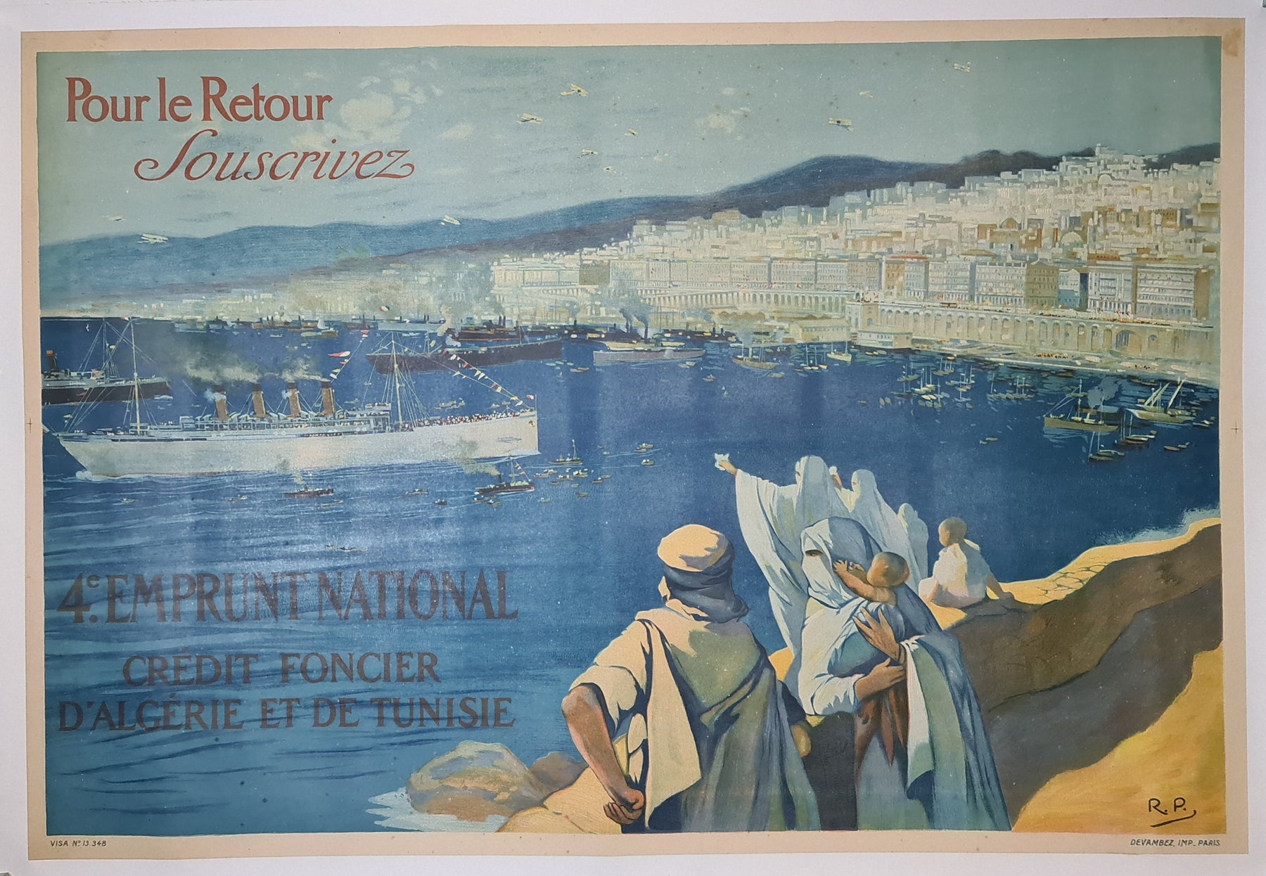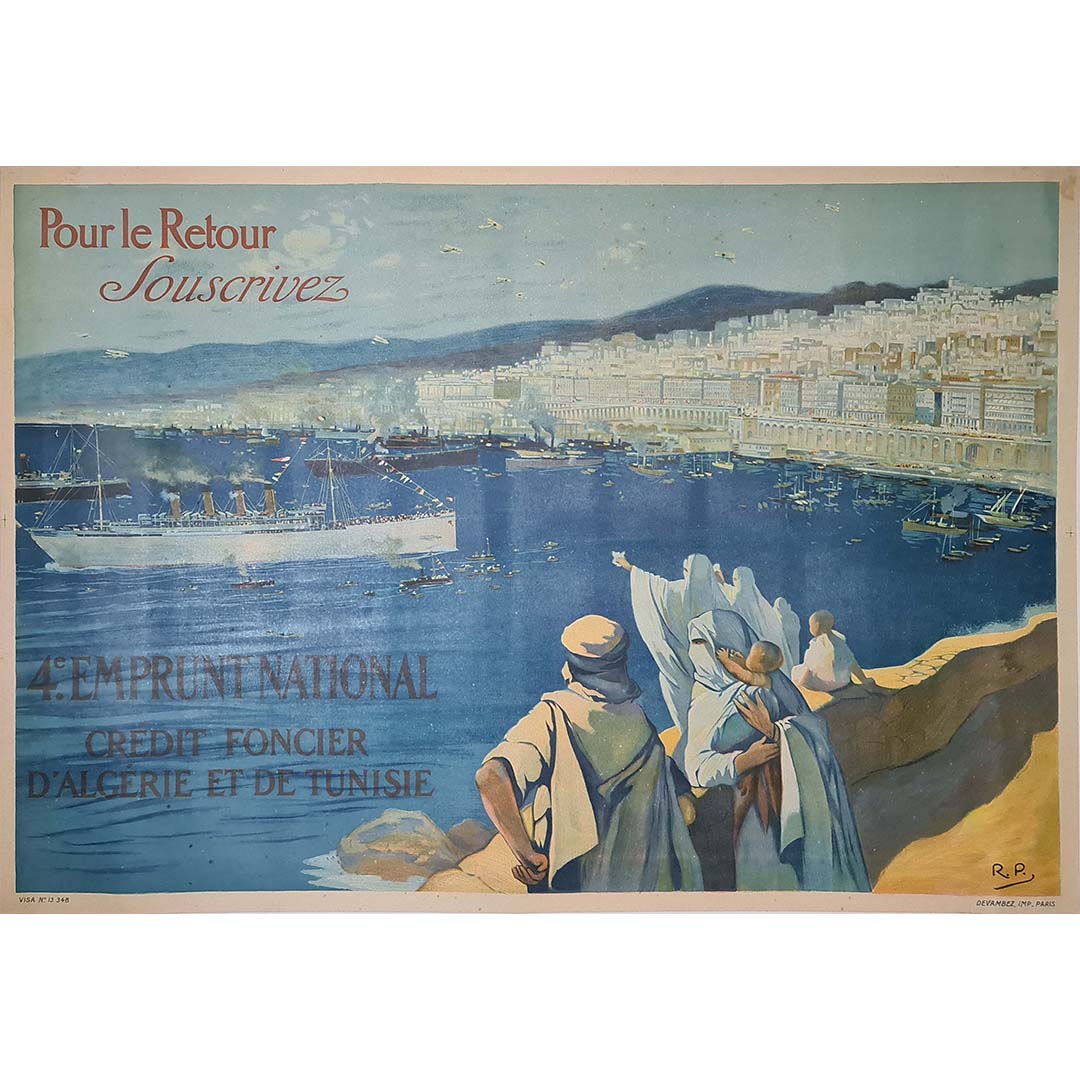 L'affiche originale « Pour le Retour Souscrivez » ( 1920 environ), réalisée par RP, visait à promouvoir le 4e Emprunt National du Crédit Foncier d'Algérie et de Tunisie. Elle a contribué aux efforts de reconstruction et de stabilisation de l'économie française et de ses colonies, notamment l'Algérie et la Tunisie, après la Première Guerre mondiale. L' emprunt national était une campagne financière incitant les citoyens et les résidents coloniaux à souscrire à des obligations d'État, fournissant ainsi les capitaux indispensables à la reconstruction.