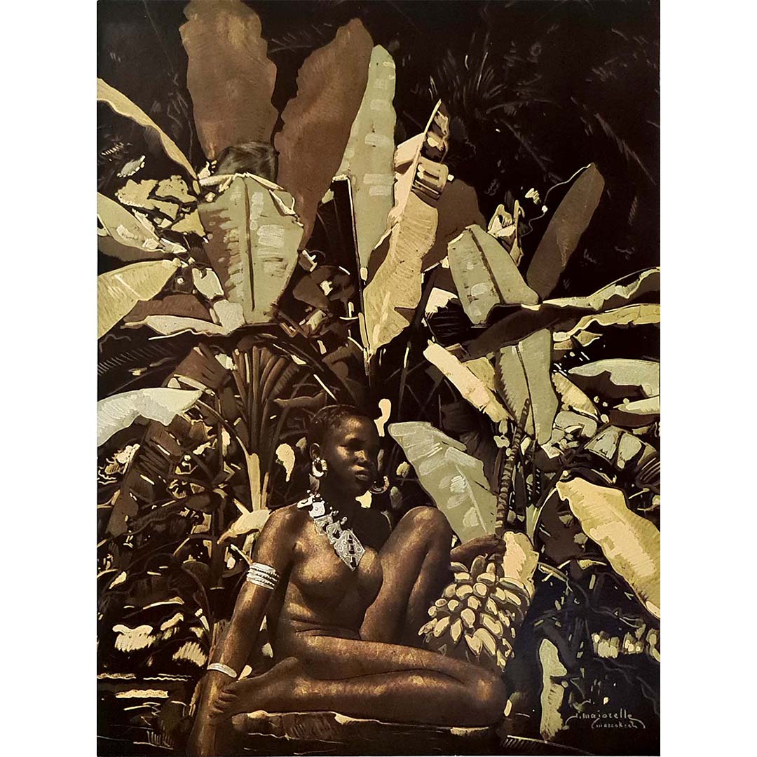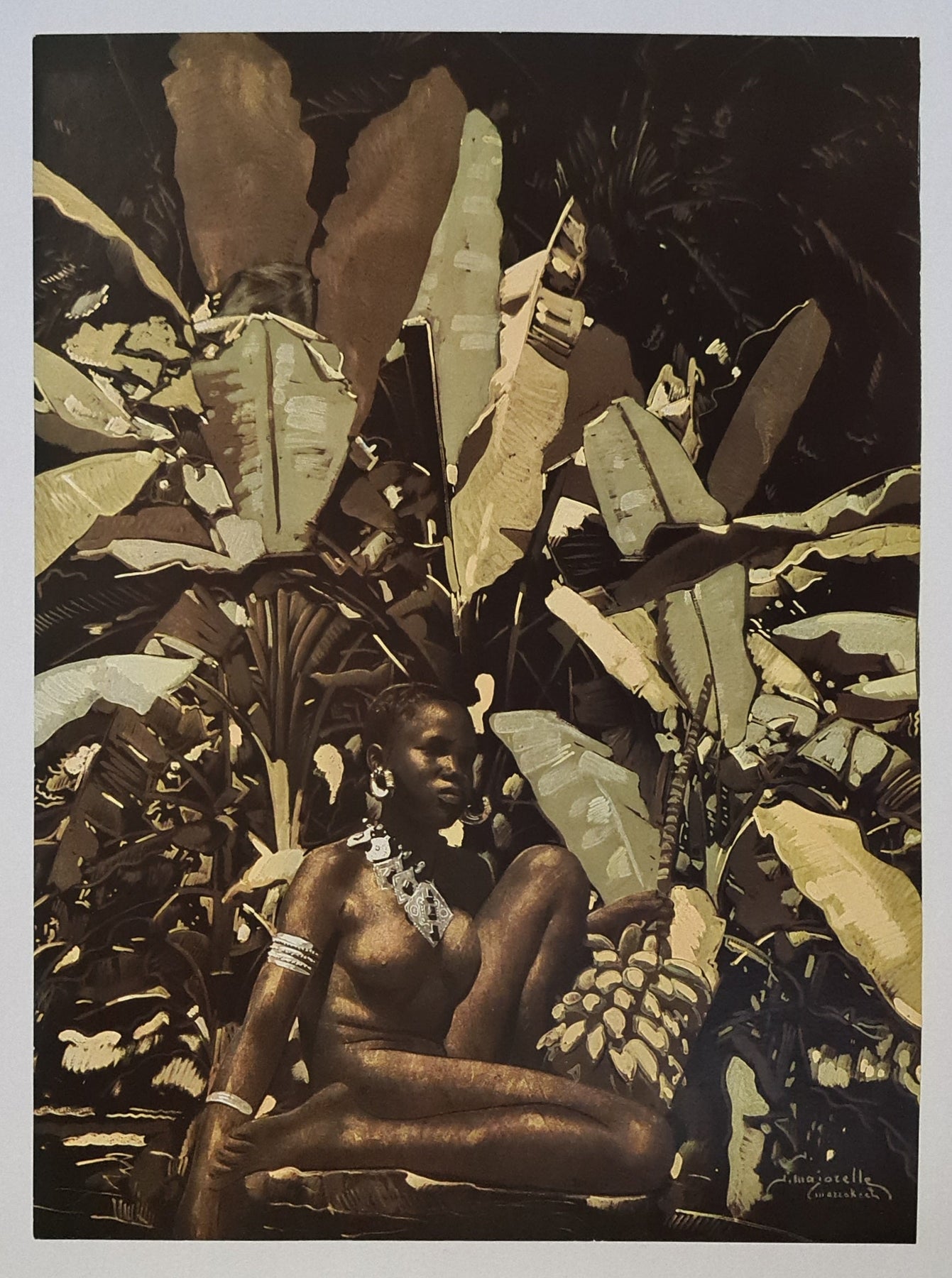 L'affiche de Majorelle met en lumière la rencontre entre l'exotisme de l'époque coloniale et la sensibilité artistique moderniste. Il y représente une Africaine assise au milieu d'une végétation tropicale luxuriante, soulignant ses parures culturelles et le cadre naturel. L'utilisation de couleurs vives et de contrastes marqués, notamment avec les verts profonds et les bruns terreux du feuillage, est caractéristique du style de Majorelle, qui puisait souvent dans la tradition orientaliste tout en l'imprégnant d'une abstraction et d'une intensité émotionnelle propres au modernisme.