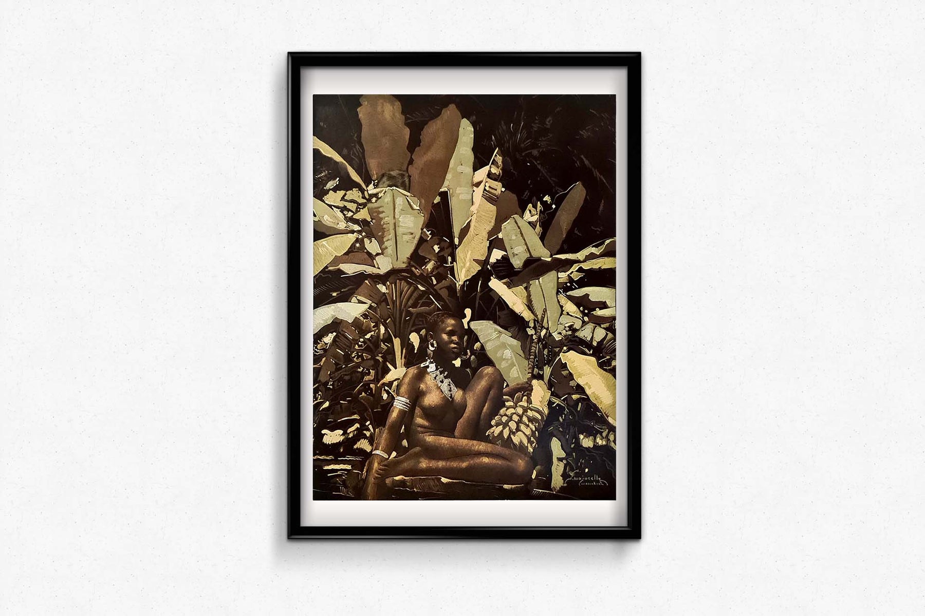 L'affiche dégage une impression générale de tranquillité et de communion avec la nature. La douce lumière du soleil filtre à travers les feuilles de bananier, créant une atmosphère sereine, presque onirique. Les tons terreux, notamment les verts et les bruns, évoquent les paysages du Maroc, tandis que la présence de la femme apporte une touche humaine et personnelle à cette scène par ailleurs naturaliste.