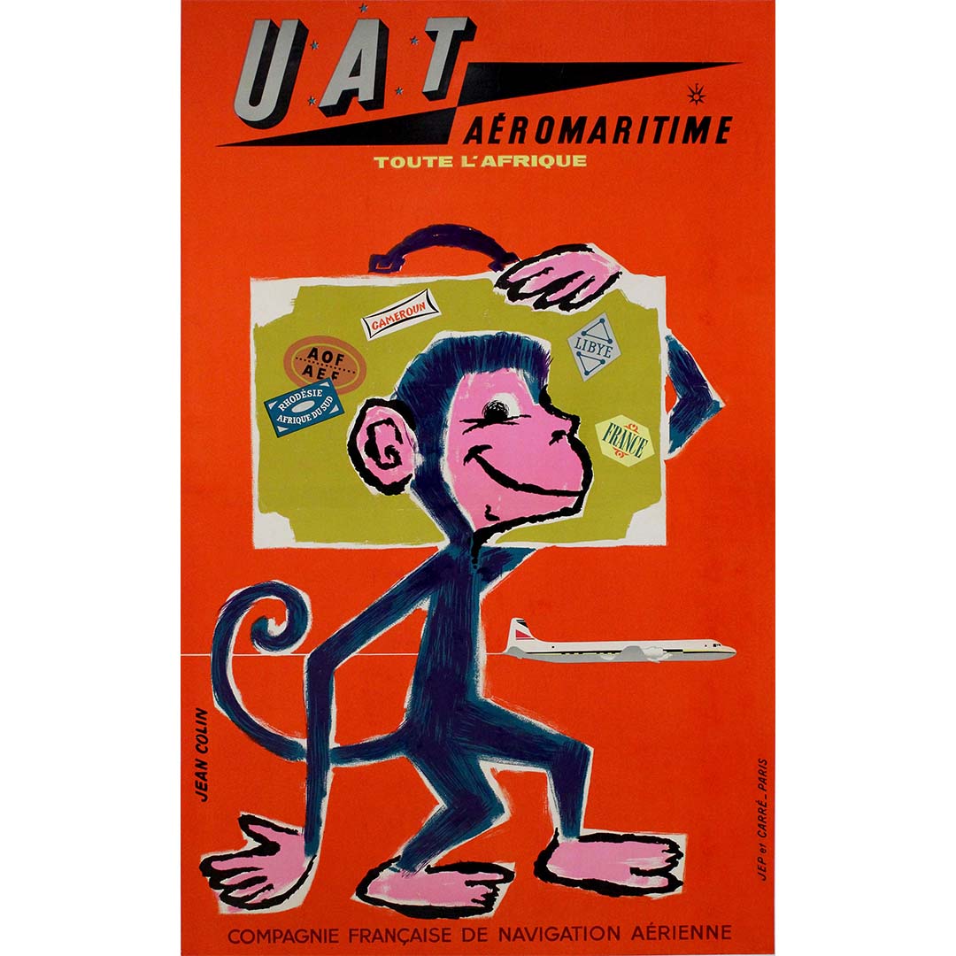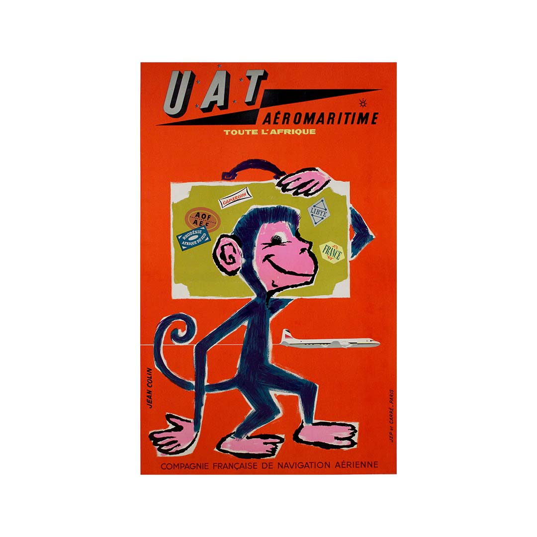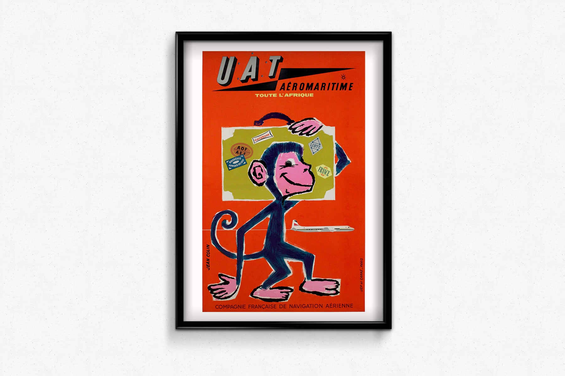 Cette affiche faisait partie de la campagne de l'UAT visant à promouvoir son vaste réseau de lignes à travers l'Afrique. L'UAT, qui a fusionné avec Transports Aériens Intercontinentaux (TAI) en 1963 pour former l'Union de Transports Aériens (UTA), était l'une des principales compagnies aériennes françaises reliant l'Europe à l'Afrique, au Moyen-Orient et au-delà. La compagnie a joué un rôle majeur dans le développement du commerce et des voyages durant l'après-guerre, et ses affiches ont largement contribué à faire connaître les destinations exotiques qu'elle desservait.