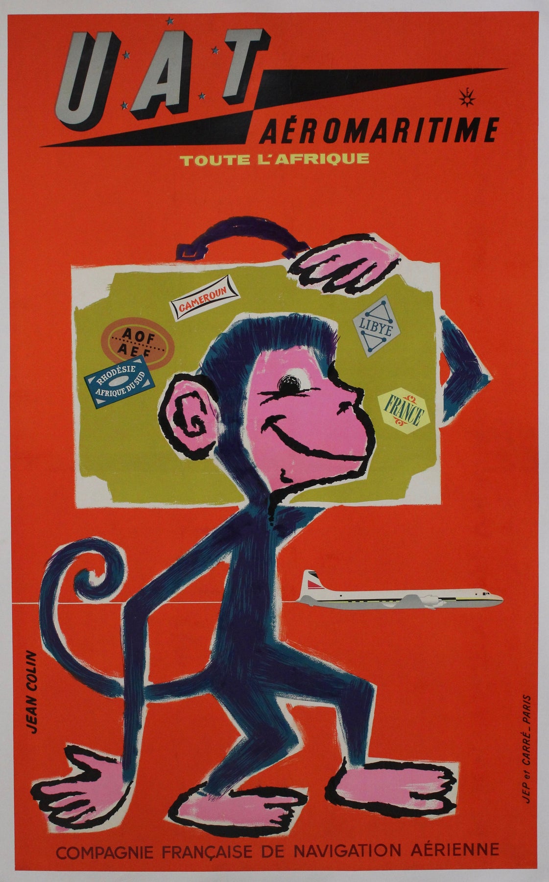 Prix régulier €1.500,00L'affiche de voyage originale de Jean Colin pour UAT (Union Aéromaritime de Transport), datant d'environ 1960 et intitulée « Toute l'Afrique » , est un exemple remarquable de la publicité touristique du milieu du XXe siècle. Créée pour promouvoir les services d'UAT Aéromaritime à travers l'Afrique, cette affiche illustre le charme du voyage aérien et la fascination pour le continent africain à une époque marquée par l'essor du tourisme mondial et les innovations aéronautiques.