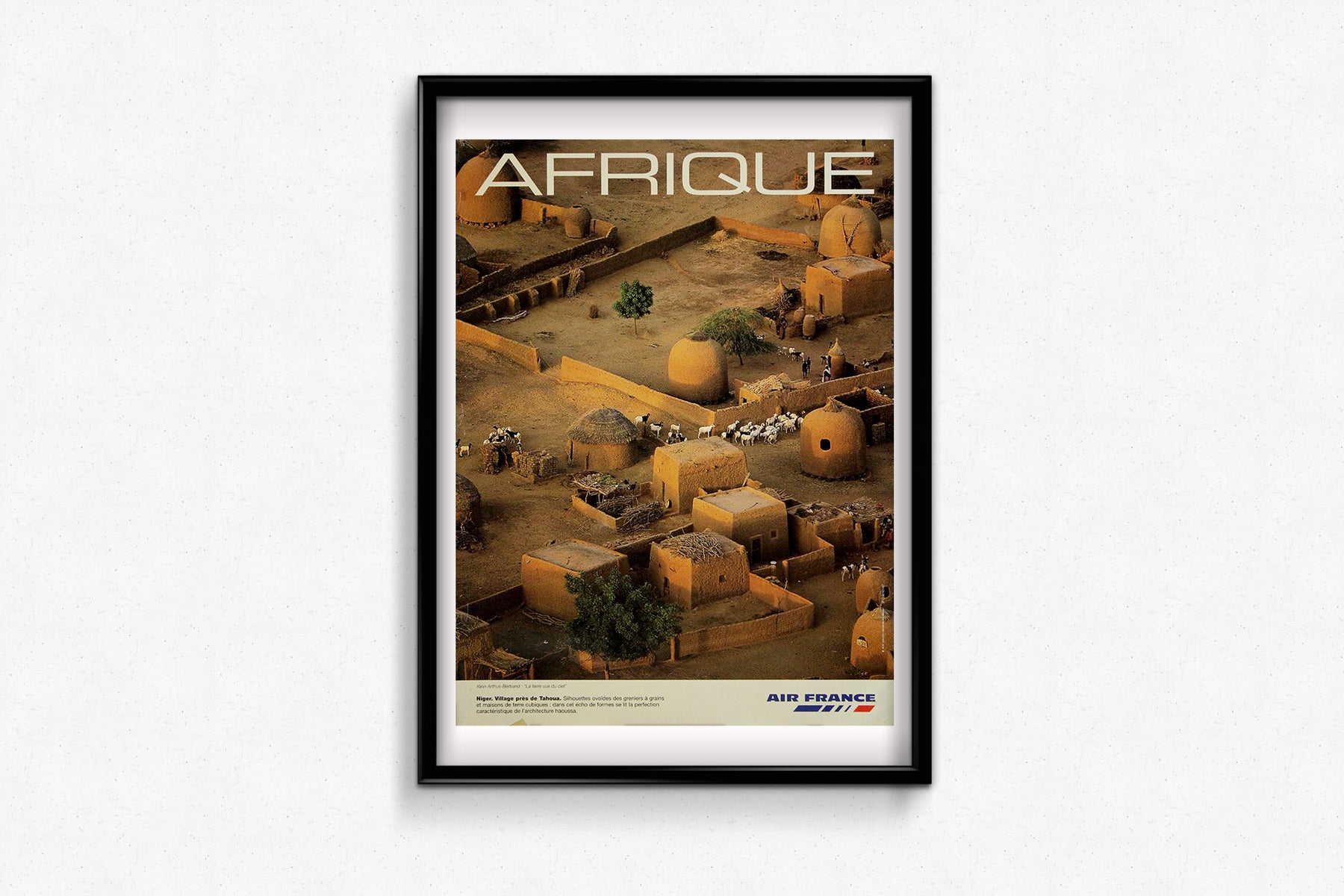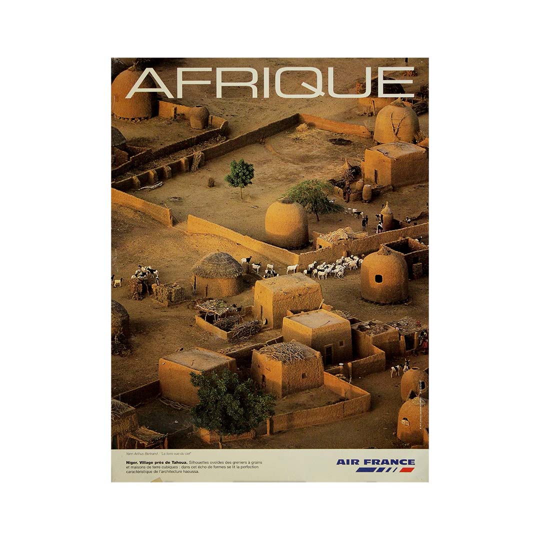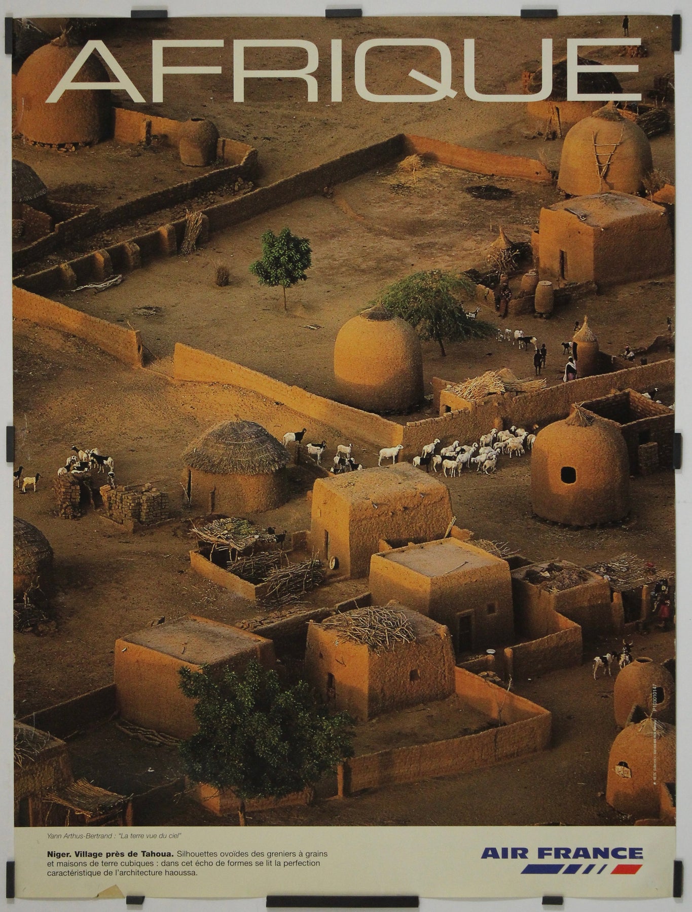 Cette affiche originale d'Air France, datant d'environ 2000 et réalisée par le célèbre photographe aérien Yann Arthus-Bertrand, offre une vue imprenable sur un village traditionnel Haoussa près de Tahoua, au Niger. Publiée à une époque où la compagnie aérienne promouvait activement la sensibilisation culturelle mondiale et la beauté de l'environnement, cette image s'inscrit dans l'œuvre plus vaste d'Arthus-Bertrand, consacrée à l'environnement et à la géographie.