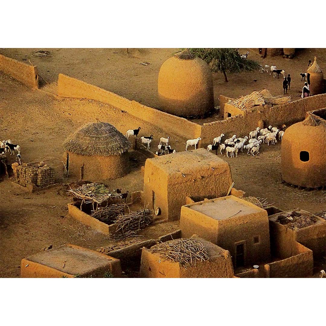 Vu du ciel, le village est une mosaïque harmonieuse de maisons ocre baignées de soleil, de greniers à dôme et d'enclos pour animaux, le tout dans des tons terreux qui se fondent parfaitement dans le paysage sahélien environnant. Quelques bosquets d'arbres d'un vert éclatant ponctuent le terrain aride, tandis que chèvres et vaches déambulent dans d'étroits passages – la vie en mouvement, figée dans l'immobilité.