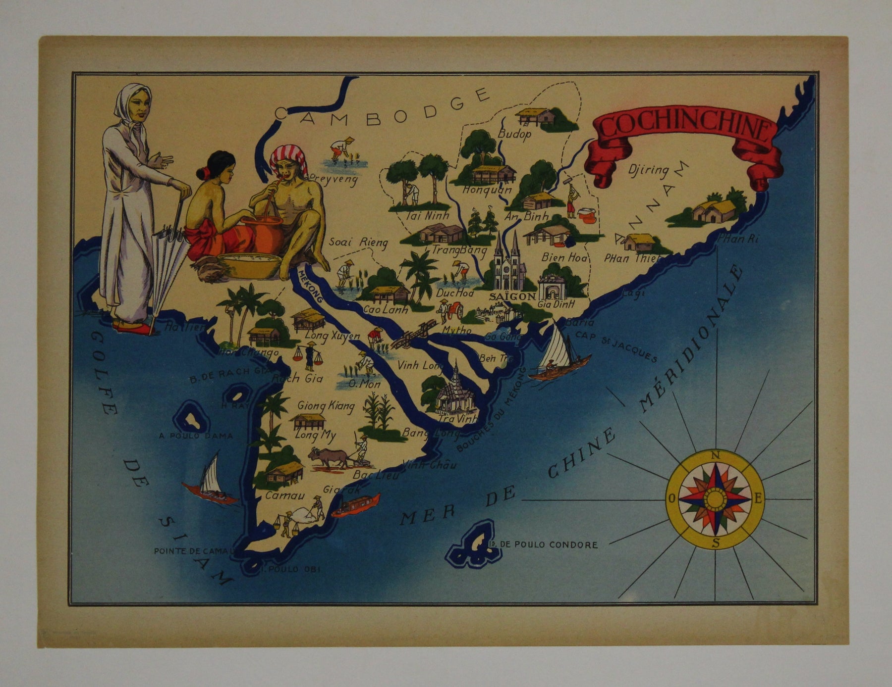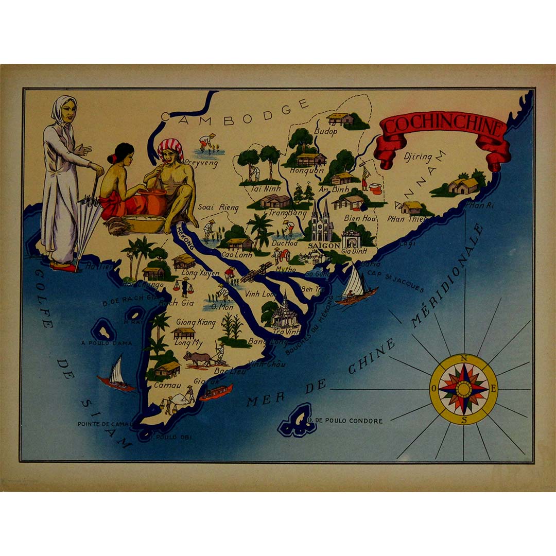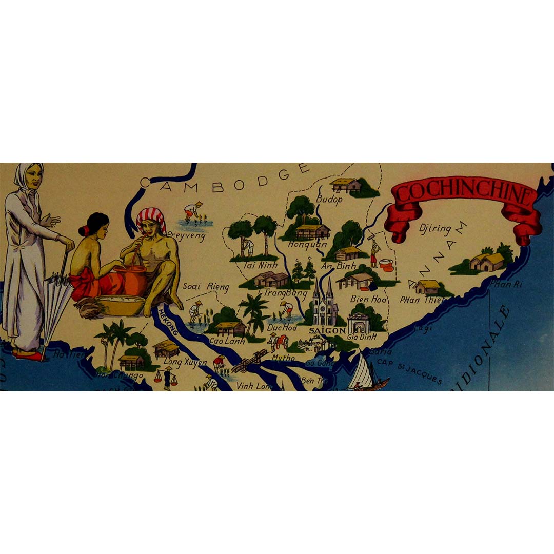 La Cochinchine, dont la capitale était Saïgon (aujourd'hui Hô Chi Minh-Ville), était une région clé sous domination coloniale française, caractérisée par son delta fertile du Mékong, ses rizières et sa diversité culturelle. La carte illustrée de Dylbert est un hommage artistique à la géographie, à l'histoire et à la culture de la région. Elle a été réalisée à une époque où les cartes remplissaient souvent une double fonction : celle d'outils pratiques et celle de représentations vivantes des territoires qu'elles représentaient.