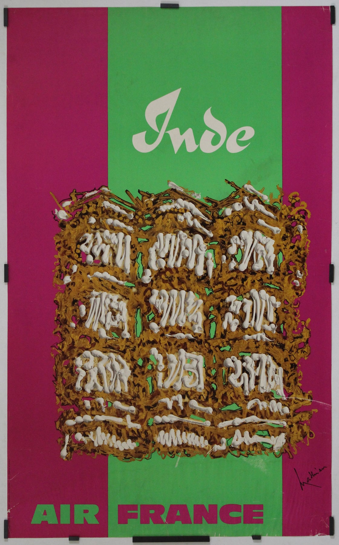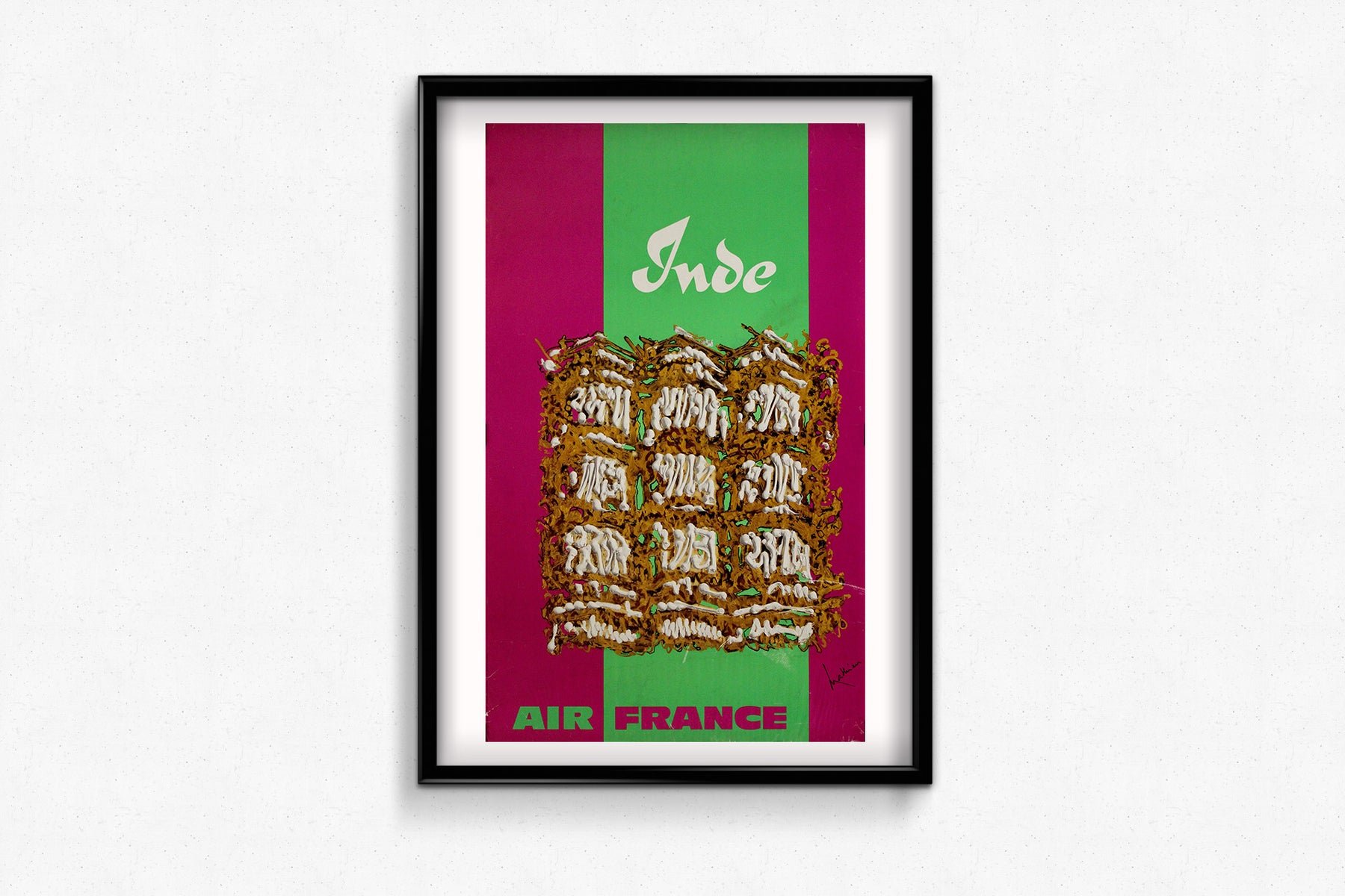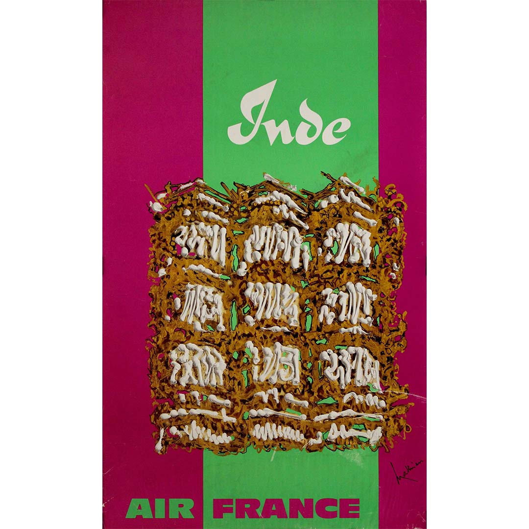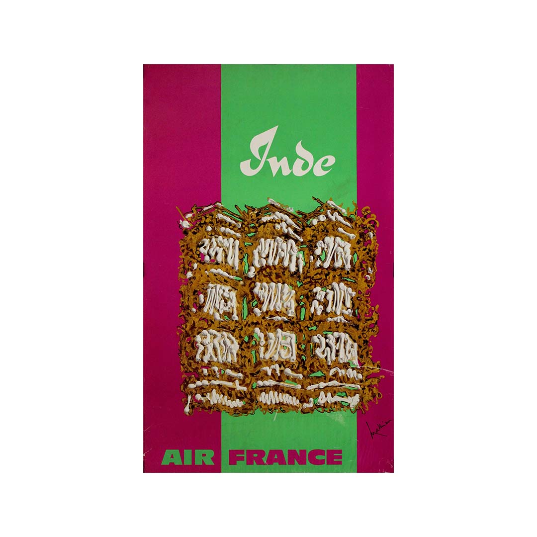 La composition présente une représentation abstraite et texturée d'un motif architectural indien, probablement inspirée par des sculptures sur bois finement travaillées ou des façades de temples. Les chaudes teintes brun doré contrastent avec le fond magenta et vert éclatant, évoquant l'énergie dynamique et la palette vibrante souvent associées à l'art et aux textiles indiens. L'utilisation d'une typographie stylisée et audacieuse pour « Inde » et « Air France » renforce le caractère à la fois moderne et intemporel de l'affiche.