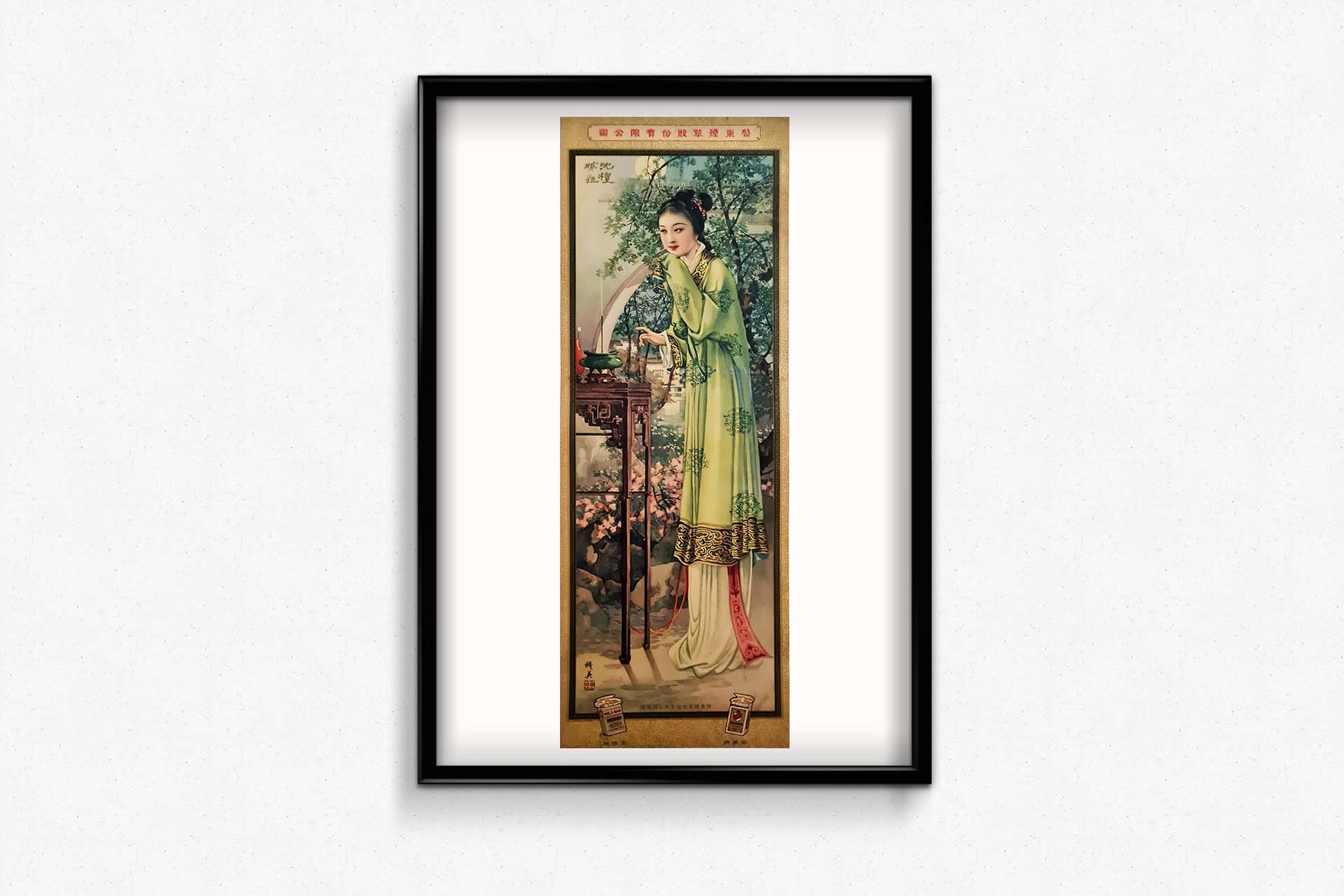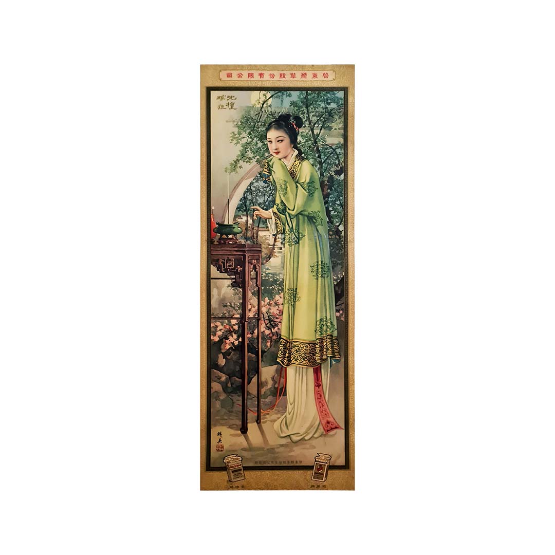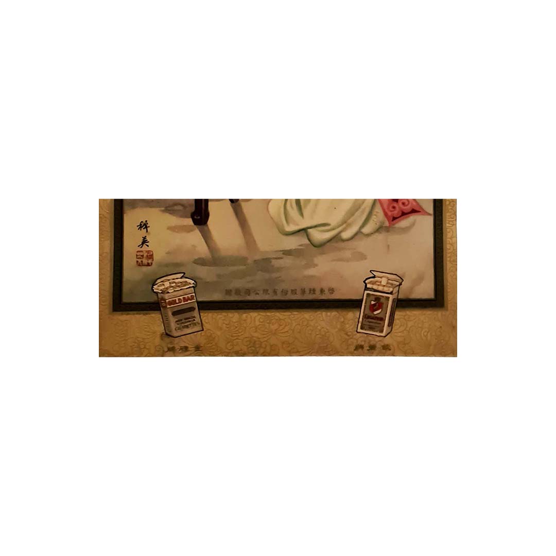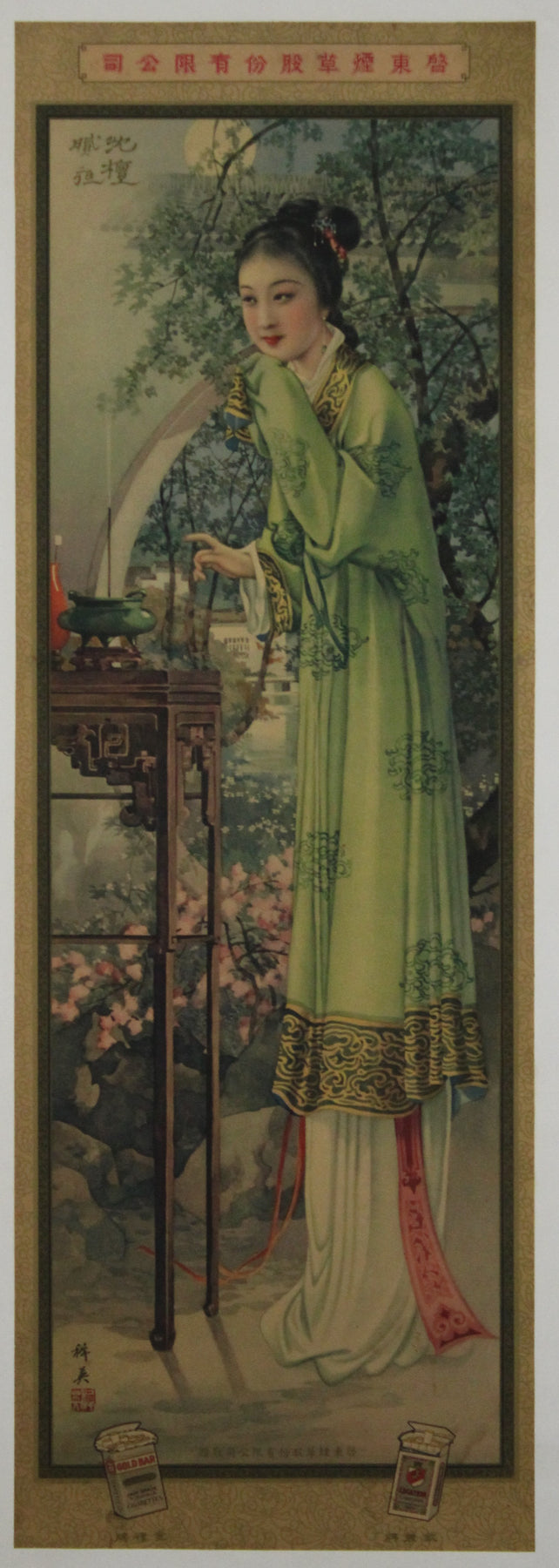Belle affiche publicitaire chinoise du début du XXe siècle. On y voit une jeune et élégante Chinoise et, en bas, deux paquets de cigarettes : Goldbar & Legation.