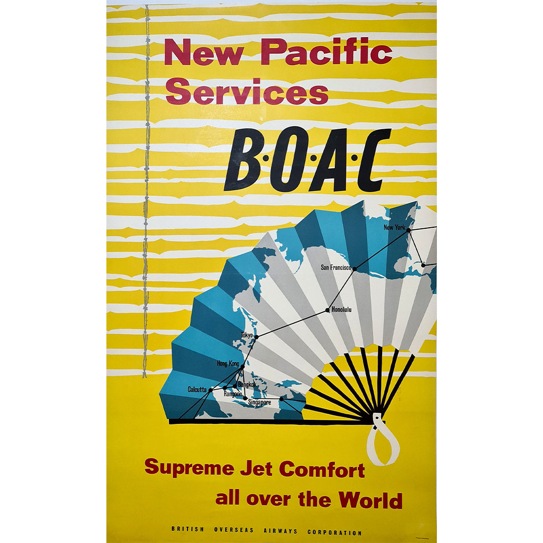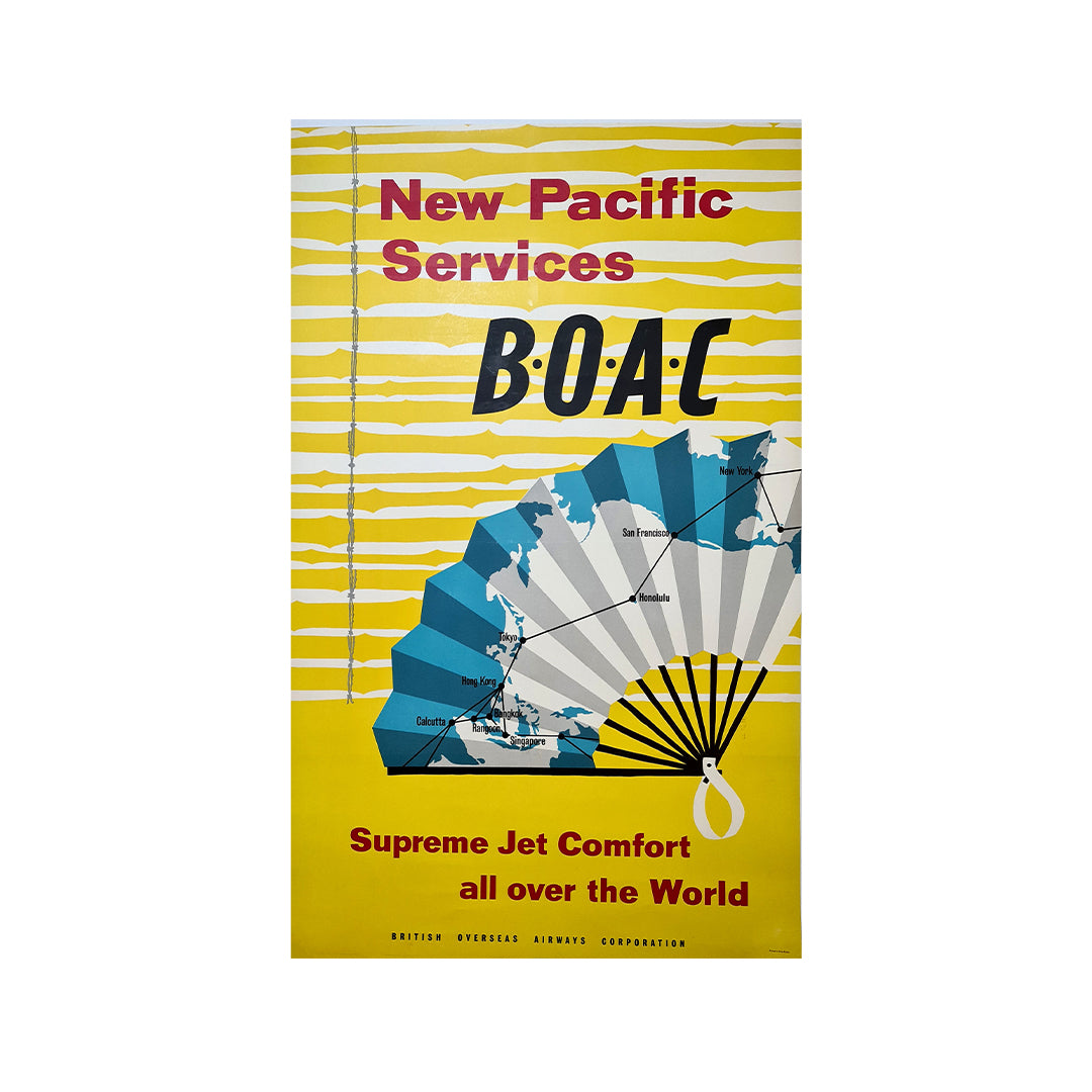 Affiche originale réalisée en 1958 et présentant les différents vols de la compagnie BOAC (British Overseas Airways Corporation).