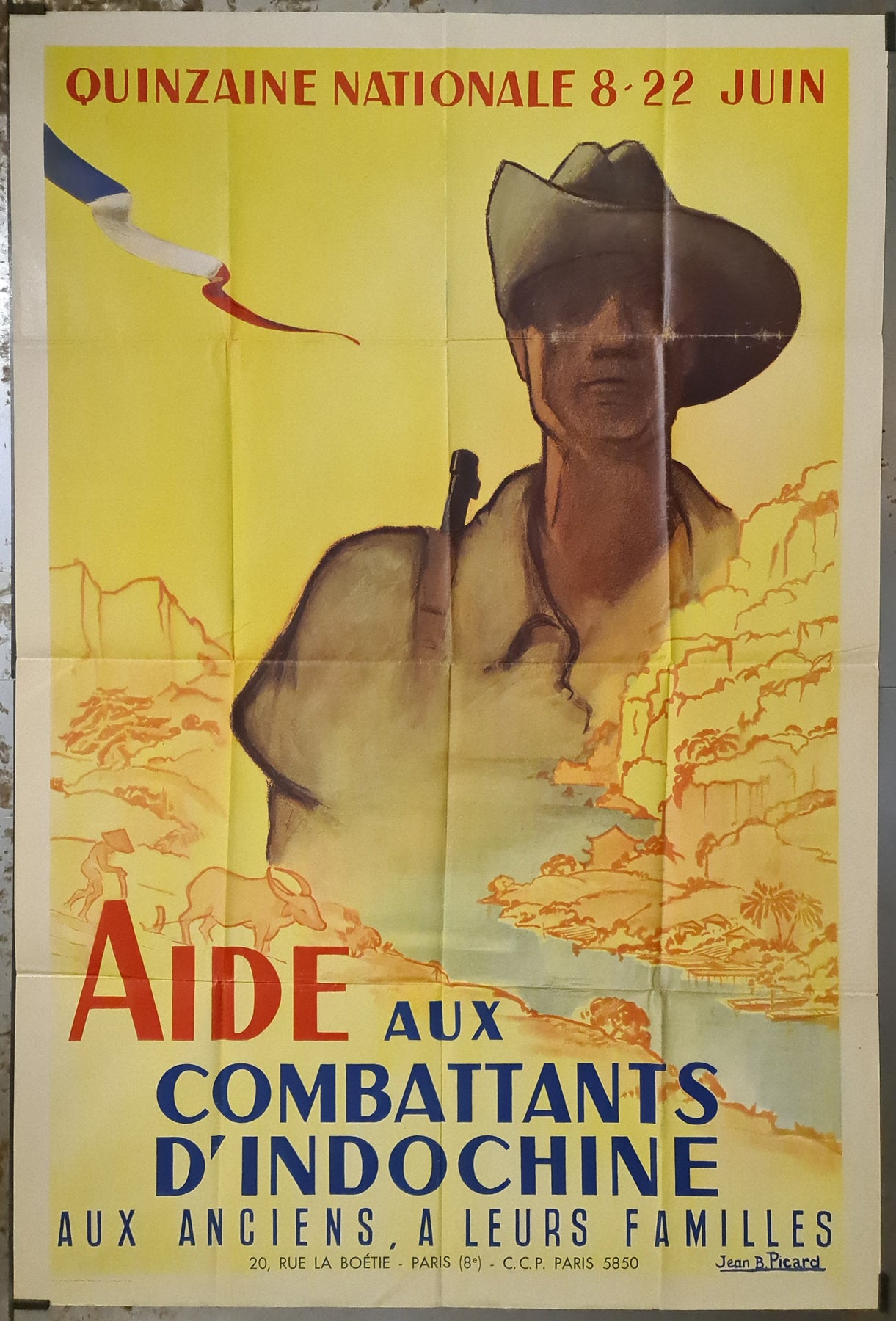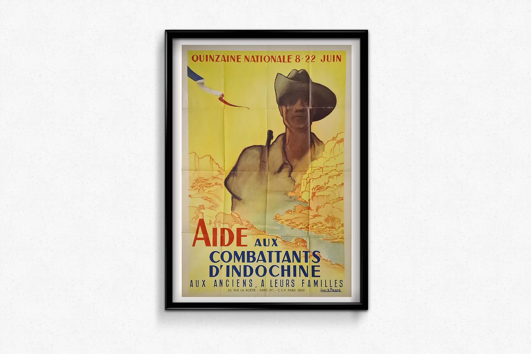 L'affiche de Jean B. Picard rappelle le courage des vétérans et lance un appel à l'action, encourageant le soutien à ceux qui ont servi en Indochine. Elle est une représentation visuelle de la solidarité et un hommage aux sacrifices consentis au nom du devoir.