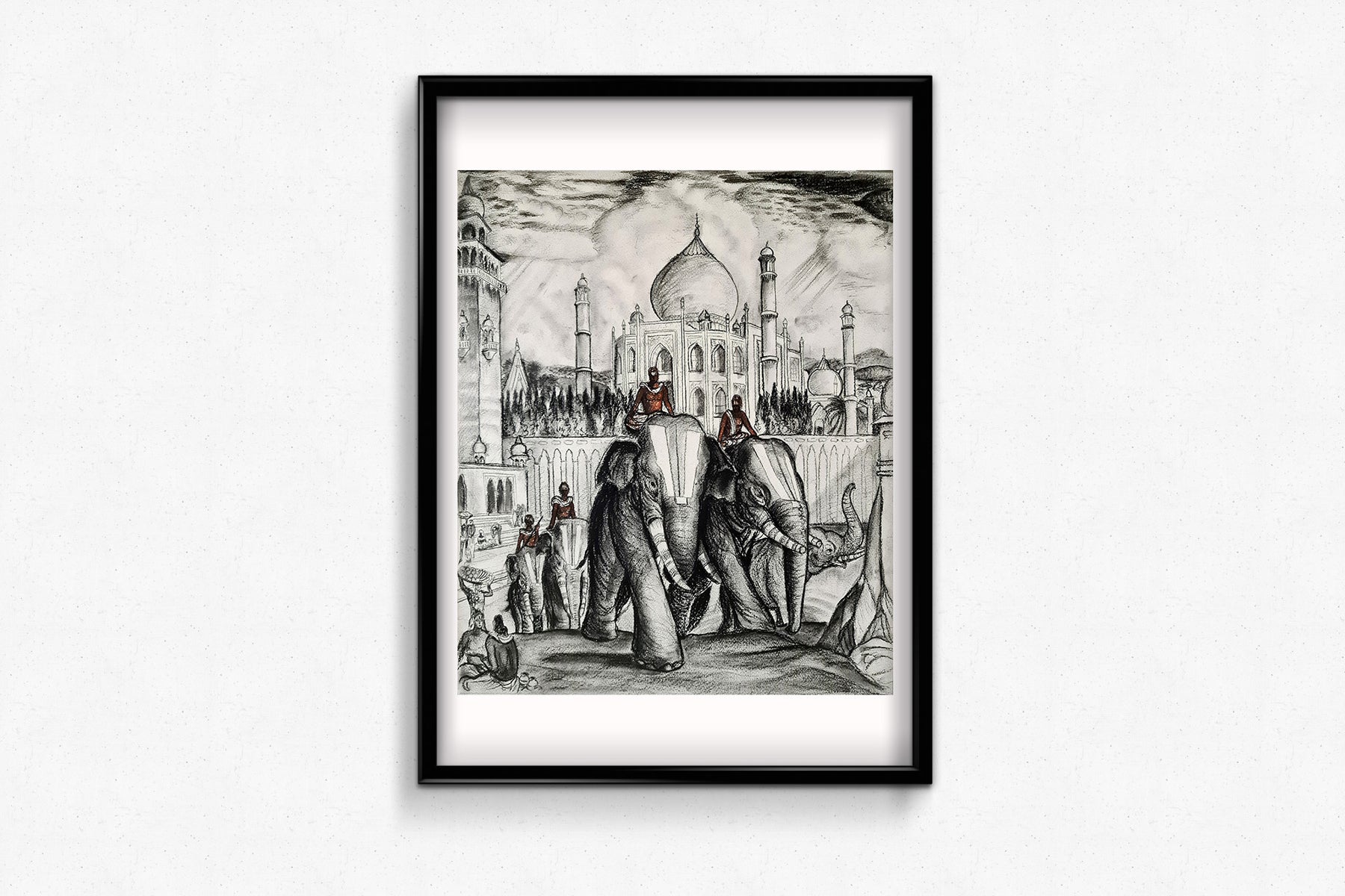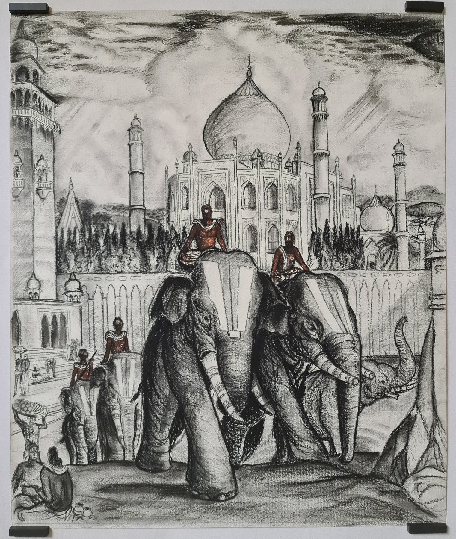 Exécuté au fusain avec une expressivité teintée de délicates touches de couleur, ce dessin reflète à la fois une fascination pour l'exotisme et une volonté respectueuse de saisir l'atmosphère du sous-continent indien. Les dômes et les minarets du Taj Mahal se dressent à l'arrière-plan, offrant un puissant contrepoint architectural à la masse organique des éléphants au premier plan.