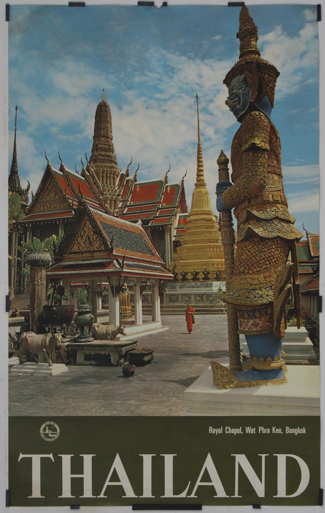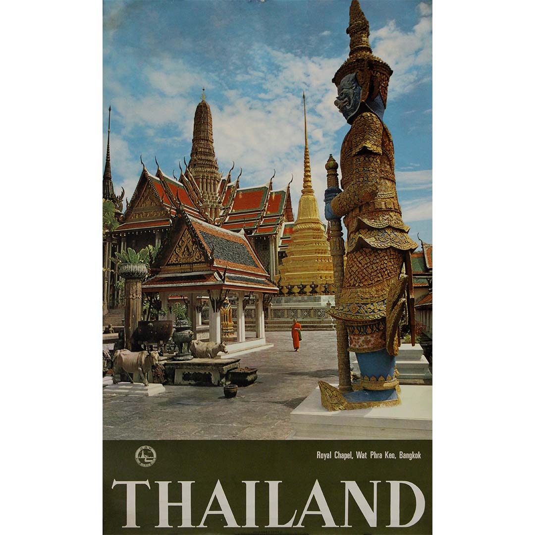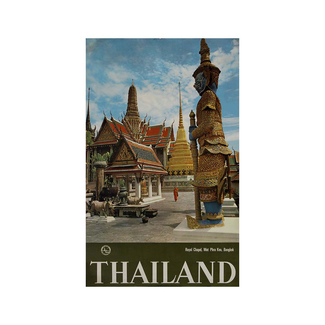Cette superbe affiche de voyage vintage, datant des années 1950, met en valeur l'un des monuments les plus emblématiques de Thaïlande : la chapelle royale du Wat Phra Keo (également orthographié Wat Phra Kaew ), nichée au cœur du Grand Palais de Bangkok. Véritable ode à l'architecture thaïlandaise et à la grandeur spirituelle de ce lieu, l'image capture au premier plan la statue du yaksha, démon gardien richement orné, faisant face aux stupas et aux toits de temples dorés et resplendissants qui caractérisent ce site sacré.