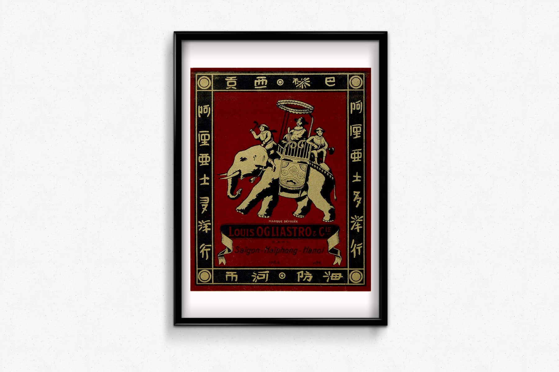 L'affiche originale de Louis Ogliastro & Cie, datant des années 1930, offre un témoignage saisissant du commerce colonial en Asie du Sud-Est, notamment dans des régions comme Saigon (aujourd'hui Hô-Chi-Minh-Ville), Haiphong et Hanoï. Ce document publicitaire servait probablement à promouvoir les activités de l'entreprise, axées sur le commerce et la distribution de marchandises en Indochine française.