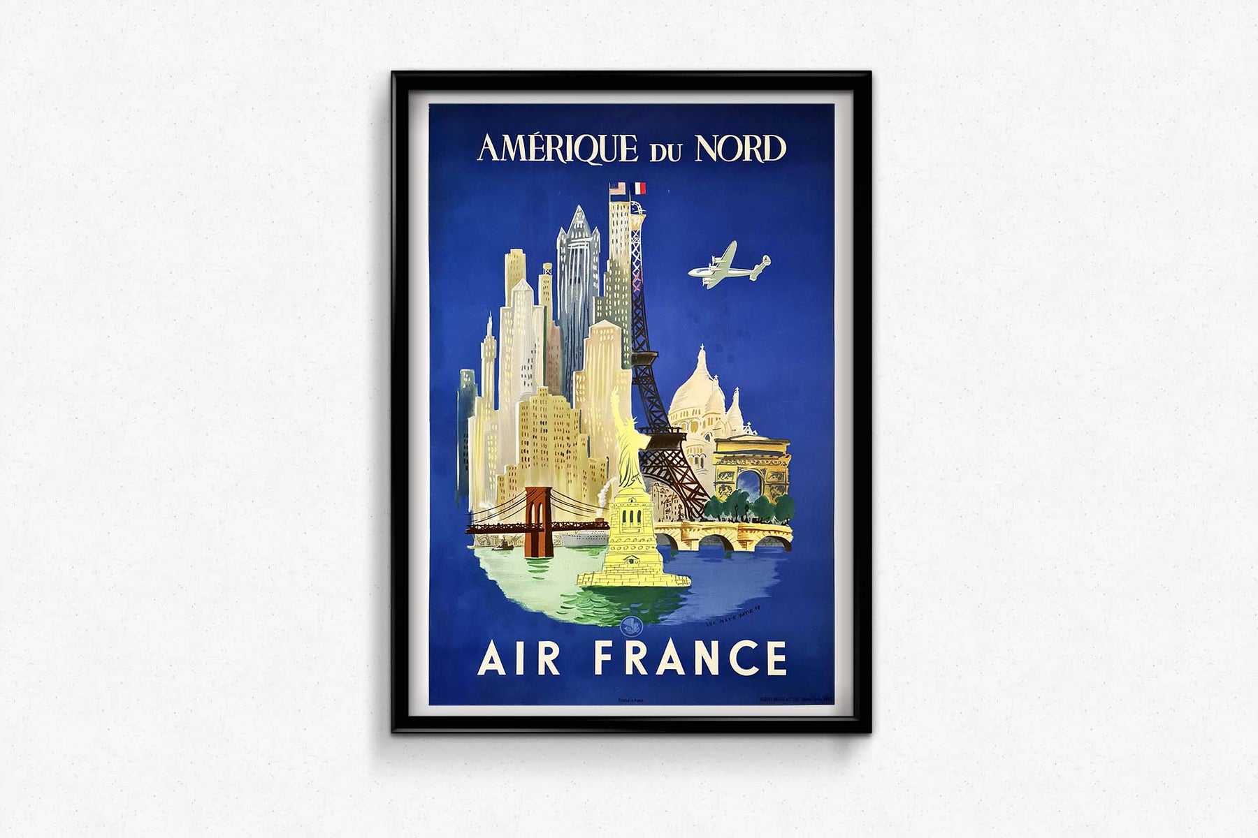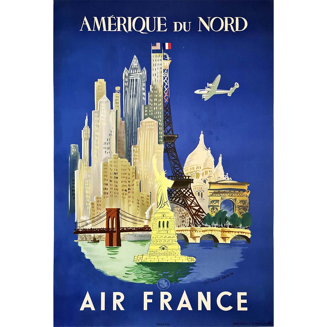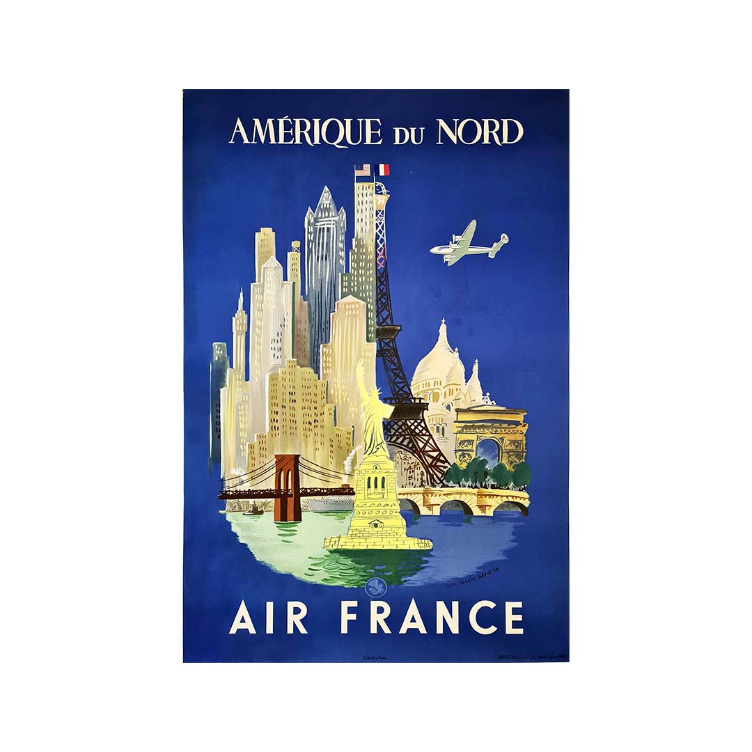Affiche publicitaire pour la promotion des vols d'Air France vers l'Amérique du Nord, signée dans le coin inférieur droit par le célèbre peintre, officier de marine et illustrateur Luc Marie BAYLE (1914-2000).