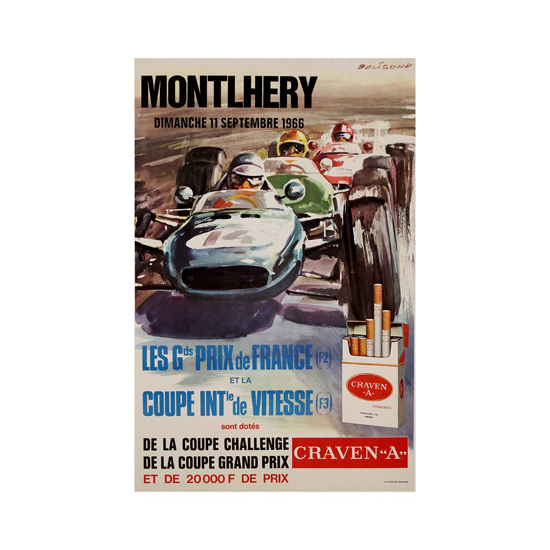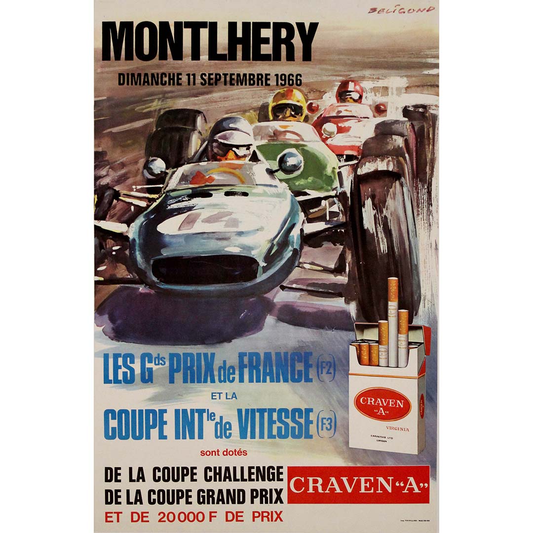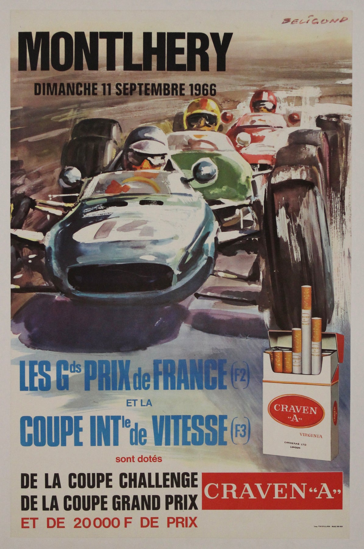 Cette affiche originale de 1966, conçue par Beligond, fait la promotion des Grands Prix de France (F2) et de la Coupe Internationale de Vitesse (F3), qui se sont déroulés sur le légendaire circuit de Linas-Montlhéry le dimanche 11 septembre 1966. Véritable témoignage de l'âge d'or de la Formule 1, cette œuvre d'art incarne la vitesse brute et la compétition féroce du sport automobile du milieu des années 1960.