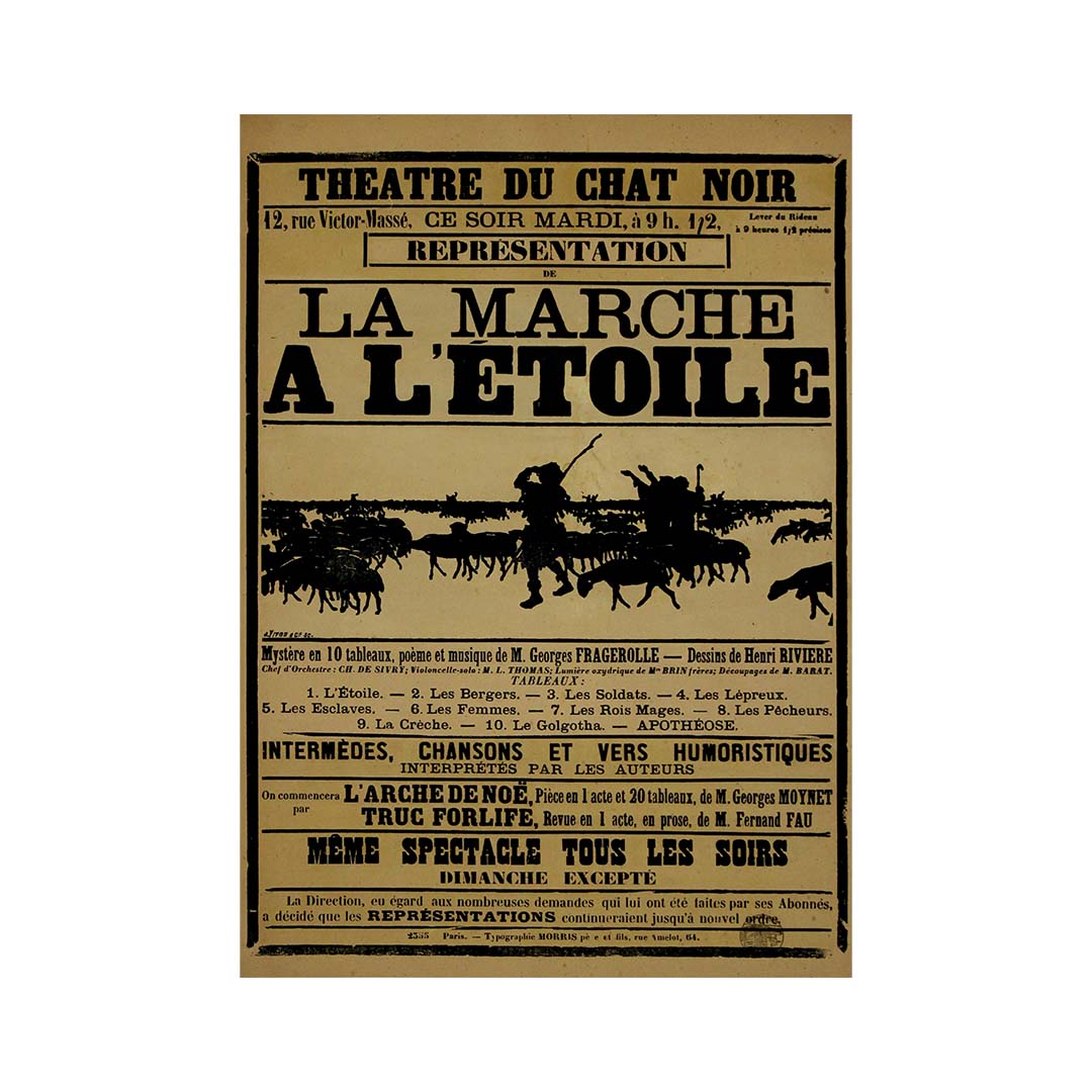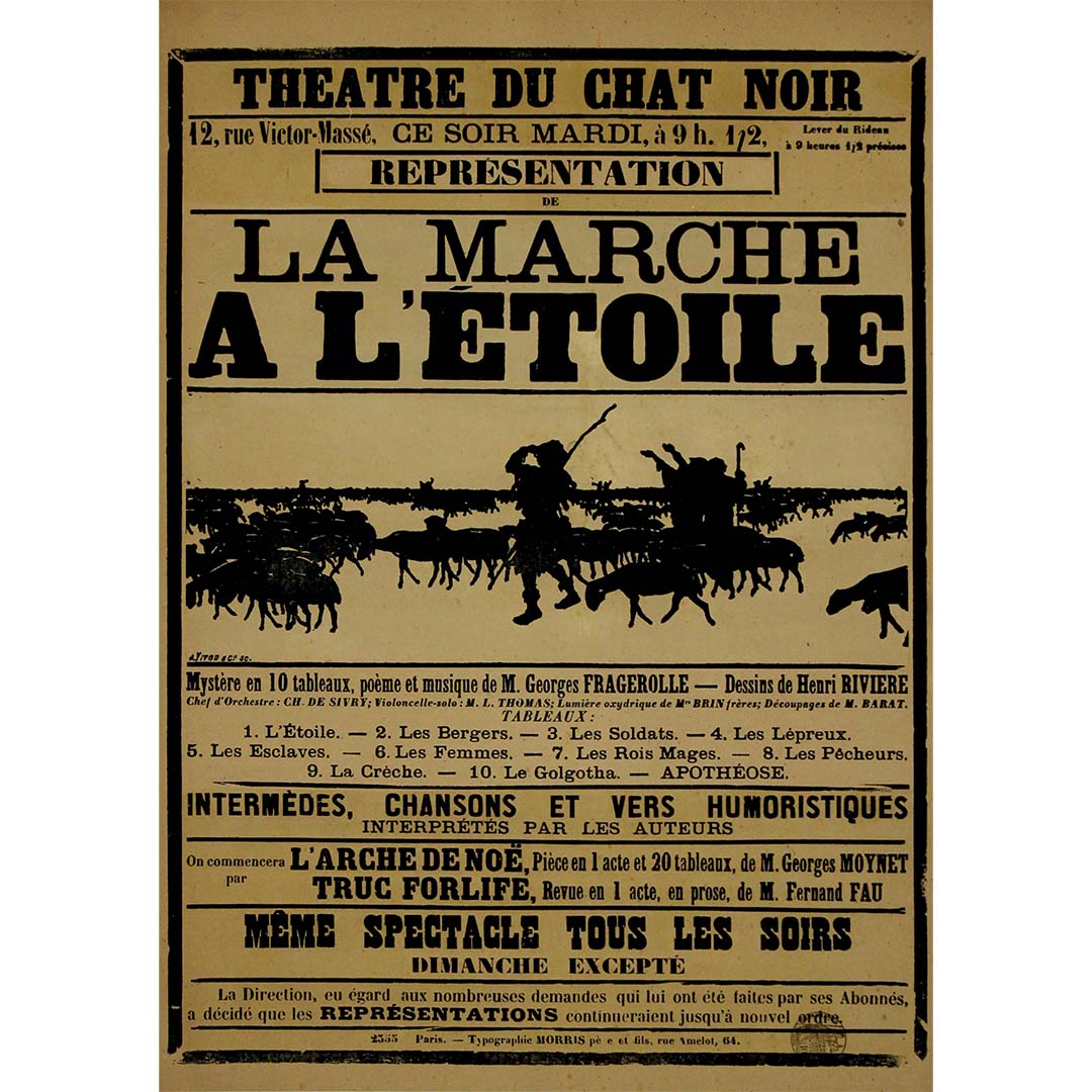 Cette rare affiche datant d'environ 1895 capture l'énergie mystique de La Marche à l'Étoile , l'un des célèbres spectacles d'ombres donnés au légendaire Théâtre du Chat Noir à Paris. Conçue par Henri Rivière — réputé pour son art de la silhouette — et illustrée de musique et de poèmes de Georges Fragerolle, l'affiche est à la fois une œuvre d'art et un document historique témoignant de l'esprit d'avant-garde de Montmartre à la fin du XIXe siècle.
