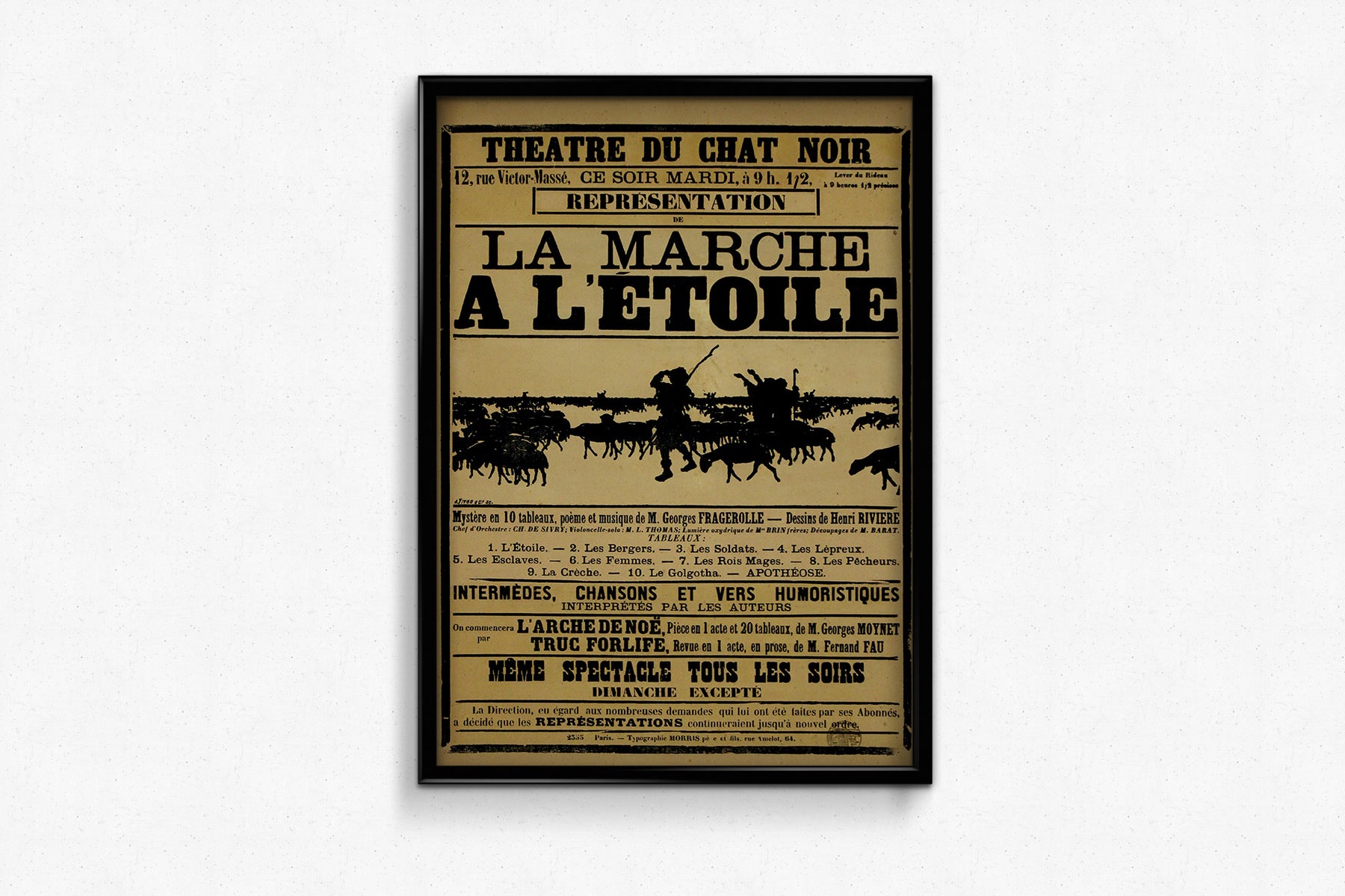 La silhouette noire et dépouillée de voyageurs et de bergers sous le ciel nocturne évoque la Nativité à travers dix tableaux poétiques, mêlant imagerie religieuse et style visuel onirique qui a fait la renommée des productions de Chat Noir. La maîtrise du jeu d'ombres de Rivière transparaît clairement dans la conception : les silhouettes s'harmonisent avec la typographie audacieuse, conférant une impression de mouvement et de solennité, tandis que le texte dense traduit la richesse du programme de la soirée.