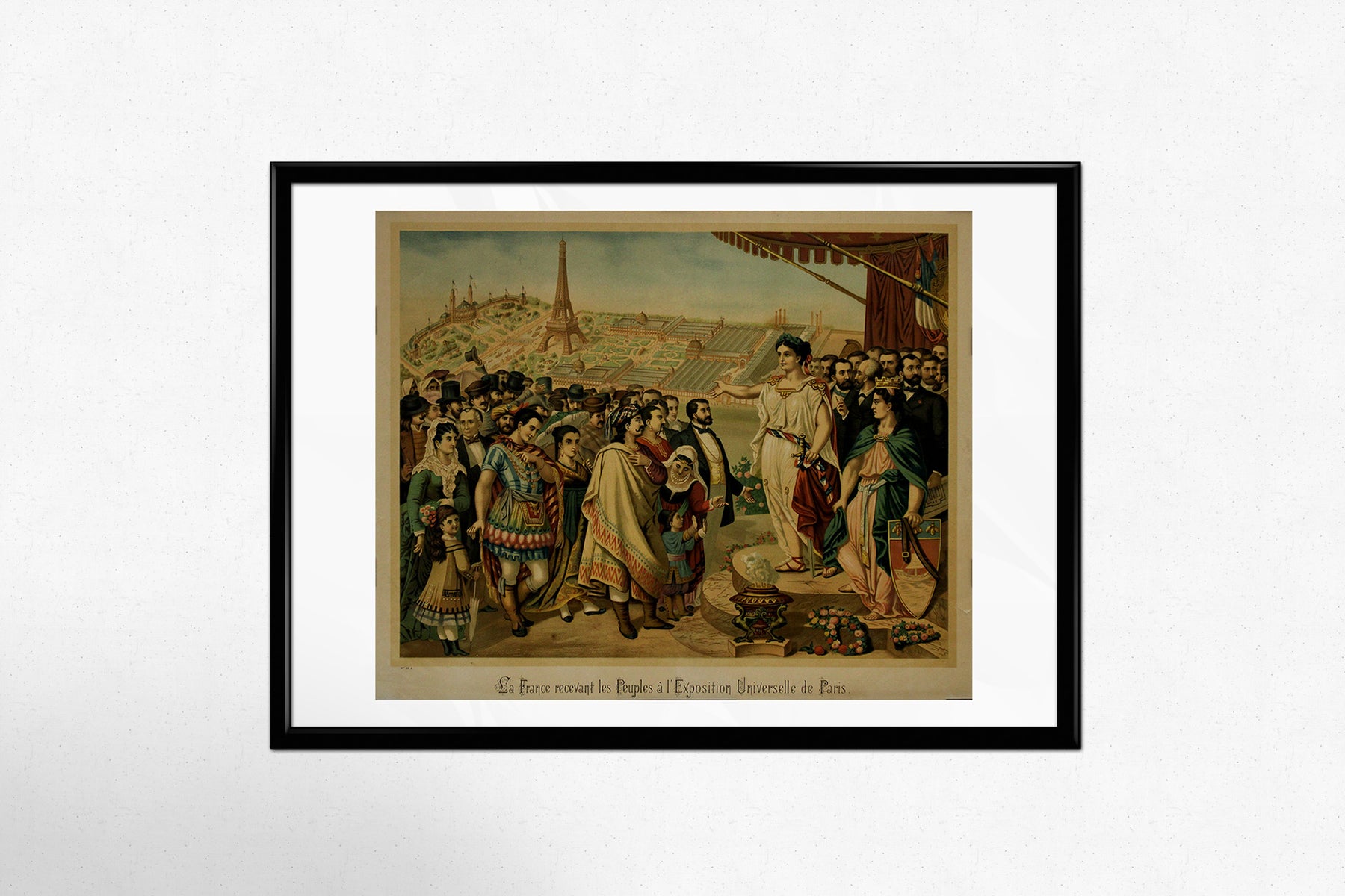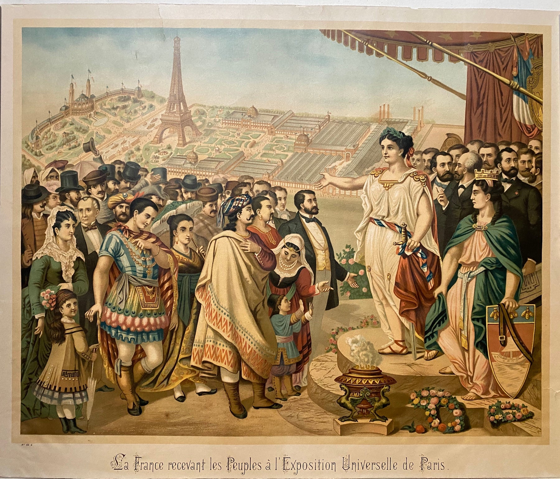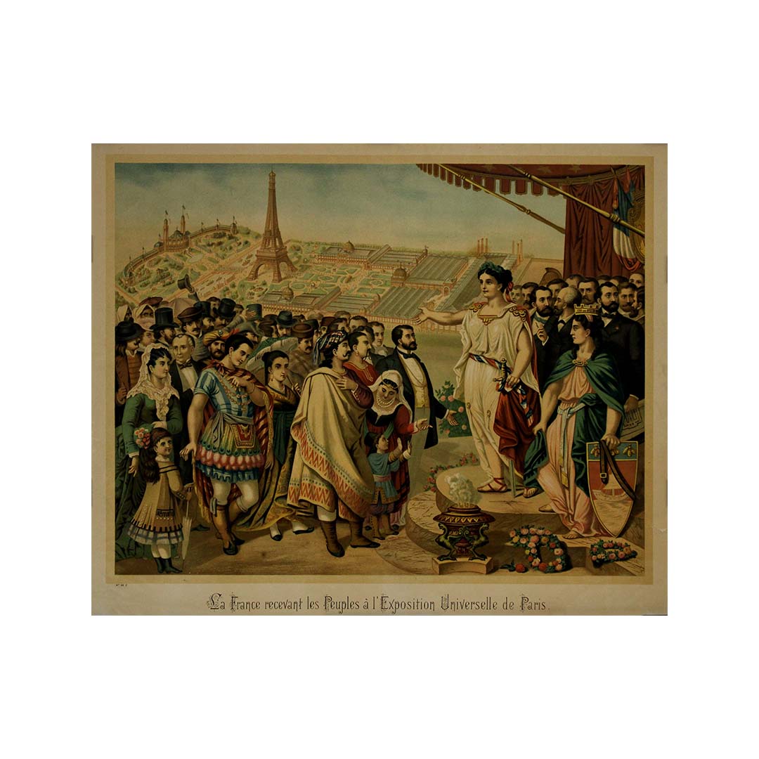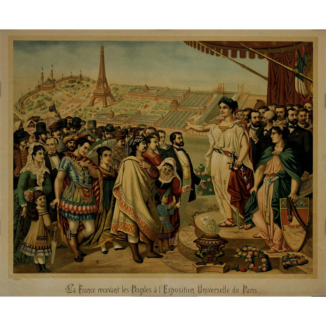 Au centre de la composition se dresse une personnification de la France, vêtue de robes classiques, la main tendue en signe de bienvenue aux représentants du monde entier – un cortège richement costumé comprenant des figures symbolisant diverses cultures, ethnies et nations. Leurs costumes chatoyants soulignent l'esprit de coopération internationale et d'échange culturel qui a caractérisé l'Exposition universelle de 1889.