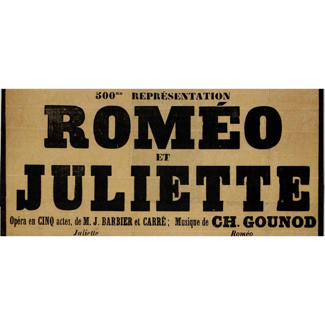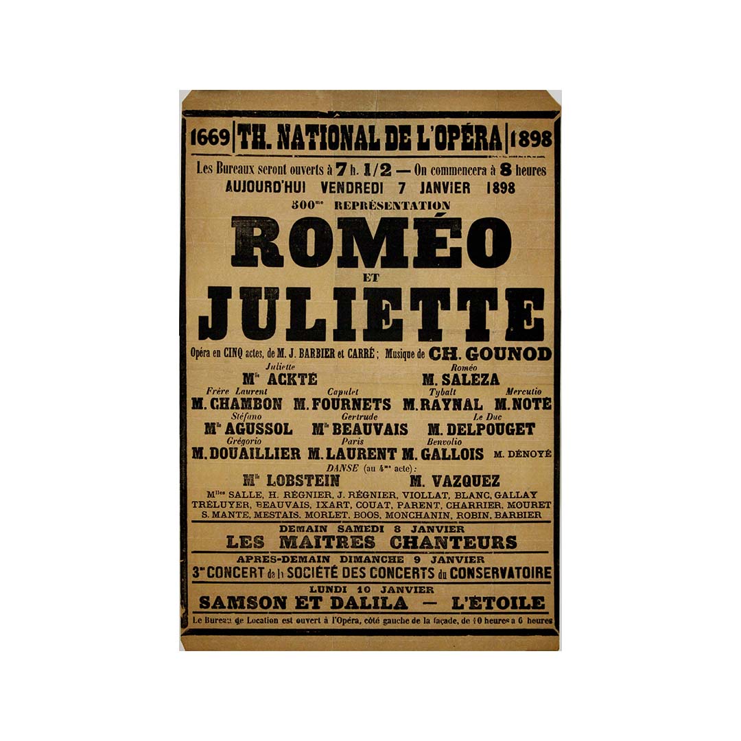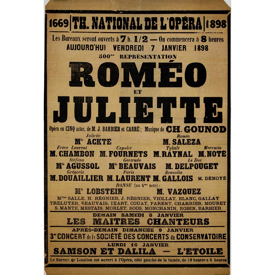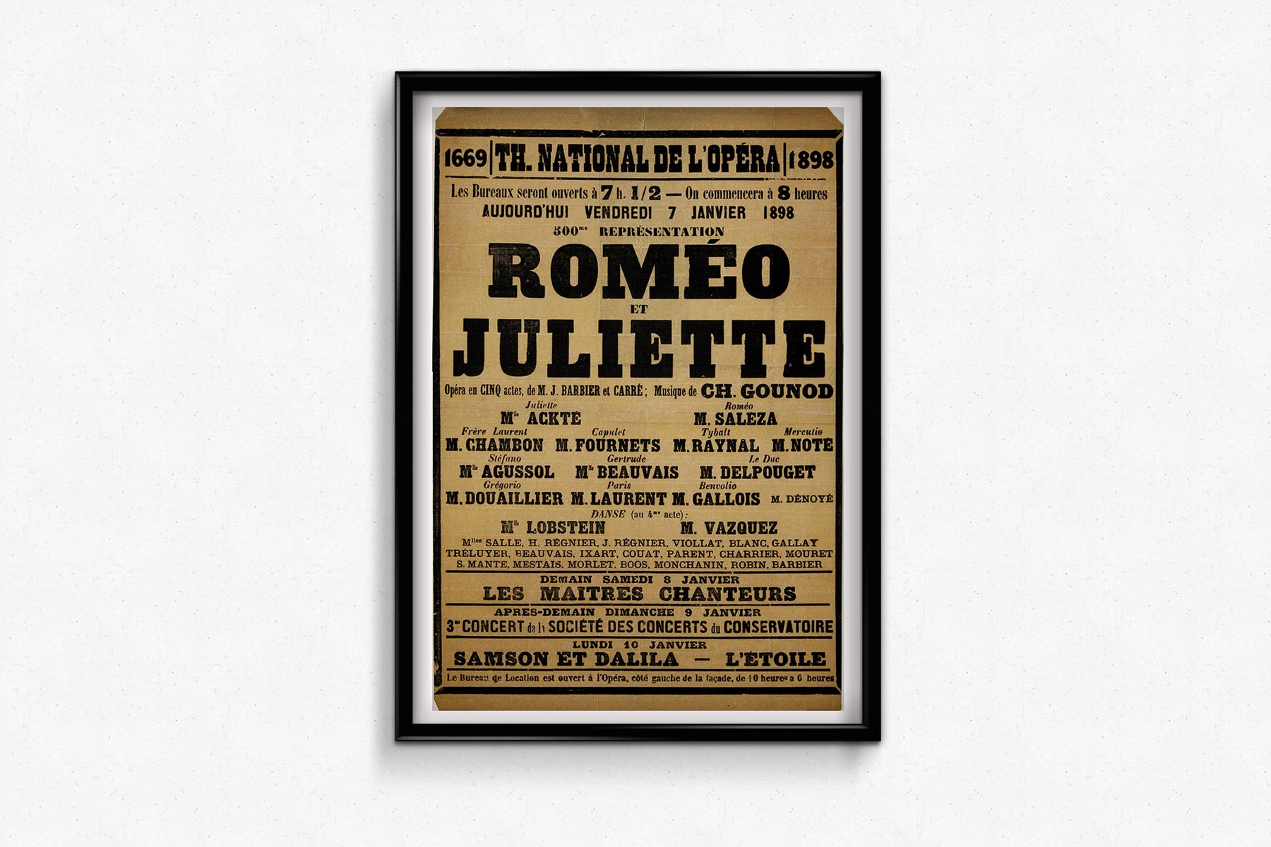 Cette exquise affiche Art nouveau de 1898 célèbre la 500e représentation de Roméo et Juliette au prestigieux Théâtre National de l'Opéra de Paris. Événement marquant pour l'opéra tant aimé de Charles Gounod, cette œuvre incarne le romantisme, l'élégance et la grandeur théâtrale de la fin du XIXe siècle.